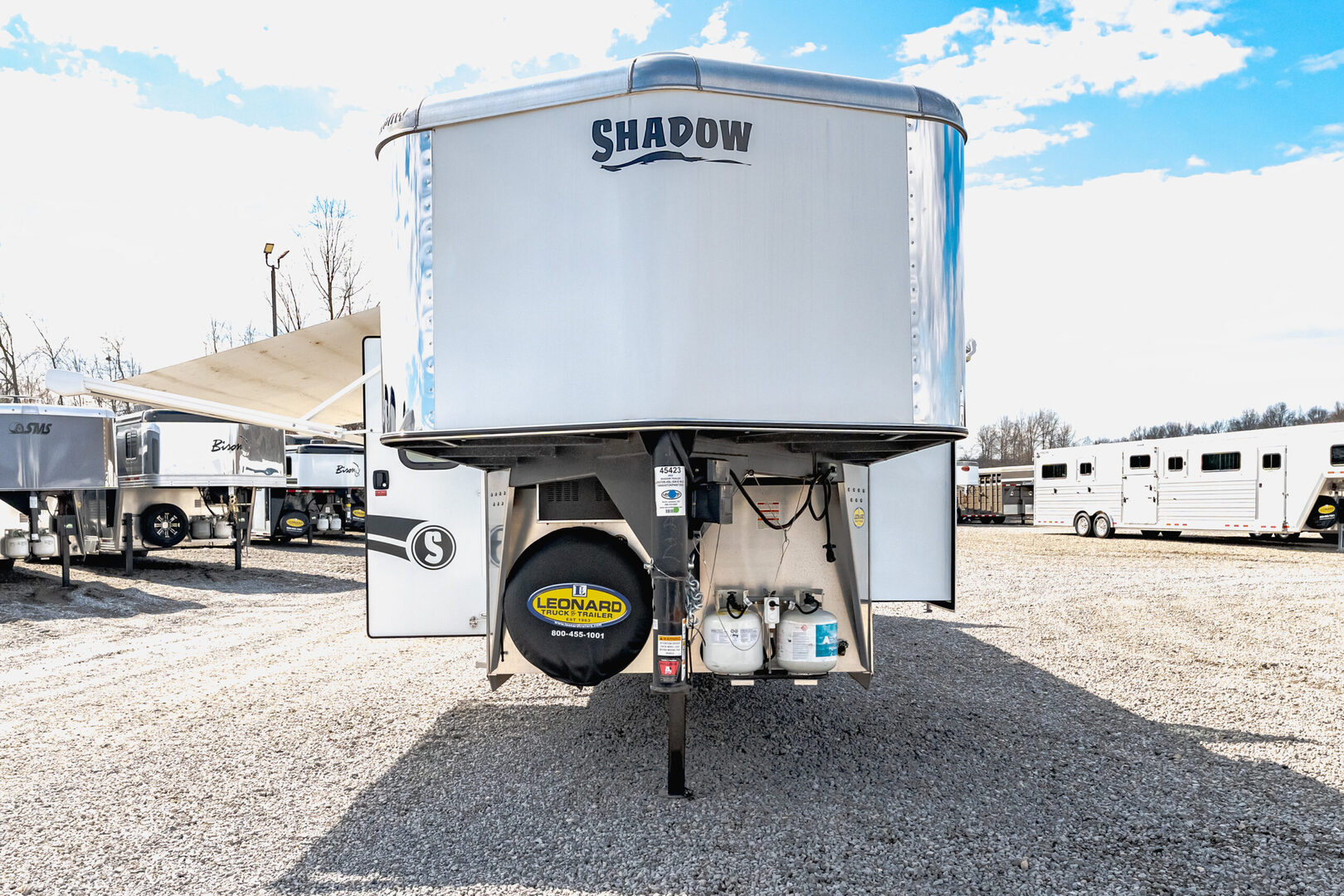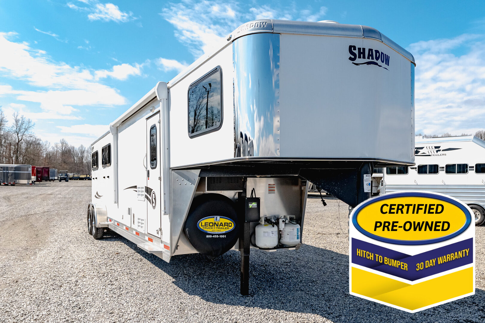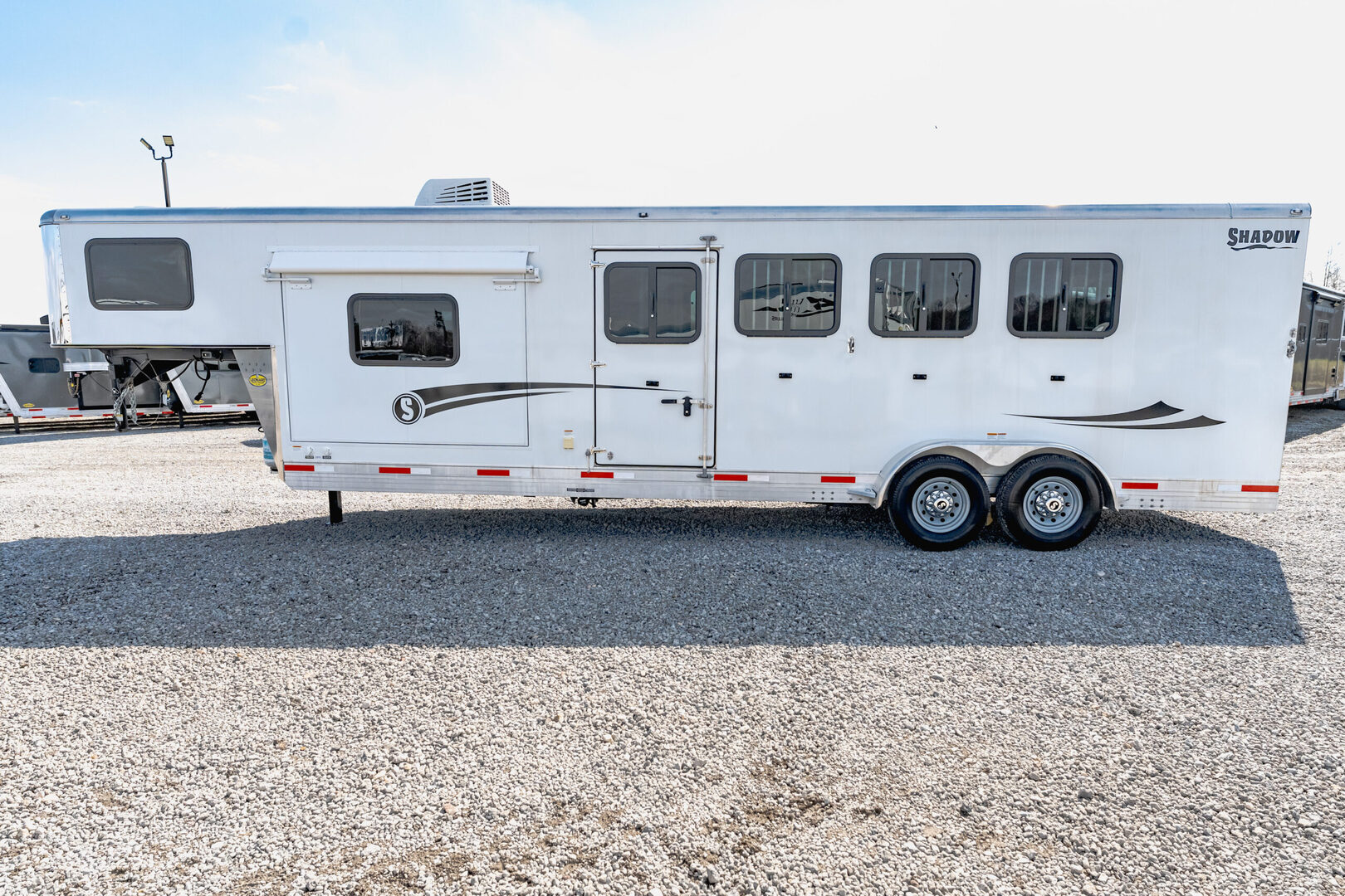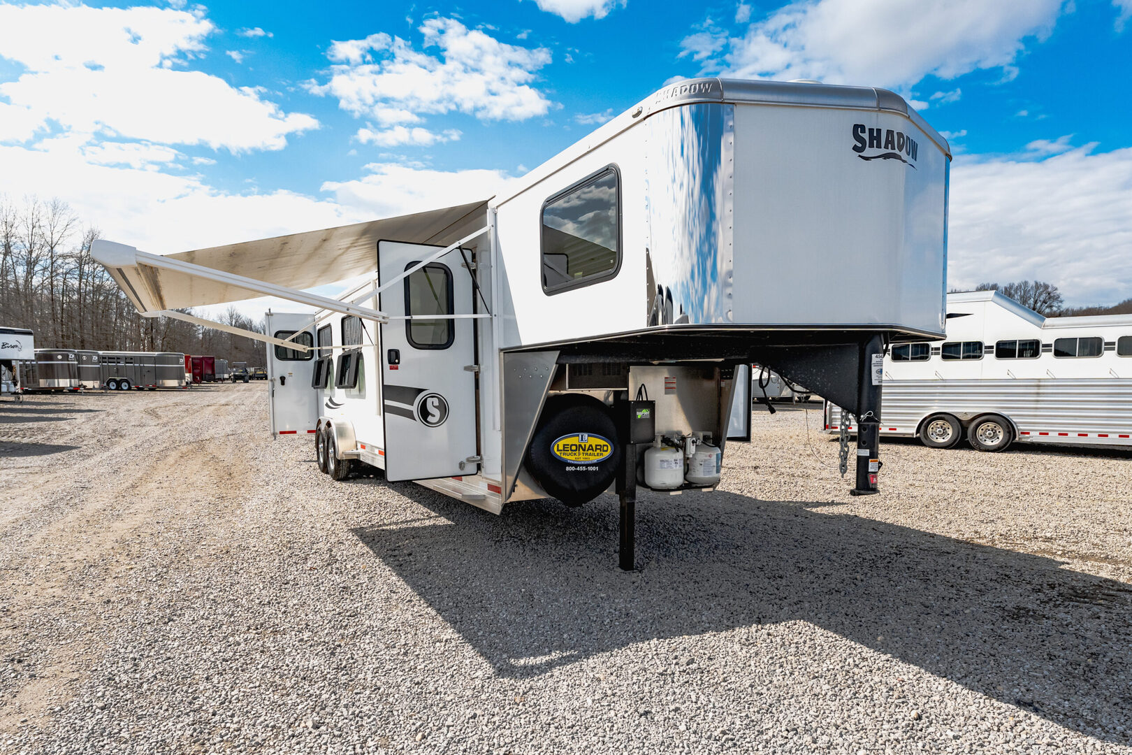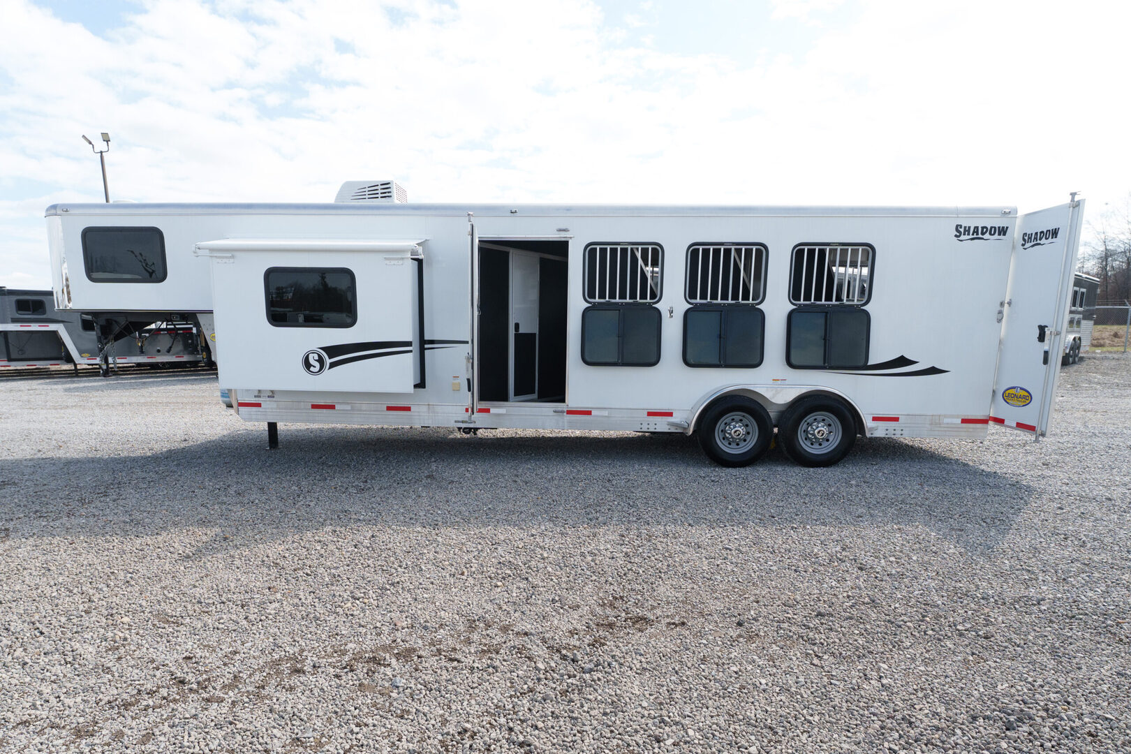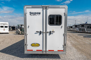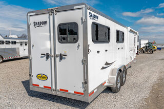 View Inventory: https://leonardtrailers.com/inventory/45423 Stock# 45423 Used 2023 Shadow Gooseneck 4 Horse Trailer with Living Quarters General Information Model: 69270S-4SL-GN  Exterior: XT / SS  Construction: Aluminum  General Specs Coupler Size: 2 5/16”  Adjustable Coupler: Yes  Roof: Aluminum  Primary Color: White  Stripe Color: Red  Length: 27’  Width: 7’ Height: 6’6” Horse / Type Type:Slant  Living Quarters Living Quarters Size: 9’ Awning Size: 16’ Living Quarters Options  Air Conditioning Ducted  Heat Strip / Furnace Ducted  Generator Sofa / Dinette Sink / Kitchen Stove / Refrigerator  Microwave / Oven Sink in Bath Toilet / Shower Slide Out Size: 4’ Horse Area Options  Mats / Pads Vents / Lights Hayrack Rubber Lining Complete Escape Type 1 Full Walk Out  Tack Area Type:Rear Collapsible  Door / Gate Double Rear Doors  Other / Mechanical GVW: 14,540 Axle Size: 7,000 Tire Size: 235/80R16  # of Brakes: 4 Breakaway: Yes Jacks: Single Jack Type: Hydraulic Ride Type: Spring  Brake Type: Electric  We offer outstanding financing options, accept trades, and can arrange nationwide NO HASSLE delivery! Inquire today for more information! (888) 333-6613 **We believe these specifications to be accurate. Any discrepancies are unintentional. Please verify information with a sales associate prior to purchase.** Stock Number:45423