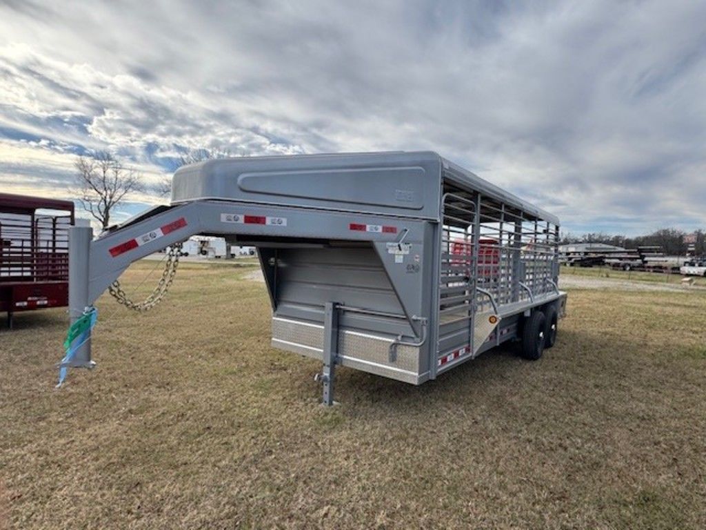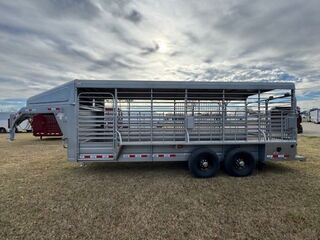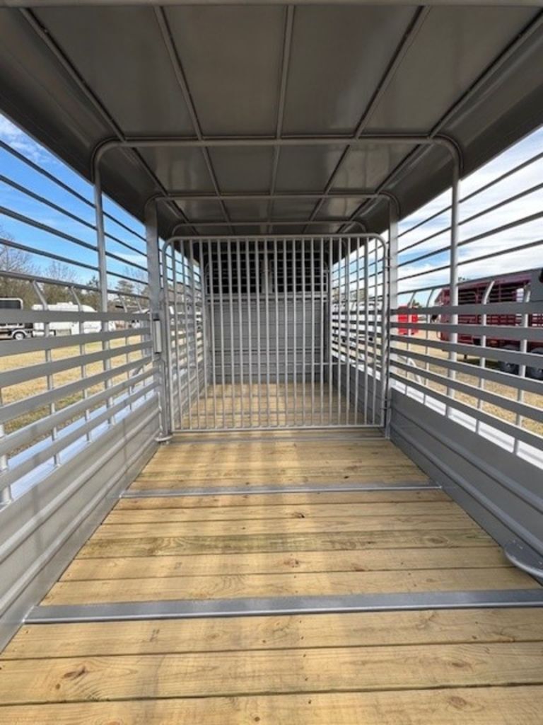 20’ STOCK GN METAL ROOF w/ NOSE 20’ FLOOR / 28’ OVERALL 6’8 WIDE / 6’6 TALL WOOD FLOOR TUBING SIDES SIDE ACCESS DOOR FULL SWING REAR GATE w/ SLIDER 7K TORSION AXLES 16” TIRES & SPARE BLACK WHEELS SILVER EMPTY = 5,060 GVWR = 14,000