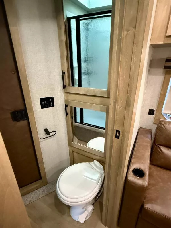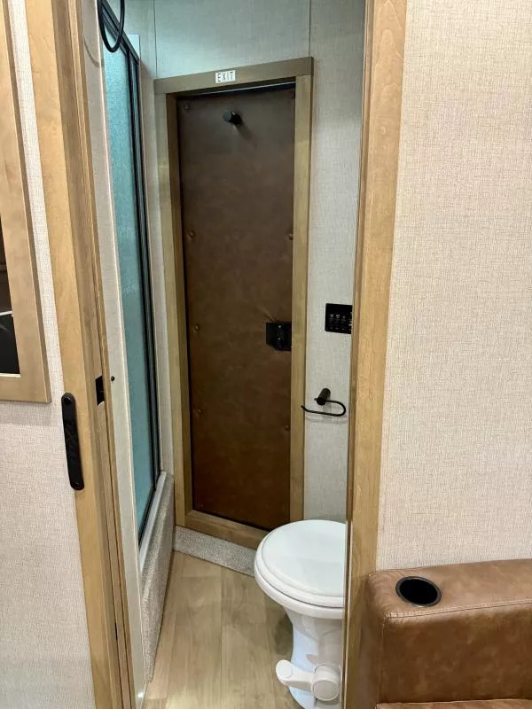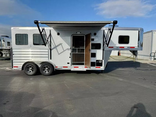 20263 Exiss 7206 Escape LQ - 2 Horse Slant Living Quarters Trailer with 6.5’ shortwall LQ * 7’ Wide, 7’8” Tall * All Aluminum Construction * (2) 5200# Torsion Axles with 4 Wheel Electric Brakes * 16” Radial Tires on Aluminum Wheels * LED Brake and Running Lights * Power Awning with LED Light Strip * Hydraulic Jack * LED Load Light above Rear Doors * Dual Propane Tanks * RV Battery in Locking Aluminum Box * Extruded Aluminum Slats Horse Area * White Aluminum Smooth Skin * Outside Water Spigot 6.5’ shortwall Exiss Interior Urban Saddle Interior features: * Camper Door, Screen Door, and Sliding Window * Snap on Window Privacy Cover * Fold Down Camper Step * Solid Wood Cabinets * Bluetooth Stereo with Inside and Outside Speakers * TV Antenna & Prep with Booster * Foam Plush Full Sized Mattress * Insulated Bunk Floor * LED Reading Lights in GN * Front Wardrobe Closets with Center includes USB Charger * Jacknife Sofa with Cup Holders * Sconce Lights * Large Mirror * Overhead Cabinets * 3 cu ft Refridgerator * 20,000 BTU Ducted Furnace * 13,500 BTU A/C with Heat Strip * Solid Surface Counter tops * Recessed 2 Burner Cooktop * Stainless Steel Convection Microwave * Sink in Kitchen with Pull Out Sprayer Faucet * Flip Up Counter Top Extension * Sliding Pocket Door into Bathroom * 6 Gallon Gas Water Heater * Shower with Glass Door * Sky Dome above Shower * Porcelain Toilet * Closet behind Toilet * Power Lift Roof Vent with 12v Fan * 40 Gallon Freshwater Tank * (2) 31 Gallon Waste Water Holding Tanks Horse Trailer Features: * Insulated Sidewalls Lined with White Aluminum to Ceiling * Rubber 48” High with Aluminum Kickplate Behind * Air Flow, Padded, Slant Divider on Slam Latch * (2) Inside Tie Rings and (2) Outside Tie Rings per Stall * Drop Down Feed Doors with Drop Grills Headside * Large Sliding Windows Buttside * Pop-Up Horse Area Vents * LED Interior Horse Lights * Extruded Aluminum Interlocking Floor * Easy Care Floor Coating * 55/45 Rear Doors with Sliding Window in Load Door * Rear Ramp Fold-Up Rear Tack Wall with: * Removable, Adjustable, 2 Tier Saddle Rack * Halter Hooks * Brush Tray * Blanket Bar Call D2 Trailer Sales 209-745-5480 or for more info www.d2trailersales.com