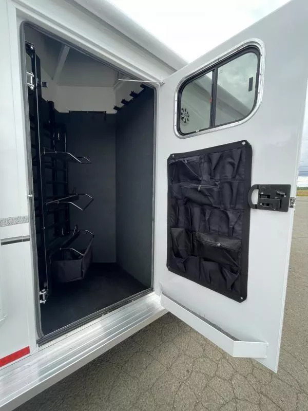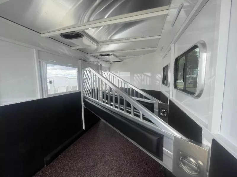 Pictures not updated. Will post updated pictures soon!!! Feature rich trailer at an unbelievably low price Come see how far your dollar goes with this high-quality Trails West trailer! UPGRADES Exterior Faucet Exterior outlet Exterior Speakers Roll Out Door Screen Door Shower Dome Glass Shower Door Rubber mats in tack room STRUCTURAL FEATURES 7’0 Wide, 7’0 Tall Aluminum One-Piece Roof .050 Aluminum Exterior Sheets Torsion Axles with Easy Lube Hubs Four Wheel Electric Brakes Radial Tires Aluminum Wheels Rubber Bumper 2 x 10 Douglas Fir Flooring CONSTRUCTION & EXTERIOR: Camper Door w/ 24 Window 24 x 48 Escape Window 18 x 18 Window 10’0 Gooseneck Hydraulic Jack Retractable Step Under Camper Door Stabilizer Jack Under ea. Side -- Front Hoof Grip Flooring in Horse Compartment Power Awning HORSE COMPARTMENT FEATURES Triple Wall Construction Bottom Latch Drop Down Feed Doors Head Side Drop Down Feed Door Safety Grill Sliding Windows Tail Side Roof Vent in Each Stall LED Dome Light in Each Stall Slam latch, Aluminum, Jail-bar Dividers Divider Pads Wall Mats 45/55 Double Rear Doors Escape Door w/Drop Down Feed Door Easy Care Floor SIDE TACK 1 2 Bridle Hooks 4 Headstall Holders 2 Brush Trays Swing-out Blanket Rack Swing-out Saddle Rack 25 Gallon Water Tank with Hose Convenience Package includes: Spare tire, water tank, door-mounted organizer, sport bag, flood light each side and rear. INTERIOR: Medium brown interior color Soft Touch Ceiling Synthetic Leather Sofa or Cushions Wood valances Day/Night Shades Color coordinated interior Vinyl floor w/wood print throughout Hardwood Cabinetry FRESH AND WASTE WATER SYSTEMS: Low point fresh water drains Demand type water pump Combination locking water center 38 gal. fresh water tank 28 gal. black holding tank 28 gal. gray holding tank 6 gal. DSI water heater Sewer hose storage compartment Sewer hose and adapter HEATING/INSULATION: Dual 5 gal. propane tanks w/ auto changeover Fully insulated floor, roof and walls 18,000 BTU furnace Air Conditioner GALLEY: 2 burner cooktop with range hood 3.6 cu ft. Refrigerator Galley Sink Wood trimmed counter tops Flip up counter top extension Microwave/Convection Oven BATHROOM: 25 x 30 Shower stall 12 volt exhaust fan Fresh water flush toilet Wash basin with vanity SLEEPING ACCOMMODATIONS: California King size bed Bedspread, pillows & shams Sofa converts into bed ELECTRICAL: Locking battery box AM/FM Stereo w/CD player Monitor Panel 12 volt outlet 110 volt outlets 110V/12V power converter w/charger 30 service cord Porch light by camper door Recessed LED Lighting PAINT & TRIM Acidic Phosphatizing Wash Polymer Coating Epoxy Primer Polyurethane Paint Infrared Cured Tread Brite Front & GN Gussets Backup Lights Double Tail Lights Molded 7 -- Way RV Plug Hotwire package w/battery box LED Lighting SAFETY: Locking water fill door Fire extinguisher CO/Smoke detector L.P. detector Alternate emergency exit ** Descriptions Subject to Error** For more information on this trailer please contact Double J Trailers at 360-225-1234. Thank You! Financing available to qualified buyers! All trailer prices are cash prices. Thank you! Trades Welcome Two Lots To Better Serve You! Woodland Washington & Albany Oregon We have over 250 trailers in stock. Please view our entire inventory at [www.double-j.com](http://www.double-j.com/) thank you! *Double J imposes a surcharge of 3% on credit card purchases of amounts greater than $500*