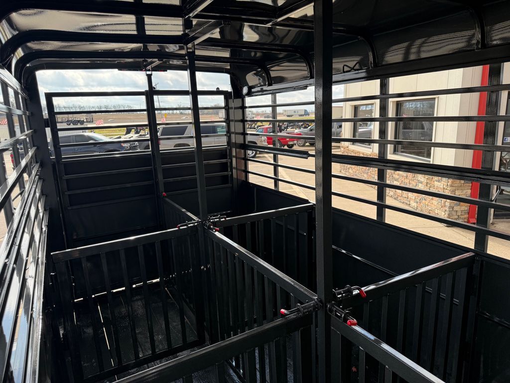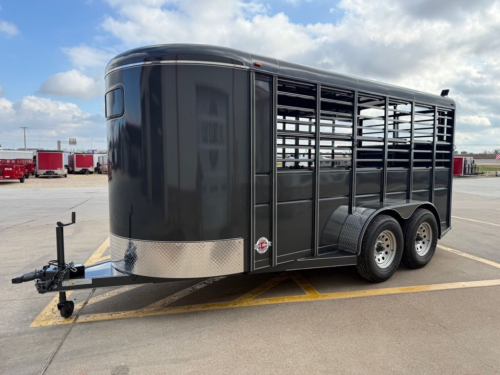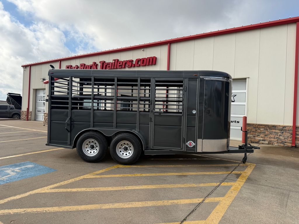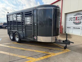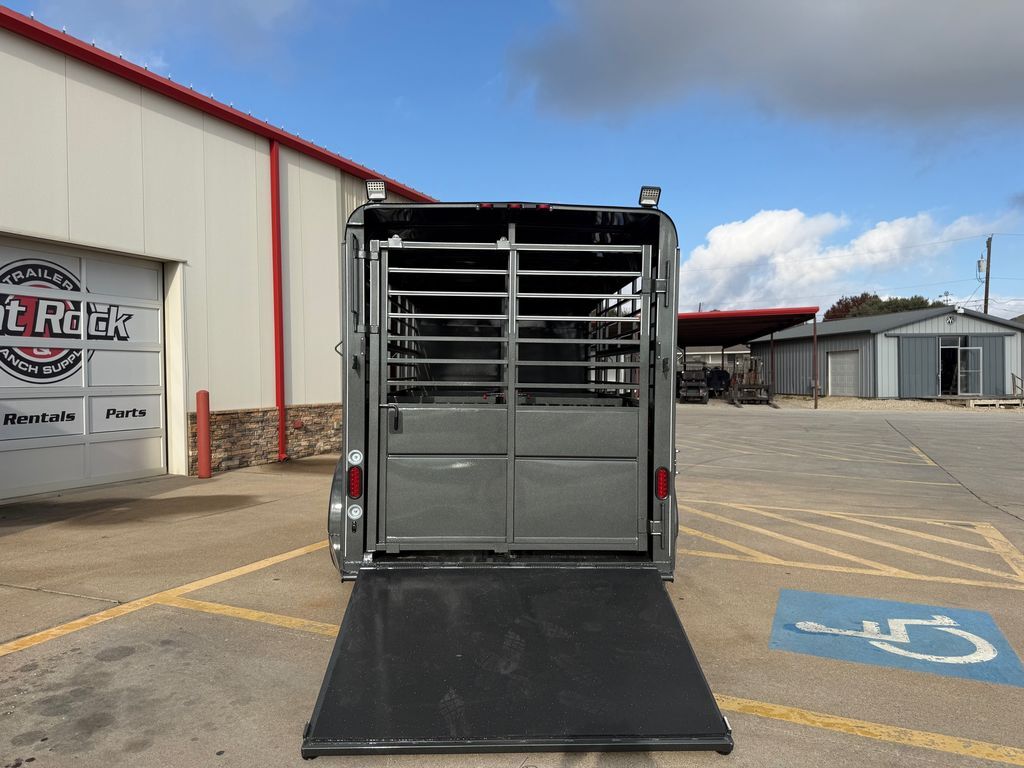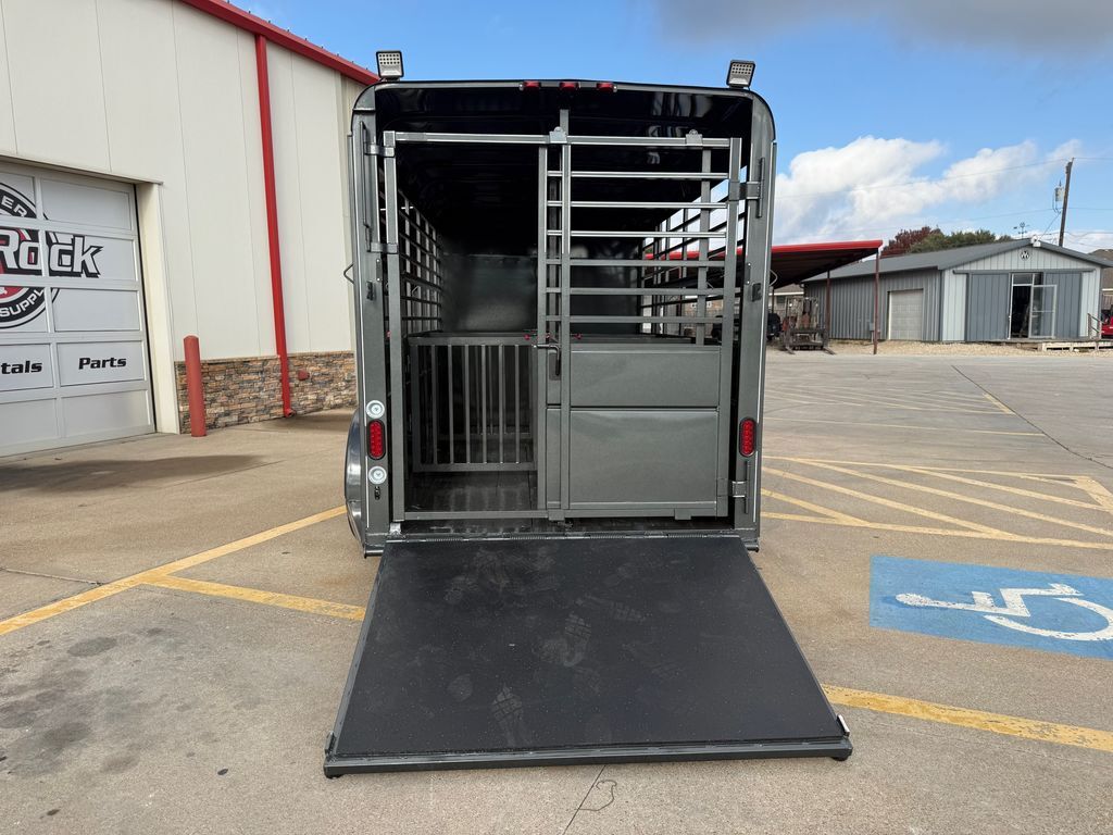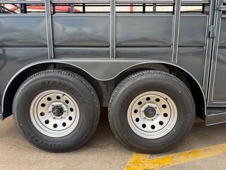 16’ (Length) x 6’ (Width) x 6’6 in. (Height) 2 x 3,500 lb. Dexter EZ Lube Torsion Axles Brakes on Rear Axle ST 235 80 R16 (Load Range E) SUPER TIRES Max Load Tires 3,520 lbs. Each (Total 14,080 lbs.) Double Weight Rating on Tires Over Axles 6 Lug Grey Mod Wheels 2 in Bulldog Style Coupler 2K Top Wind Jack w/ Caster Wheel Teardrop Fenders w/ Front and Rear Steps ATP Fender Rock Guard 12 in. ATP Front Rock Guard Spare Tire Mount 36 in. Solid Lower Body Slider Rear Gate w/ 4’ Spring Loaded Ramp Behind the Gate 4’ Straight Across Dressing Room 6, 3’ x 4’ Grill Style Pens (Removeable) 7 Way RV Plug Treated Pine Wood Floors Empty Weight 2,560 lbs. GVWR 7,000 lbs. Carrying Capacity 4,440