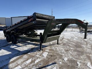 Gooseneck2 - 8K Lippert Electric Brake Oil Bath Spring AxlesST235/85R16 Tires (18 ply) w/Super Single Wheels18 Ply SpareWeld on Spare Tire Mount2-5/16” Adjustable GN Coupler (30K)Hydraulic Jacks (12K)Mega Lockable Toolbox Houses Battery & Pump3 Way Door Gate - Spreader GateRamp Pockets w/6’ 4” Long Slide in 4” Channel Ramps12ga. Diamond Plate Steel Fenders2’ Sides4 D-Rings Welded Inside Bed8” I-Beam FrameNeckboss 10” Engineered I-Beam Tongue3/8” Grade 70 Safety Chain w/Clevis Hook3” Channel 16” Spacing Crossmembers2 Button Hydraulic - Power Up/Power Down Pump1 - Interstate 27 Deep Cycle Battery10 Watt Solar PanelManual Tarp KitAll-Weather Wiring Harness (7-Way RV)DOT Approved LED LightsPowdercoat Military Green/Black7 ga. Steel BedWeight: 5,900 lbs.