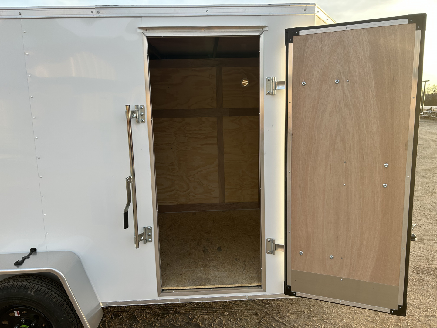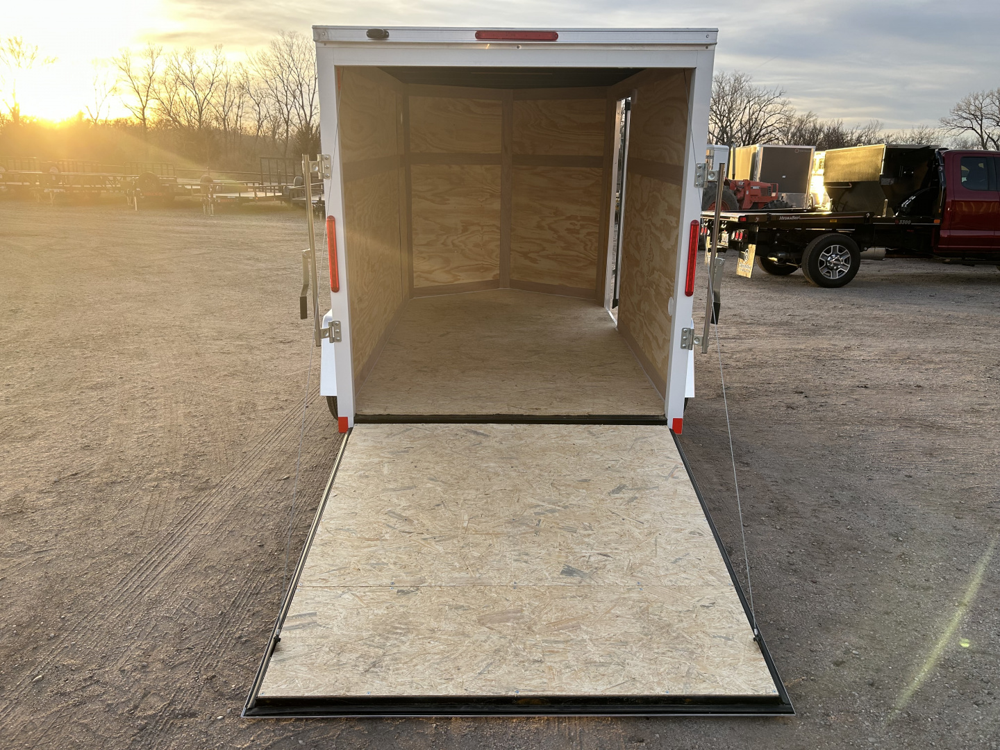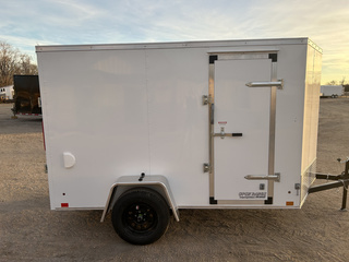 2026 CROSS 6’X10’ CARGO TRAILER 4 PIN FLAT ELECTRICAL PLUG 24” ON CENTER CROSS MEMBERS, WALLS, AND ROOF STUDS 3500# SPRING AXLE ST 205/75R 15”LR-C TIRES 5 LUG SILVER STEEL RIMS 2” COUPLER 2000# TOP CRANK A-FRAME JACK FULL WIDTH REAR RAMP, SPRING ASSIST 28”X68” CURBSIDE STRAP HINGE DOOR 3/8” PLYWOOD WALLS 3/4” WATER RESISTANT FLOOR 1 PEICE SEAMLESS ALUMINUM ROOF FIXED SIDE VENTS BRUSHED ALUMINUM FENDERS 16” GRAVEL GUARD 12V LED DOME LIGHT WITH INTEGRATED SWITCH