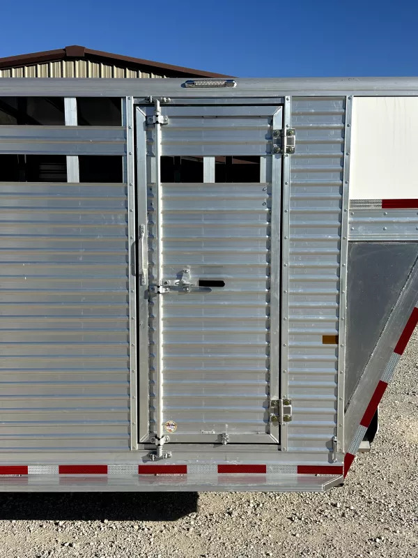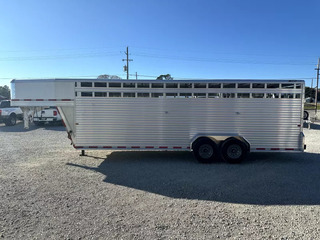 # 2025 Frontier 24’ Gooseneck Stock Trailer 24’L x 7’T x 7’W Horse Area - rubber mats, 2 center cut gates w/ air space, stock windows on head hip and rear door, plexiglass ready, calf gate in the nose, 2 pop up roof vents, escape door w/ LED porch light, full rear swing gate w/ slide. Other Features - center leg landing gear, spare tire, 235/80R16 tires, rear LED load light, additional LED clearance lights, stainless nose, full length aluminum running boards, rear rubbber bumper. Trailer comes with full factory warranty! Financing available with rates as low as 6.49% WAC Call our sales department at 940-365-9919 After hours call or text 612-381-6782