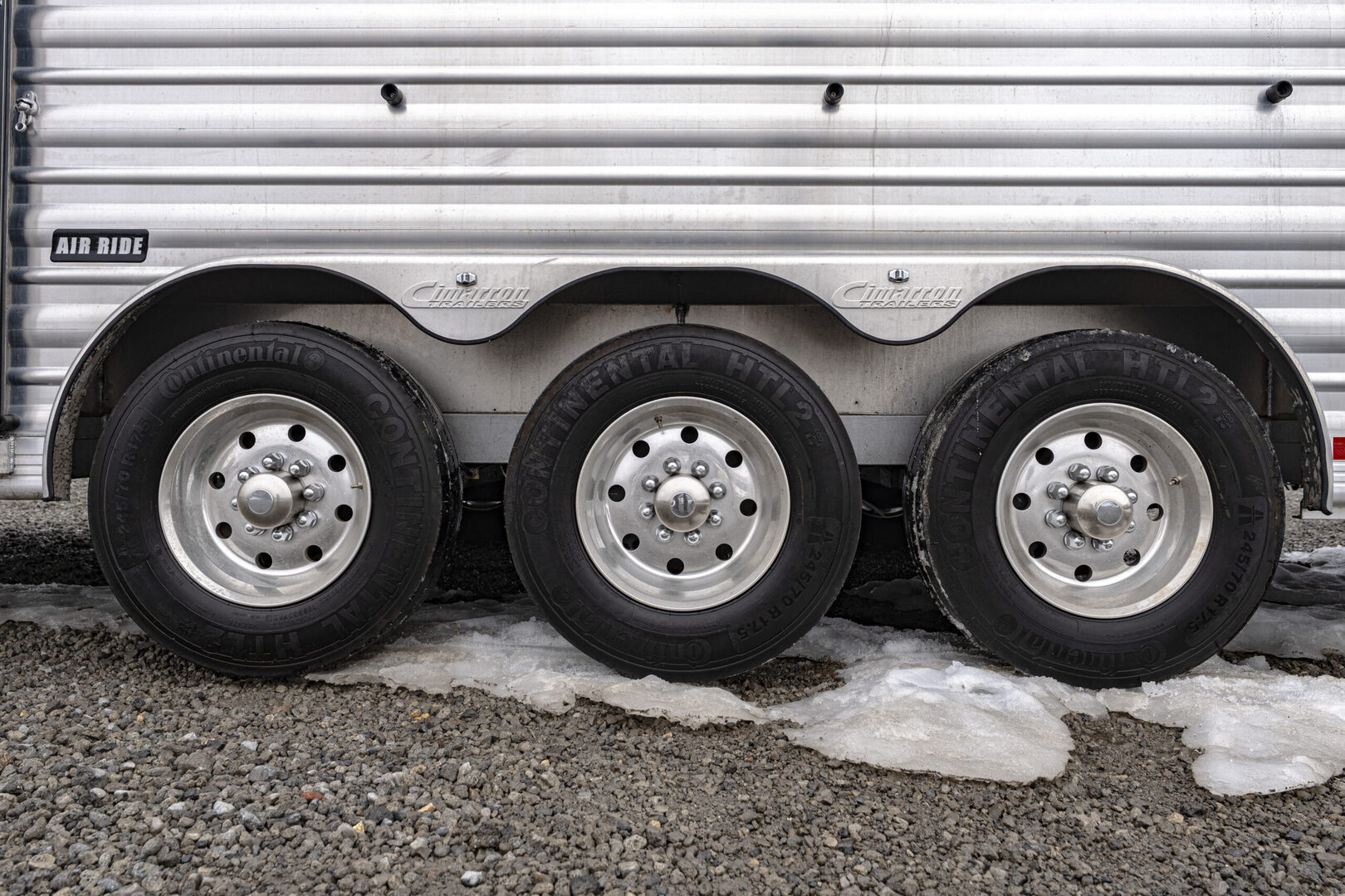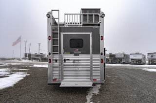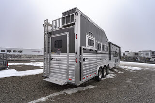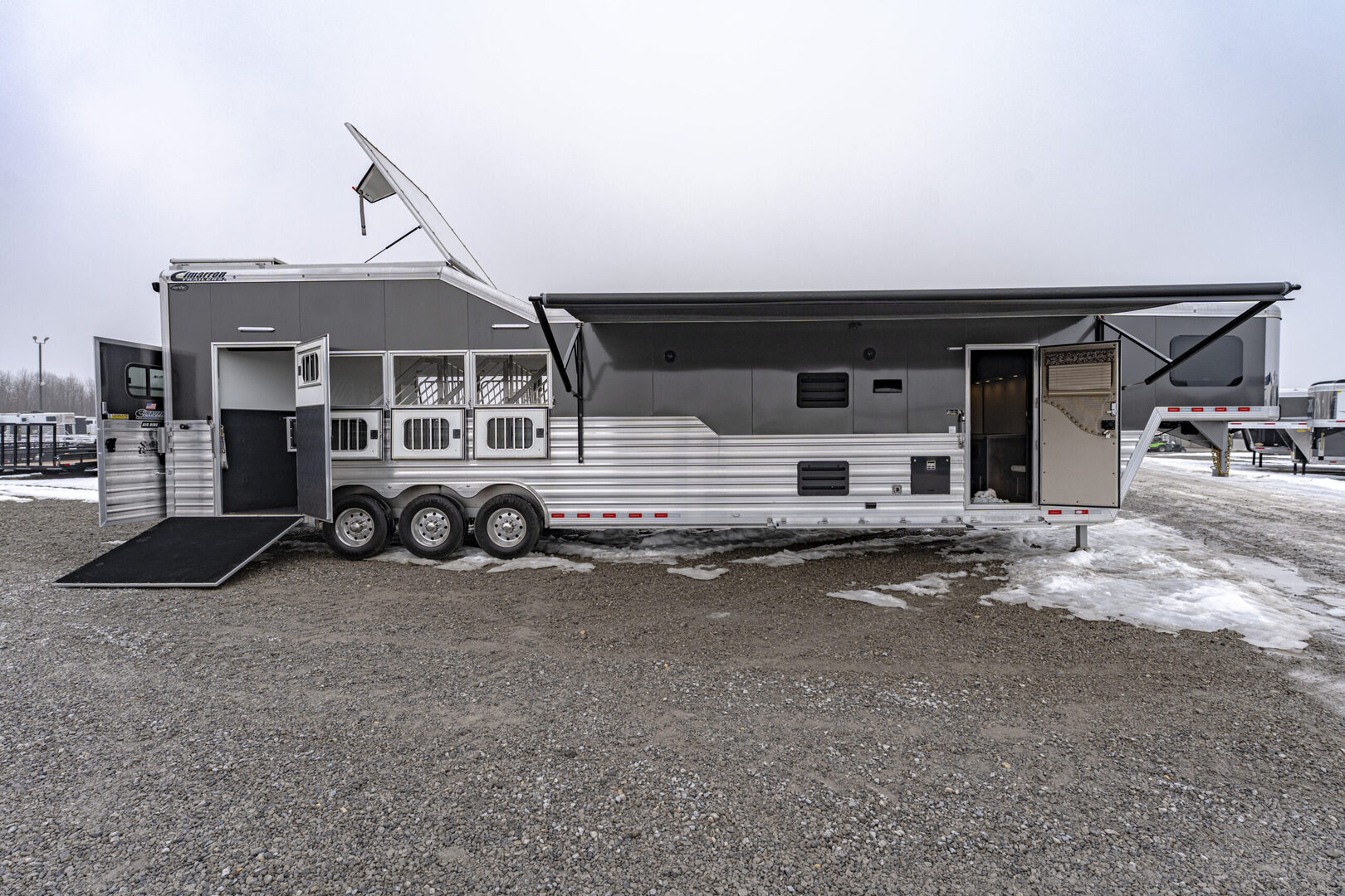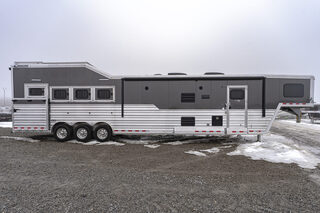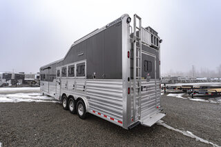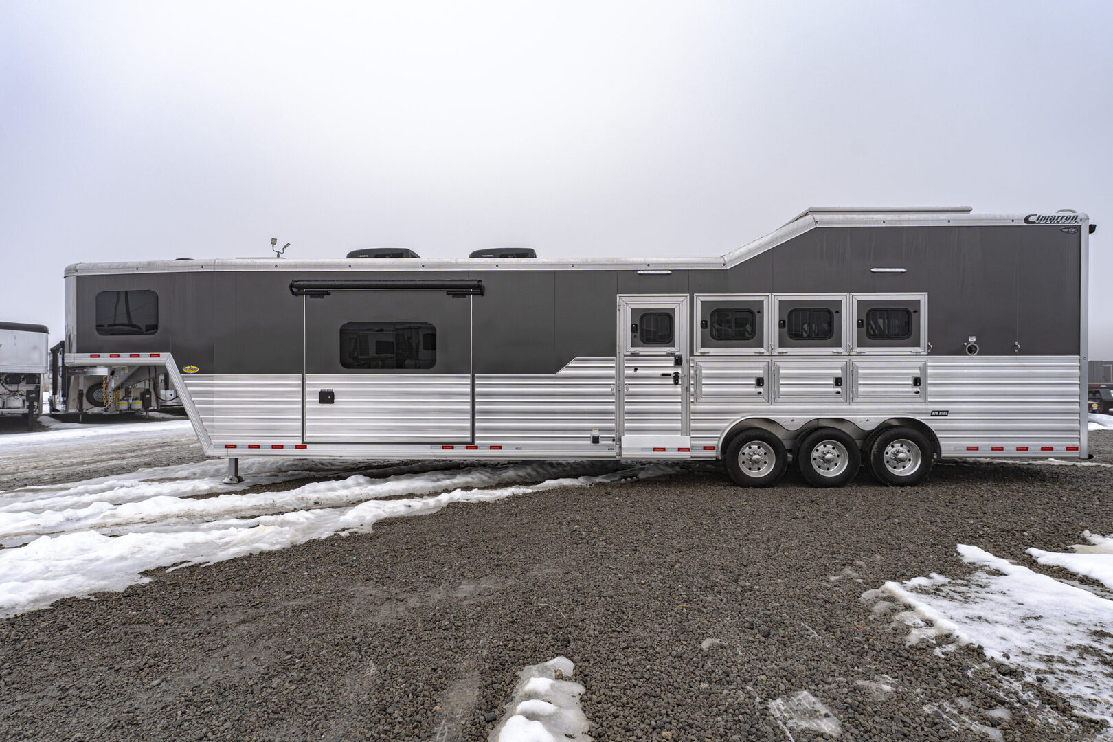 View Inventory: https://leonardtrailers.com/inventory/45464 Stock# 45464 New 2025 Cimarron NS4G-156SL Gooseneck  LQ Horse Trailer Cimarron aluminum horse trailers are engineered to be durable and safe. Bumper pull or gooseneck configurations ensure effortless towing and comfort. Model: NS4G-156LQSL Warranty: 8yr- Structural 3yr-Body and Hardware Trailer Specifications Dimensions Box Length: 38’ - 9” Box Width: 8’ - 0” Box Height: 7’ - 10” Undercarriage Axles: 8,000 lb  GVWR: 24,0000 lbs Brakes: Electric/Hydraulic, Disc Brakes Tires: Continental 245/70 R17.5” LR-J Wheels: 8-hole aluminum spoke, 17.5” Design Nose Profile: Tapered sides, 18” radius corners Nose Sheet: Polished stainless steel Side Walls: Extended Side Slat to GN Sheet Color: Charcoal Metallic Roof Material: Insulated roof panel Fenders: Teardrop Overall Width: 102” OAW Side Opening Ramp: 57” tall x 65” Wide  Dividers Type: Break Over Bar x3 Type: Full Bar Type x1 Head Grills Bar type Miscellaneous D-Rings: 3 Padding: 1 head, 6 side Lining: Kick mat – 48” high w/ .090 PL & insulation on LH & front wall; 54” high on RH walls & Rear  Floor Mat: WERM Flooring- Black Hardware & Accessories Dome Lights: Optibrite LED (8) Bridle Hooks: Set of 4 Brush Trays: 1 Dead Bolt, Comb Type: 2 Hold Up Steps: 3 Special Requirements Added recessed paddle latch on side access door on #1 stall Side Access door 39” on RH side of #4 stall for side load #4 Stall is 48” wide for side load  Rear Tack Door is 48” Wide Offset at Rear  Carpet all walls & doors of full rear tack  We offer outstanding financing options, accept trades, and can arrange nationwide NO HASSLE delivery! Inquire today for more information! (888) 333-6613 **We believe these specifications to be accurate. Any discrepancies are unintentional. Please verify information with a sales associate prior to purchase.** Stock Number:45464