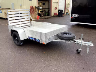 Standard Equipment: *2000# Rubber torsion axle - No brakes - Easy lube hubs - ST175/80R13 Radial tires - Steel wheels, 5-4.5 BHP - Aluminum fenders - Extruded aluminum floor - 6” Front retaining bumper - A-Framed aluminum tongue, 48” long with 2” coupler - 4) Stake pockets (2 per side) - 4) Tie down loops (2 per side) - Receptacle Holder - Tongue Handle - Fender Steps - Swivel tongue jack, 1200# capacity - LED Lighting package, safety chains - Aluminum tailgate / bi-fold tailgate - 50.25” x 39” long - Overall width = 75.5” - Overall length = 145” Upgraded Equipment: - Rack Set Solid Front & Sides 12” 1/2” - 12” U-bolt Spare Tire Mount ** Descriptions Subject to Error** For more information on this trailer please contact Double J Trailers at 541-812-1234. Thank You! Financing available to qualified buyers! All trailer prices are cash prices. Thank you! Trades Welcome Two Lots To Better Serve You! Woodland Washington & Albany Oregon We have over 250 trailers in stock. Please view our entire inventory at [www.double-j.com](http://www.double-j.com/) thank you! *Double J imposes a surcharge of 3% on credit card purchases of amounts greater than $500*