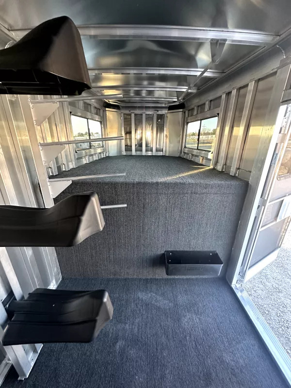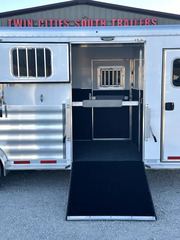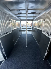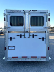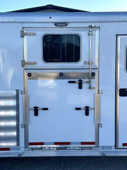 Horse Area - 54” high rear ramp w/ double doors above, 20” x 20” window in rear doors, padded chest and butt bars, padded bars at side ramp and side door in front stall, removeable swinging head divider, removeable padded stall divider w/ air flo shoulder separator, stud gates at front of each stall, kick pads, easy care floor, drop down windows w/ folding faceguards on street and curb side, pop up roof vents, interior LED load lights, 2 tie rings per horse, walk thru door to dressing room.