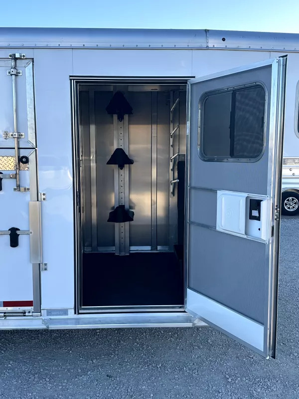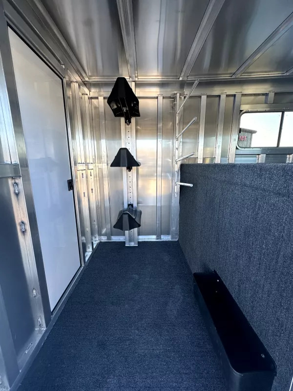 Dressing Room Area - swinging screen door, turf on: nose, drop wall, & floor, 3-tier removable and adjustable saddle rack, 5’ aluminum clothes rod, interior LED lights, aluminum halter hooks, brush box, 4-tier swinging blanket bar.