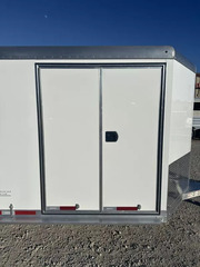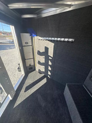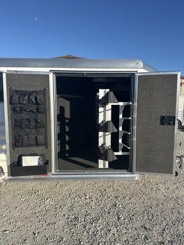 Horse Area - easy care floor, double rear doors, nylon butt strap, drop down windows w/ folding faceguards (head), sliding bus windows (hip), spring-loaded padded air flo dividers w/ slam latches, kick pads, lined & insulated walls, pop-up roof vents, five tie rings per horse, interior LED load lights.