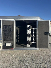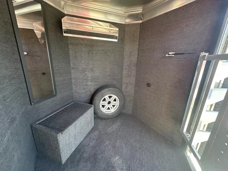 Premier Tack Area - clothes rod w/ hat shelf, turf on: floor, walls, & doors, brush box, 25 gallon water tank w/ stand, 3 tier adjustable and removable swing out saddle rack w/ integrated 4 tier blanket bar, full body mirror, manure fork w/ wall mount brackets, crank up roof vent, nylon hanging door tack organizer, 12 aluminum bridle hooks, turf covered boot box, interior LED lights.
