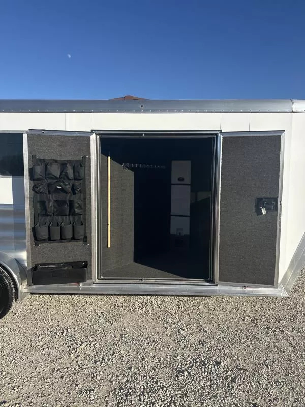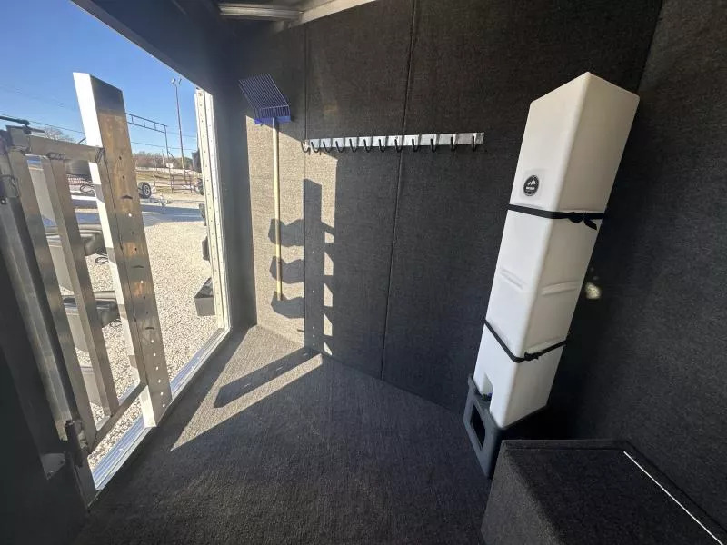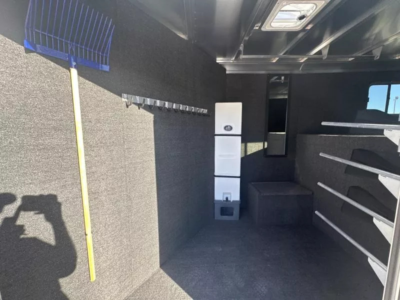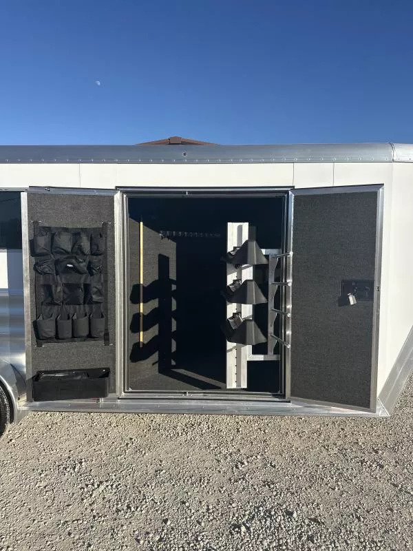 Premier Tack Area - clothes rod, turf on: floor, drop wall, nose, & doors, interior LED lights, brush box, 3 tier adjustable & removeable swing out saddle rack w/ integrated 4 tier pad tree, full body mirror, turf-covered boot box, 25 gallon water tank w/ stand, manure fork w/ mount brackets, crank up roof vent, nylon door hanging tack organizer, 12 aluminum bridle hooks.