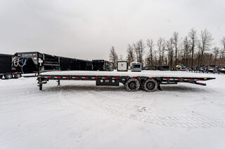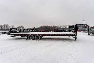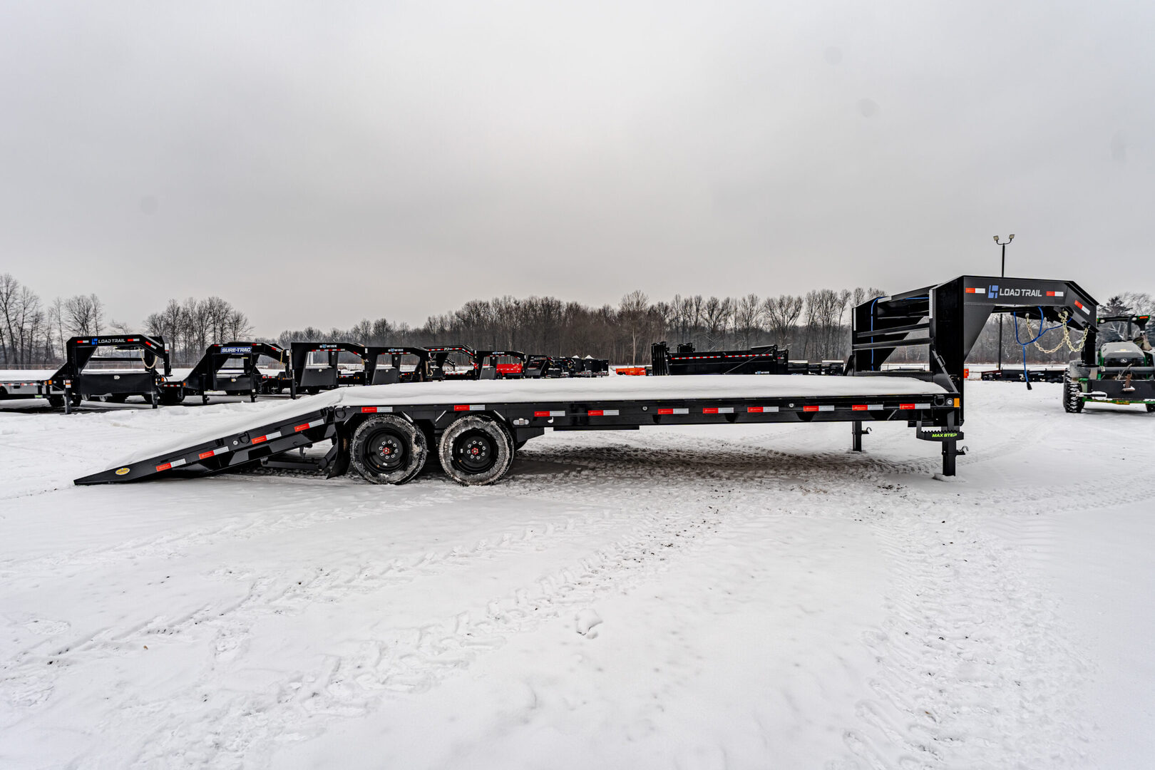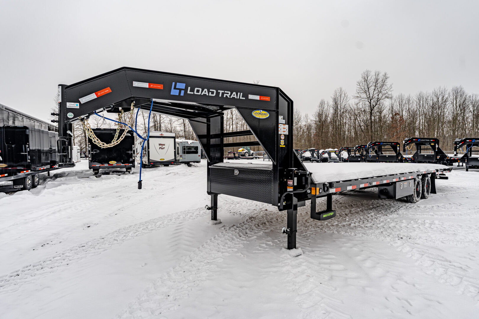 View Inventory: https://leonardtrailers.com/inventory/45505 Stock #45505 – New 2026 Load Trail GL0230082 102” x 30’ Single Wheel Low-Pro Gooseneck Trailer The New 2026 Load Trail GL0230082 is a heavy-duty, low-profile gooseneck trailer designed for hauling equipment and machinery with maximum durability and ease of use. Featuring oil-bath axles, a hydraulic dovetail, and treated wood flooring, this trailer is built for long-term performance and safe transport. Key Specifications Trailer Type: Single Wheel Low-Pro Gooseneck Deck Size: 102” x 30’ Axles: (2) 8,000 lb Dexter spring axles with electric brakes (oil-bath) Tires: ST215/75R17.5 LRH (16-ply, singles) Wheels: Black steel Coupler: 2-5/16” adjustable round (6” raised neck & coupler) Color: Black with primer Frame & Construction 9’ hydraulic dovetail Treated wood flooring 16” cross-members Standard frame without bridge 2” rub rail along sides Front full-width toolbox between risers Winch plate (8” channel) Jacks & Loading Accessories Spring-loaded drop-leg jacks (2 – 10K) MAX-STEPS side steps (2 – 15”) 4 weld-on D-rings for tie-downs Mud flaps included Electrical & Lighting LED lights with cold-weather harness Standard 5 Amp wall battery charger Stud junction box Additional Features Toolbox brackets (1 set) Road Service Program available: 833-278-3396 for info Stock Number:45505