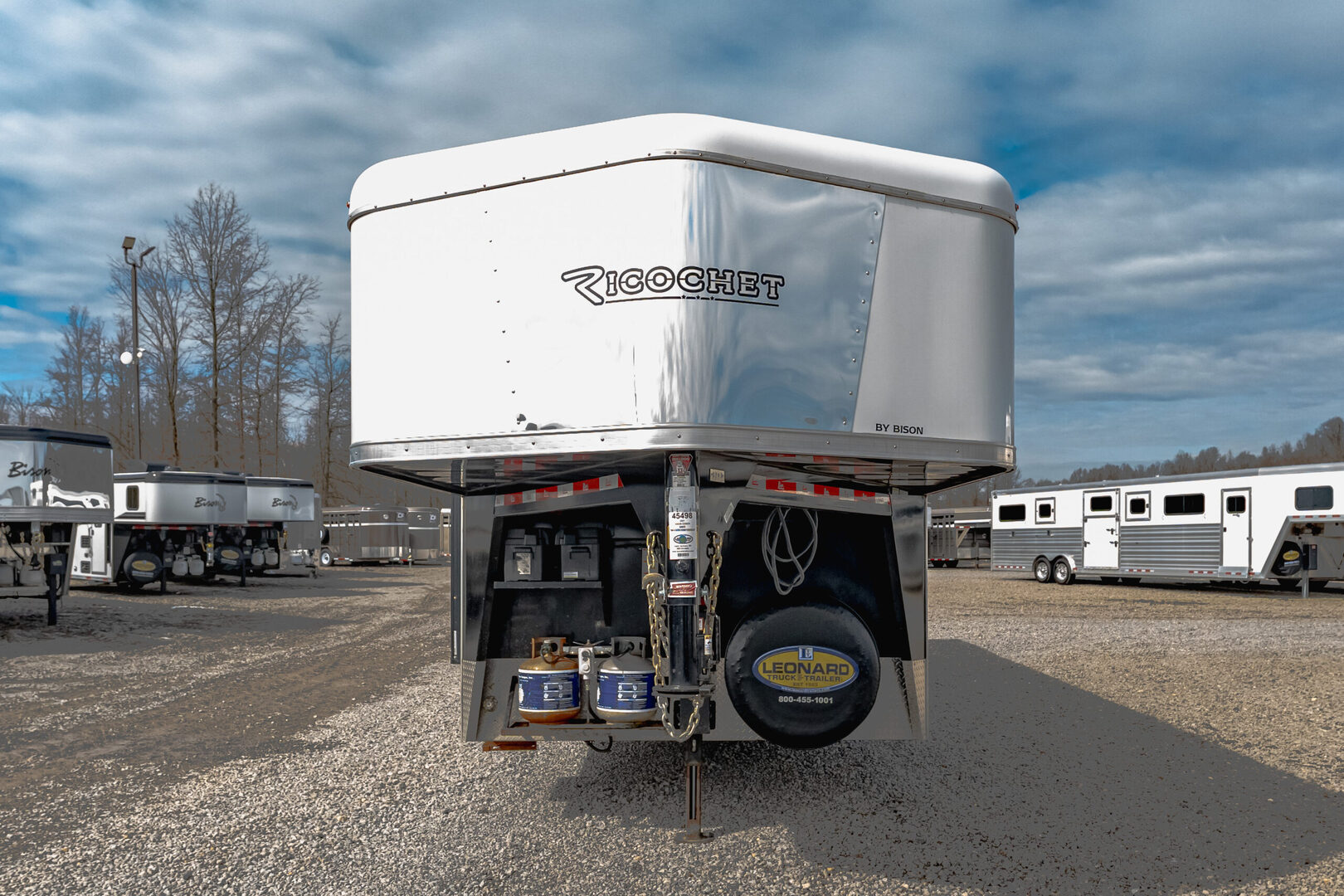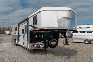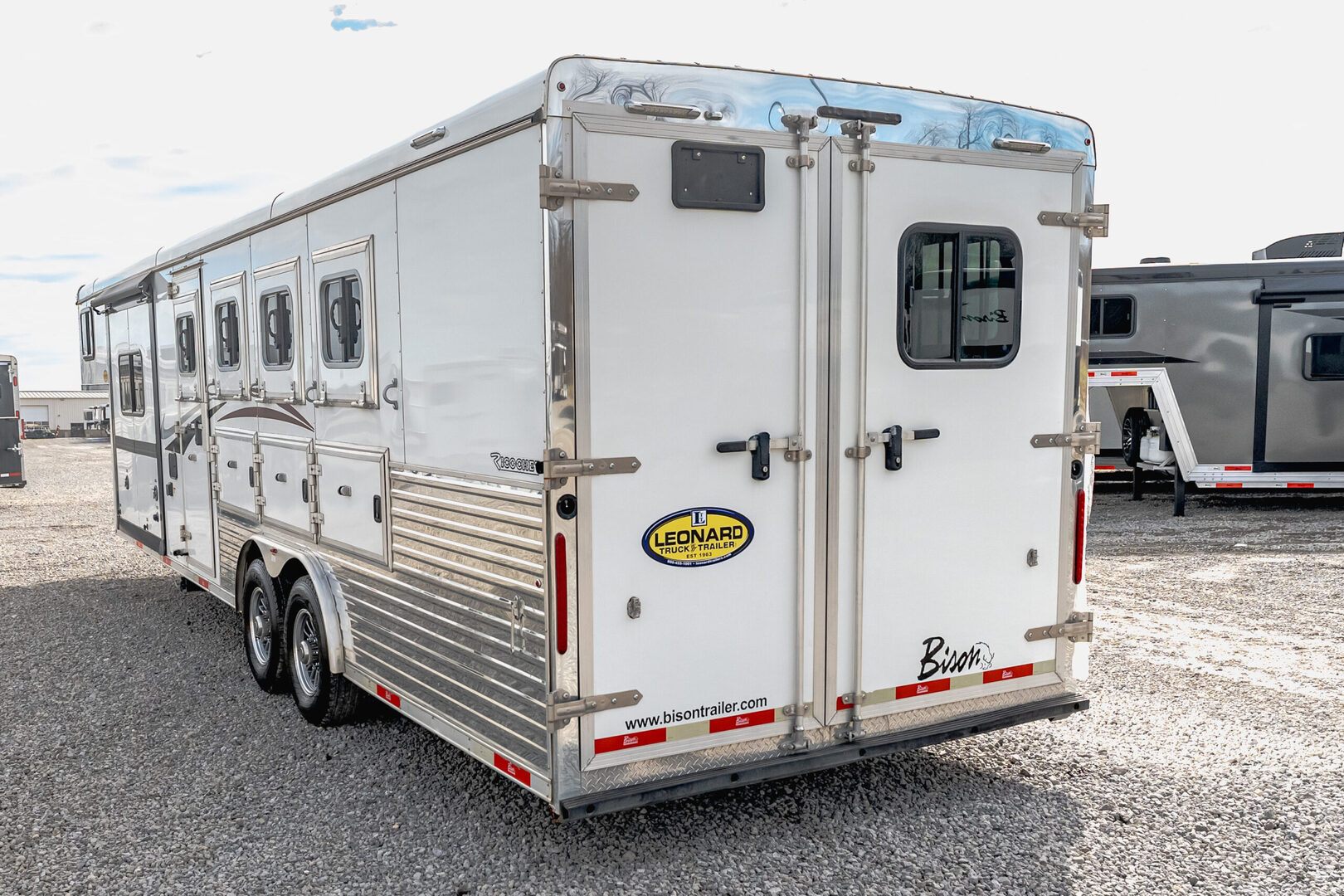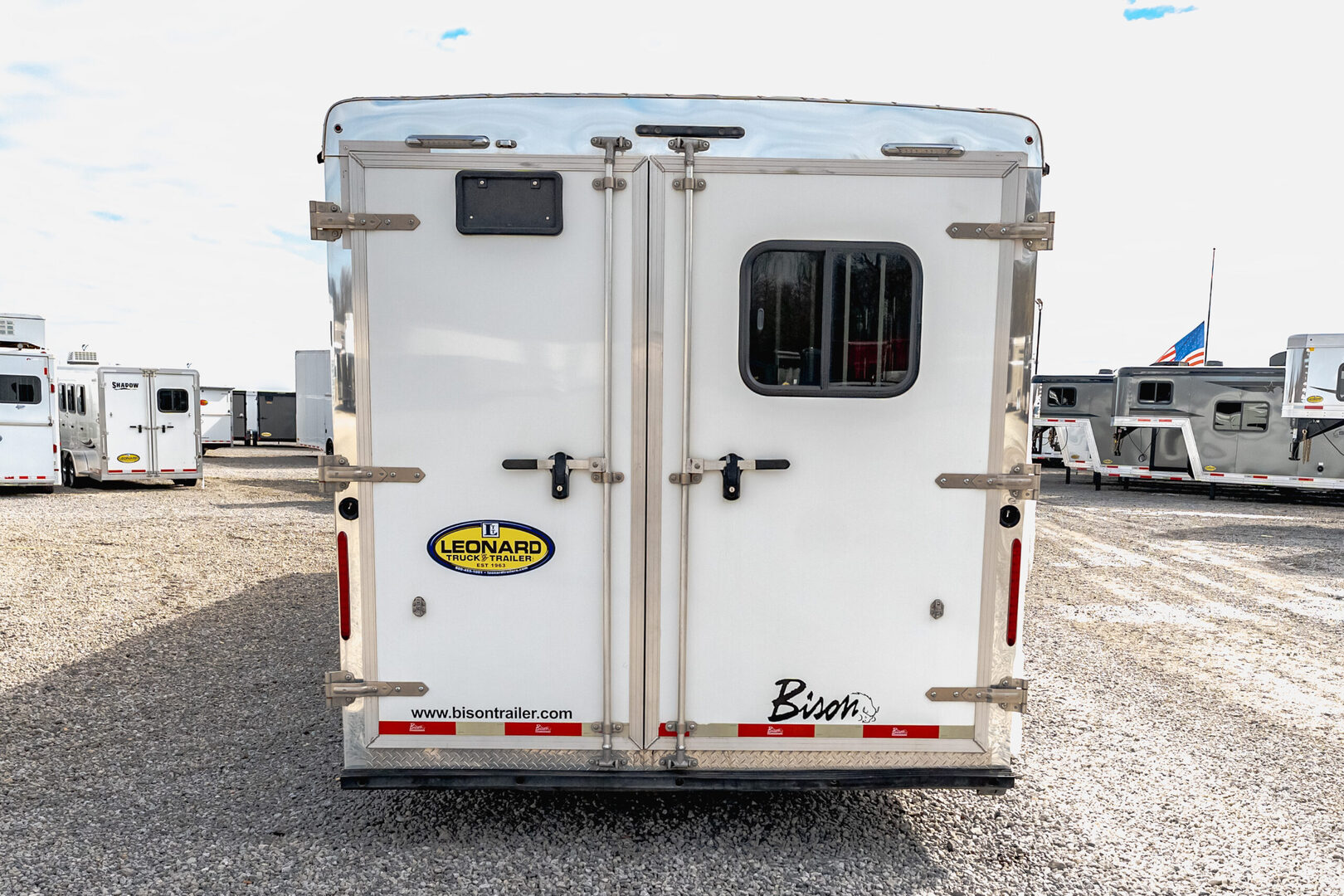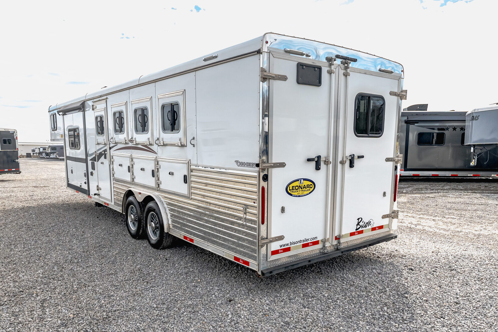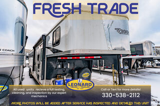 View Inventory: https://leonardtrailers.com/inventory/45498 Stock# 45498 Used 2021 Bison Coach 8409 Gooseneck 4 Horse with Living Quarters Trailer  General Information Exterior: XT SS Construction: Steel frame with aluminum skin Dimensions Length: 27 ft Width: 8 ft Height: 7 ft 6 in Coupler / Roof Coupler Size: 2 5/16” Adjustable Coupler: Yes Roof Material: Aluminum Primary Color: White Horse Area Type: Slant load Horse Area Options  Mats Pads Vents Lights Mangers Manger access doors Rubber Lining Complete Escape Type 1 Full Walk Out Tack Area Type: Rear collapsible Living Quarters Living Quarters Size: 9 ft Awning Size: 6 ft Living Quarters Options  Access to horse area Ducted A/C Heat strip / Furnace (ducted) Generator Sofa / Dinette Sink / Kitchen Stove / Refrigerator Microwave / Oven Sink in bath Toilet / Shower Slide Out Slide Out Size: 6 ft Slide Out Type: Electric Doors / Gate Double rear doors Axles / Weight / Running Gear GVW: 17,100 lbs Axle Size: 7,000 lbs Tire Size: 16” Number of Brakes: 4 Jacks: Single Jack Type: Hydraulic Spare Tire: Yes Ride Type: Rubber Ride   We offer outstanding financing options, accept trades, and can arrange nationwide NO HASSLE delivery! Inquire today for more information! (888) 333-6613 **We believe these specifications to be accurate. Any discrepancies are unintentional. Please verify information with a sales associate prior to purchase.** Stock Number:45498