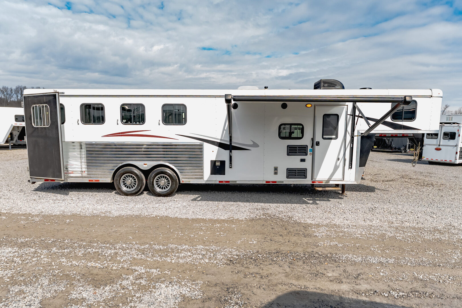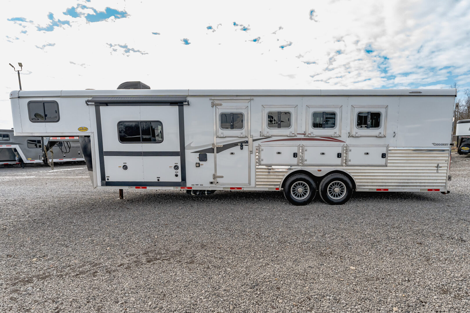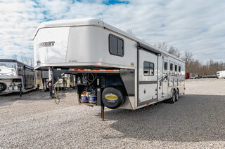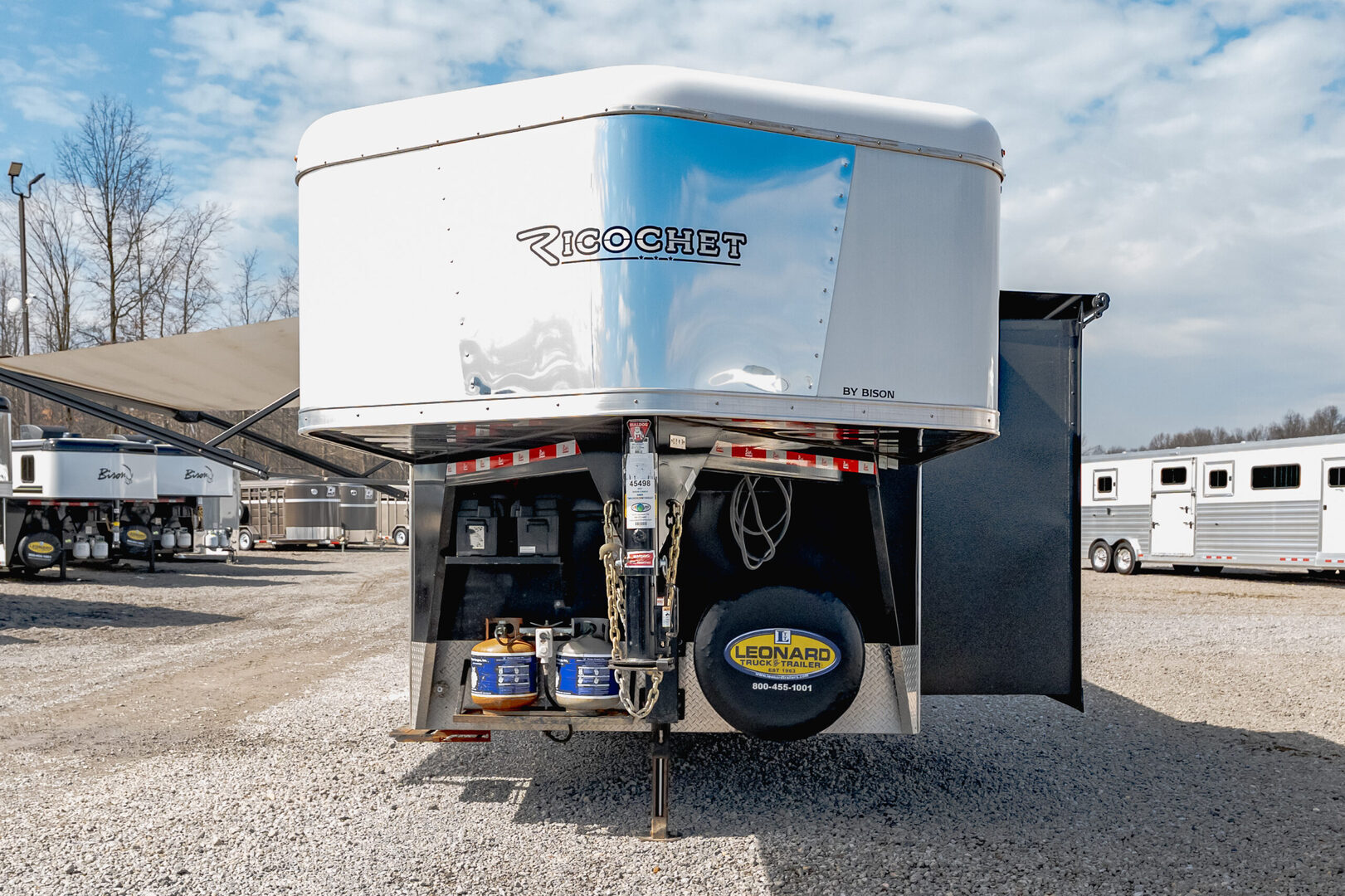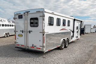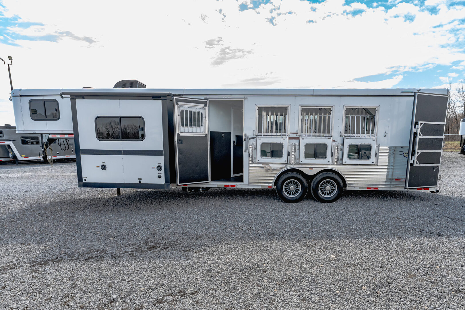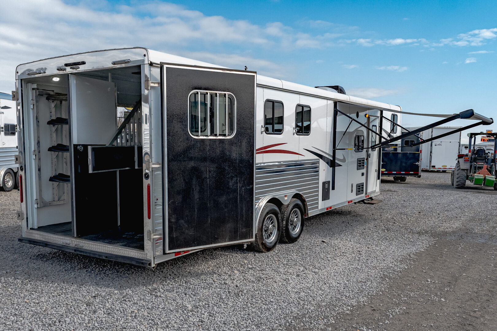 View Inventory: https://leonardtrailers.com/inventory/45498 Stock# 45498 Used 2021 Bison Coach 8409 Gooseneck 4 Horse with Living Quarters Trailer  General Information Exterior: XT SS Construction: Steel frame with aluminum skin Dimensions Length: 27 ft Width: 8 ft Height: 7 ft 6 in Coupler / Roof Coupler Size: 2 5/16” Adjustable Coupler: Yes Roof Material: Aluminum Primary Color: White Horse Area Type: Slant load Horse Area Options  Mats Pads Vents Lights Mangers Manger access doors Rubber Lining Complete Escape Type 1 Full Walk Out Tack Area Type: Rear collapsible Living Quarters Living Quarters Size: 9 ft Awning Size: 6 ft Living Quarters Options  Access to horse area Ducted A/C Heat strip / Furnace (ducted) Generator Sofa / Dinette Sink / Kitchen Stove / Refrigerator Microwave / Oven Sink in bath Toilet / Shower Slide Out Slide Out Size: 6 ft Slide Out Type: Electric Doors / Gate Double rear doors Axles / Weight / Running Gear GVW: 17,100 lbs Axle Size: 7,000 lbs Tire Size: 16” Number of Brakes: 4 Jacks: Single Jack Type: Hydraulic Spare Tire: Yes Ride Type: Rubber Ride   We offer outstanding financing options, accept trades, and can arrange nationwide NO HASSLE delivery! Inquire today for more information! (888) 333-6613 **We believe these specifications to be accurate. Any discrepancies are unintentional. Please verify information with a sales associate prior to purchase.** Stock Number:45498