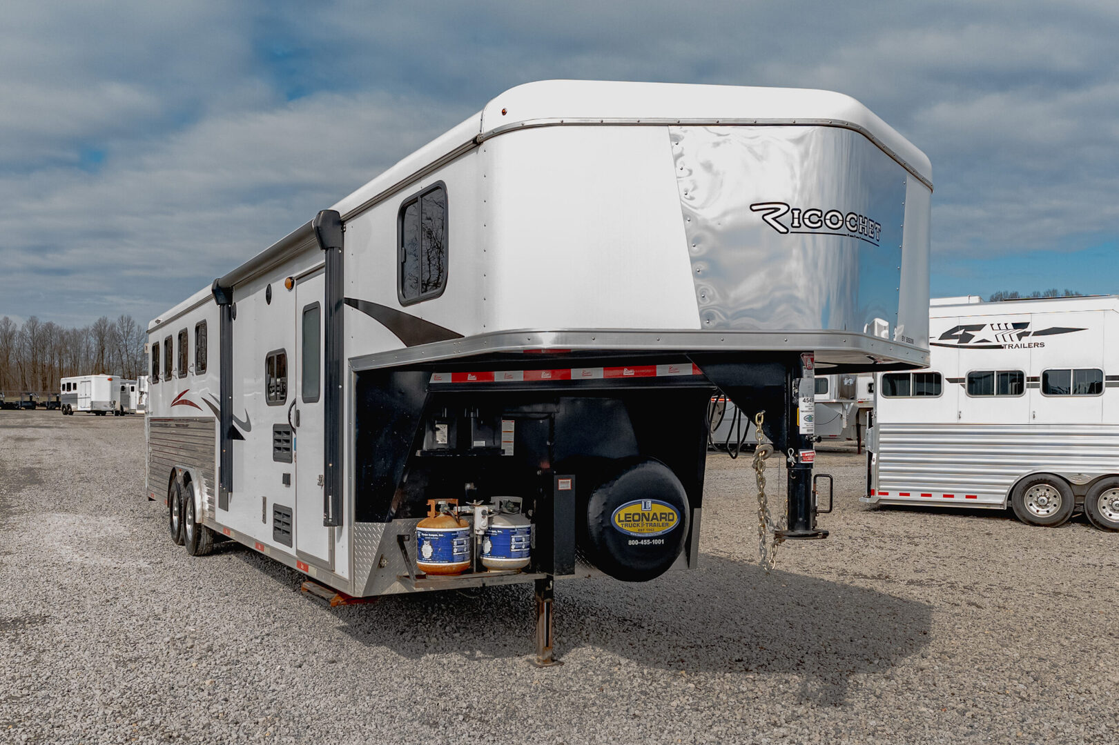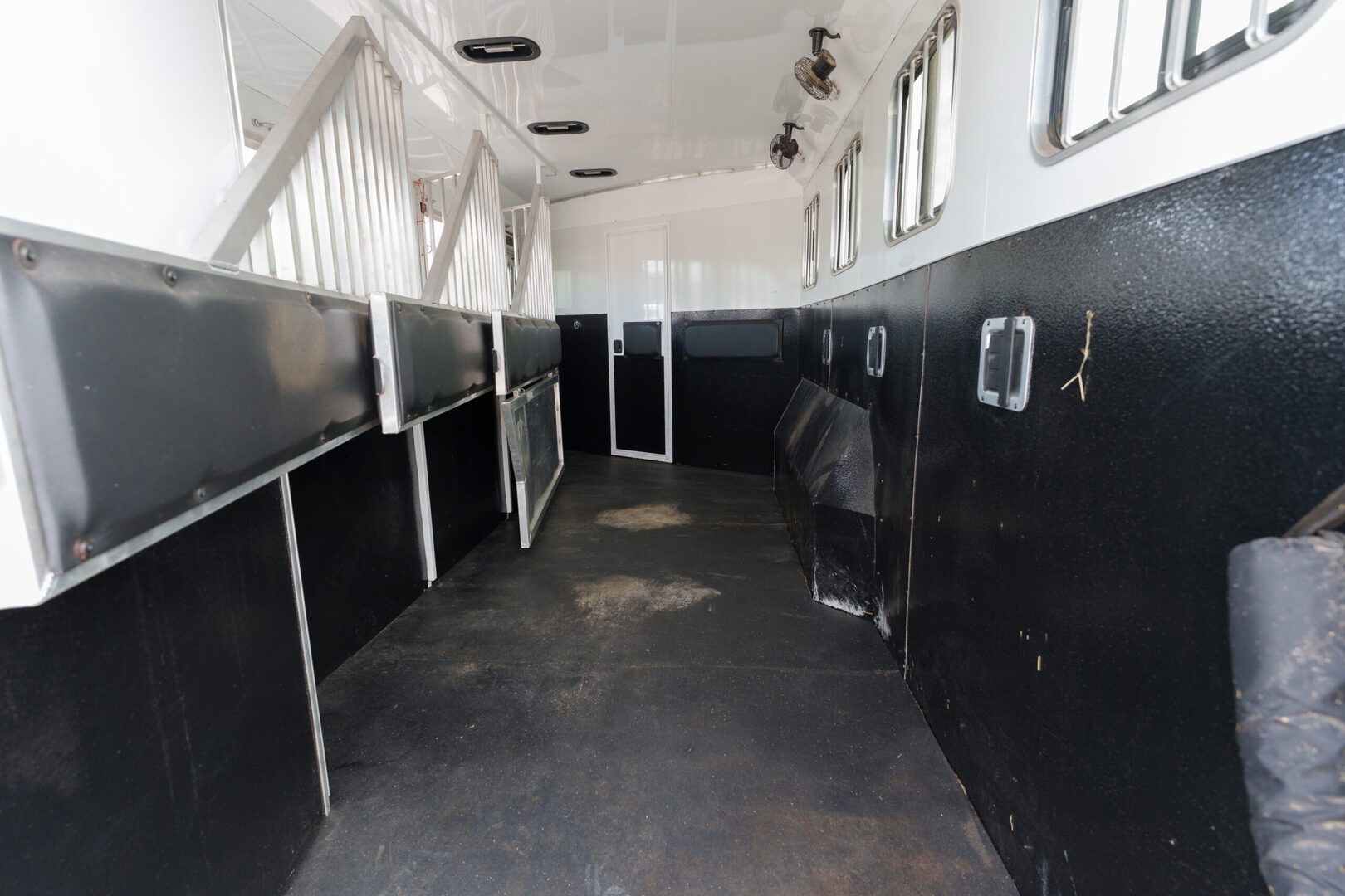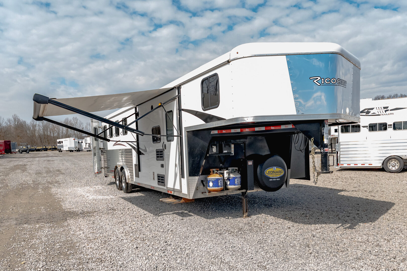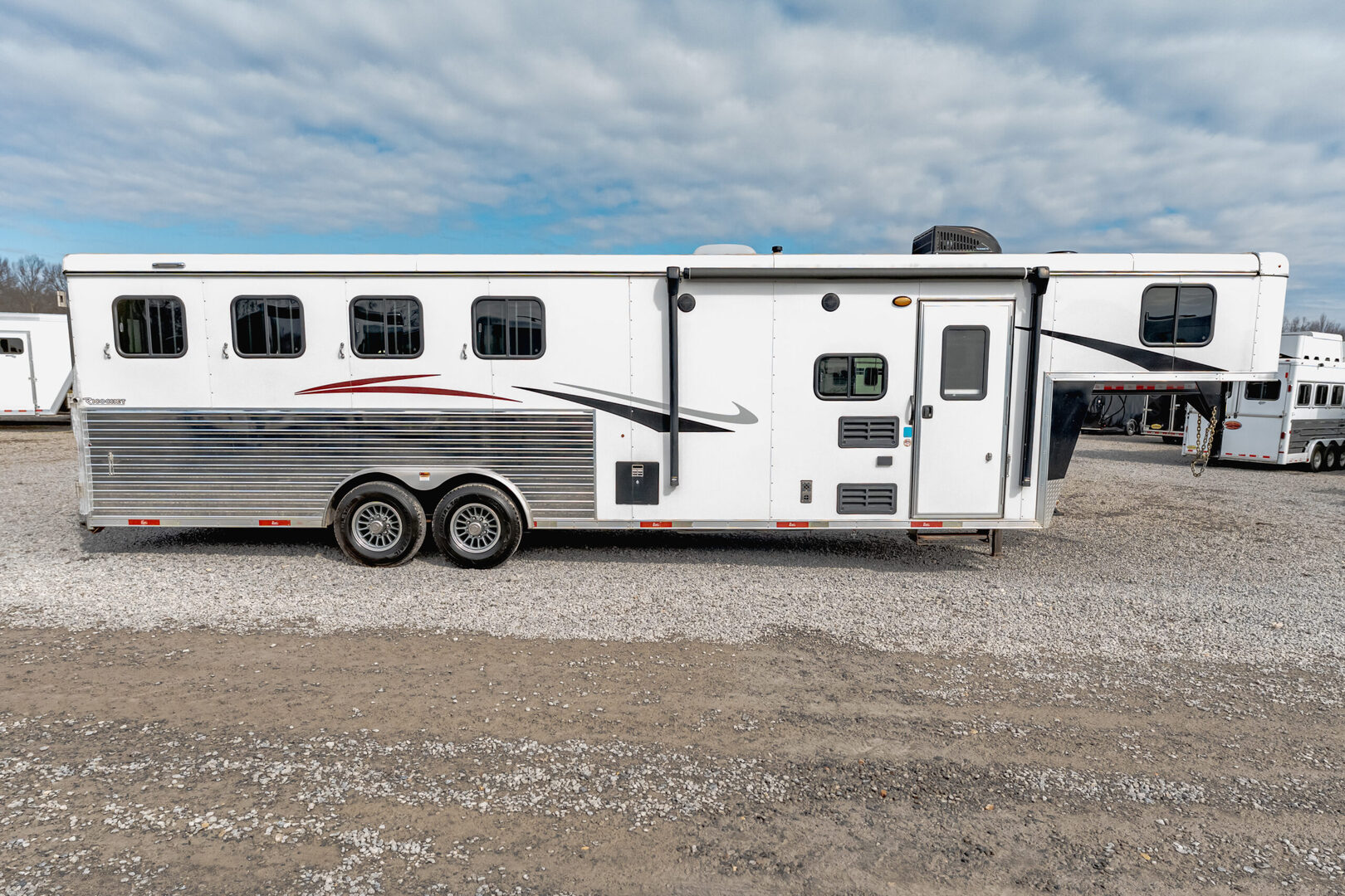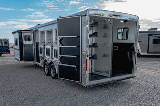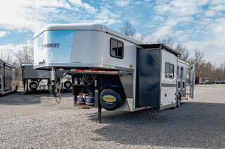View Inventory: https://leonardtrailers.com/inventory/45498 Stock# 45498 Used 2021 Bison Coach 8409 Gooseneck 4 Horse with Living Quarters Trailer  General Information Exterior: XT SS Construction: Steel frame with aluminum skin Dimensions Length: 27 ft Width: 8 ft Height: 7 ft 6 in Coupler / Roof Coupler Size: 2 5/16” Adjustable Coupler: Yes Roof Material: Aluminum Primary Color: White Horse Area Type: Slant load Horse Area Options  Mats Pads Vents Lights Mangers Manger access doors Rubber Lining Complete Escape Type 1 Full Walk Out Tack Area Type: Rear collapsible Living Quarters Living Quarters Size: 9 ft Awning Size: 6 ft Living Quarters Options  Access to horse area Ducted A/C Heat strip / Furnace (ducted) Generator Sofa / Dinette Sink / Kitchen Stove / Refrigerator Microwave / Oven Sink in bath Toilet / Shower Slide Out Slide Out Size: 6 ft Slide Out Type: Electric Doors / Gate Double rear doors Axles / Weight / Running Gear GVW: 17,100 lbs Axle Size: 7,000 lbs Tire Size: 16” Number of Brakes: 4 Jacks: Single Jack Type: Hydraulic Spare Tire: Yes Ride Type: Rubber Ride   We offer outstanding financing options, accept trades, and can arrange nationwide NO HASSLE delivery! Inquire today for more information! (888) 333-6613 **We believe these specifications to be accurate. Any discrepancies are unintentional. Please verify information with a sales associate prior to purchase.** Stock Number:45498