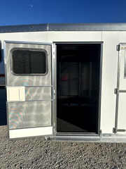 Dressing Room Area - Swinging screen door, carpet on: nose, drop wall, & floor, brush box, 6 aluminum bridle hooks, extra location for removable saddle rack, 5’ aluminum clothes rod, 4-tier swing-out pad tree, interior LED lights.