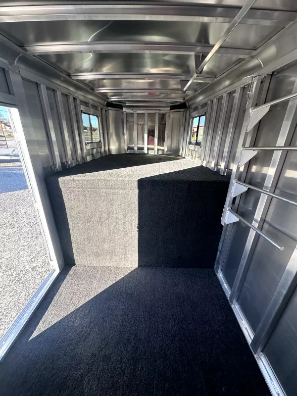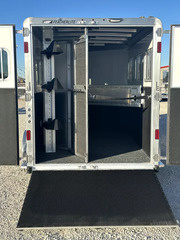 Horse Area - double rear doors, nylon butt & chest strap, escape door, drop down windows w/ folding faceguards (head), sliding bus windows (hip), spring loaded padded air flo dividers w/ slam latches, kick pads, easy care floor, lined and insulated walls, pop up roof vents, interior LED lights, 5 interior tie rings per horse, folding & removeable rear tack w/ 3 tier adjustable & removeable saddle rack, 6 aluminum rear tack bridle hooks, rear tack LED light, spring loaded rear ramp.