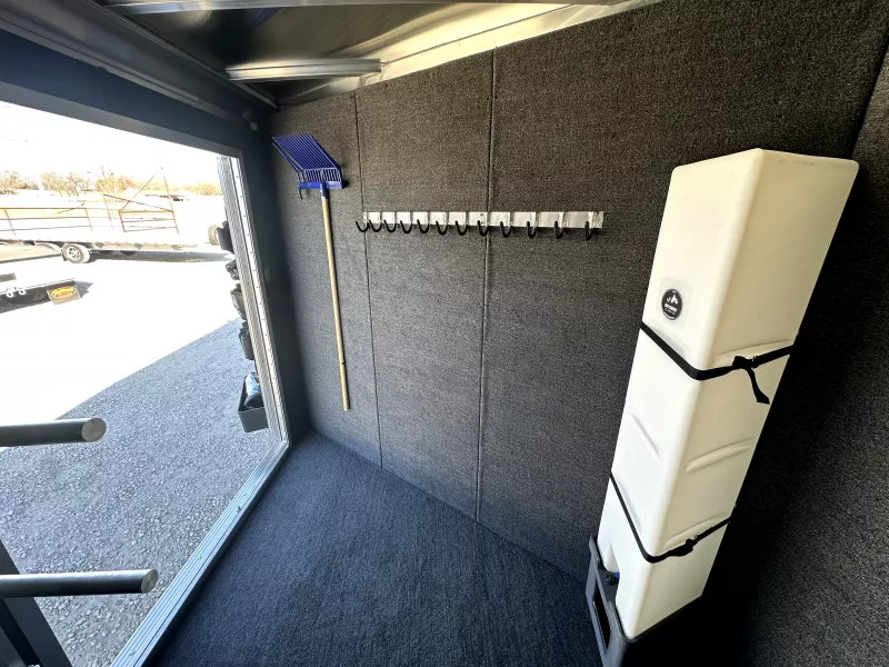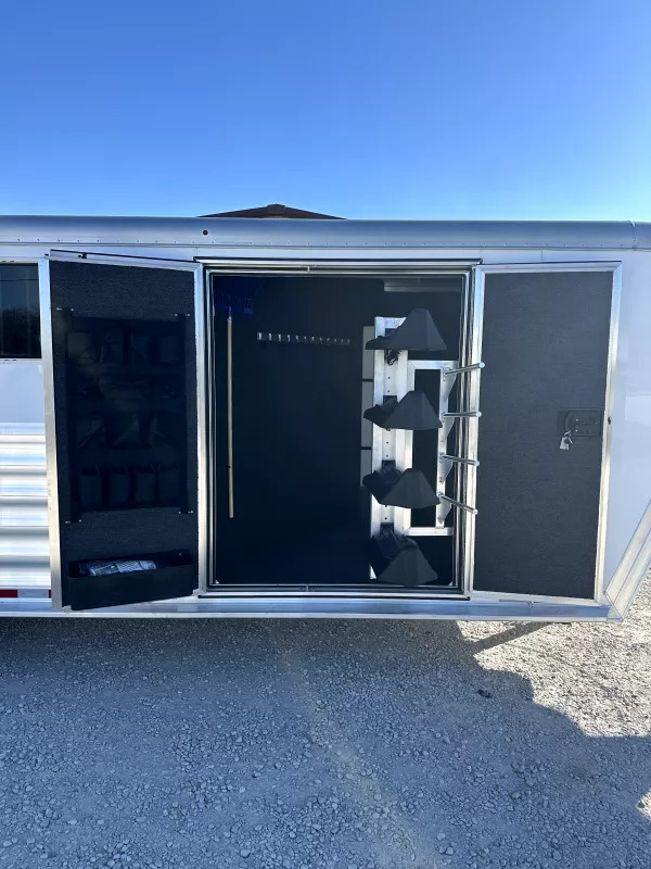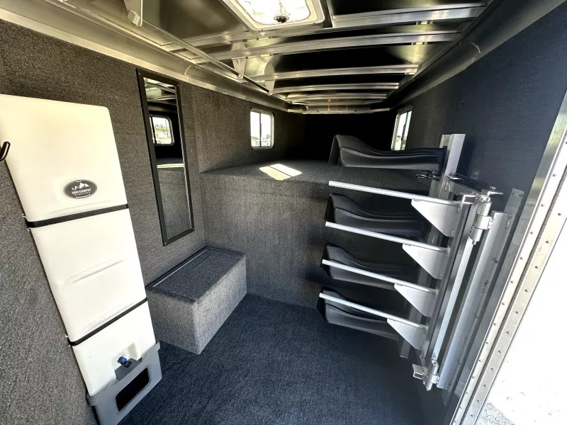 Premier Tack Area - full body mirror, carpet-covered boot box, carpet on: floor, walls, drop wall, nose, & doors, 25-gallon water tank w/ stand, manure fork w/ wall mount brackets, crank up roof vent, nylon hanging door tack organizer, 12 aluminum bridle hooks, swing out 4 tier removeable & adjustable saddle rack w/ integrated 4 tier pad tree, brush box, clothes rod, interior LED lights.