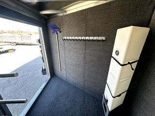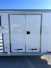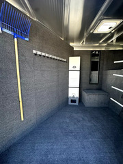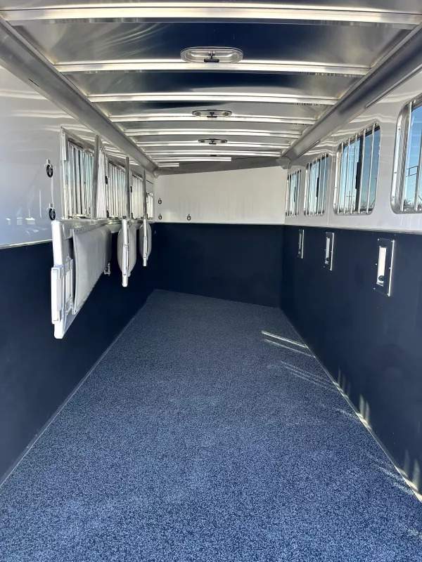 Horse Area - double rear doors, nylon butt & chest straps, escape door, easy care floor, drop down windows w/ folding face guards (head), sliding bus windows (hip), spring loaded padded air flo dividers w/ slam latches, lined and insulated walls, kick pads, pop up roof vents, interior LED load lights, 5 tie rings per stall.