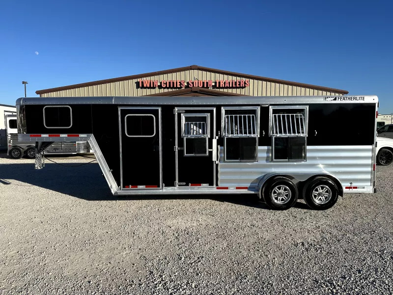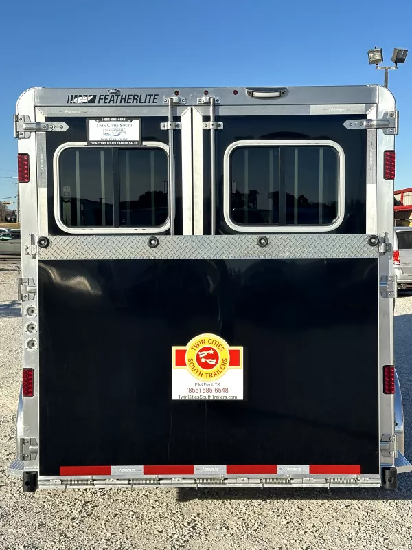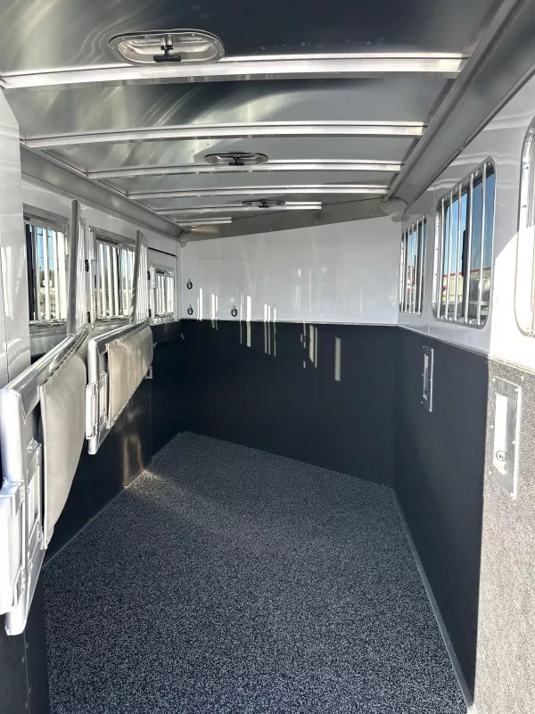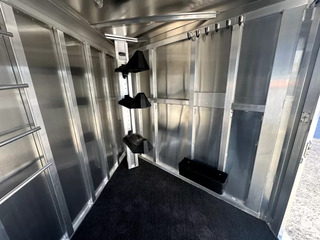 Horse Area - double rear doors, nylon butt & chest strap, escape door, drop down windows w/ folding faceguards (head), sliding bus windows (hip), spring loaded padded air flo dividers w/ slam latches, kick pads, easy care floor, lined and insulated walls, pop up roof vents, interior LED lights, 5 interior tie rings per horse, folding & removeable rear tack w/ extra location for saddle rack, 6 aluminum rear tack bridle hooks, rear tack LED light, spring loaded rear ramp.