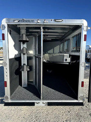 Horse Area - double rear doors, nylon butt & chest strap, escape door, drop down windows w/ folding faceguards (head), sliding bus windows (hip), spring loaded padded air flo dividers w/ slam latches, kick pads, easy care floor, lined and insulated walls, pop up roof vents, interior LED lights, 5 interior tie rings per horse, folding & removeable rear tack w/ 3 tier adjustable & removable saddle rack, 6 aluminum rear tack bridle hooks, rear tack LED light, spring loaded rear ramp.