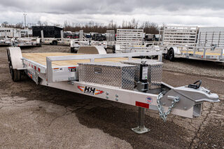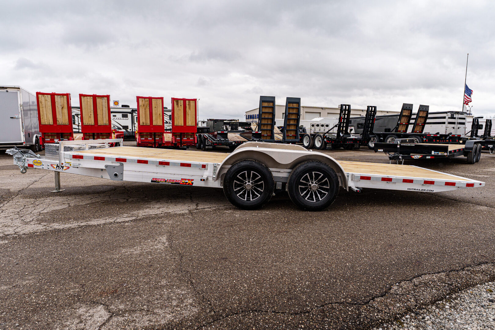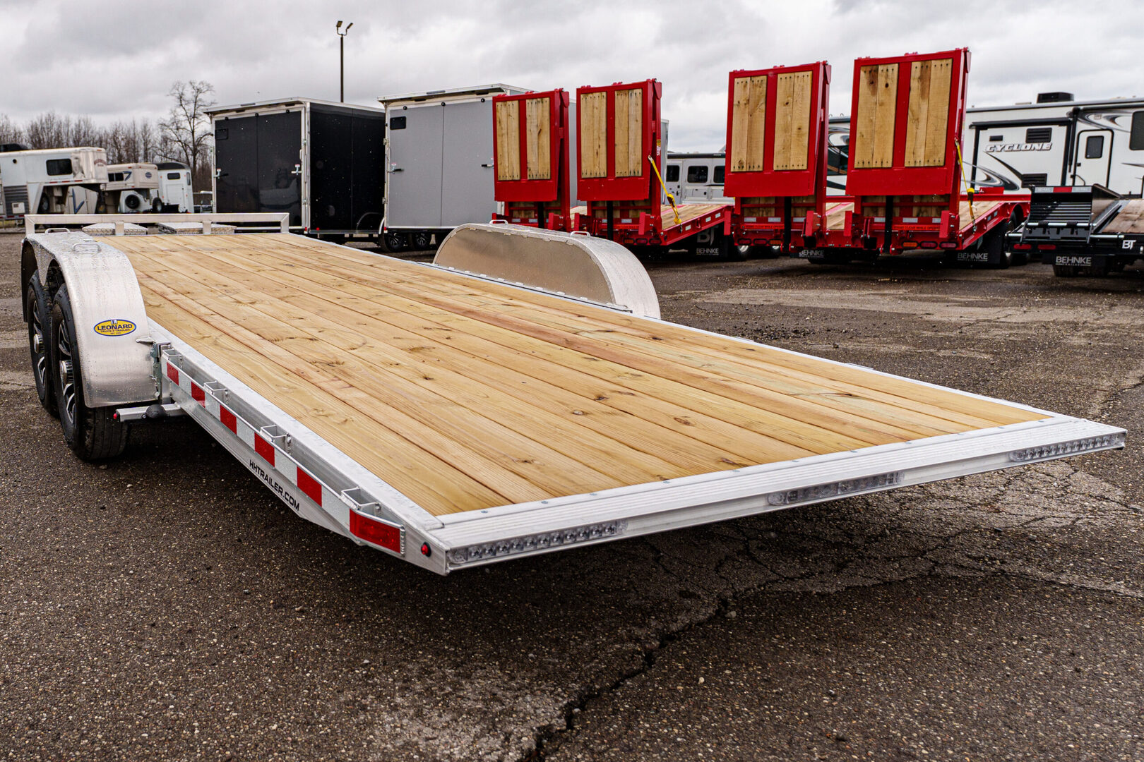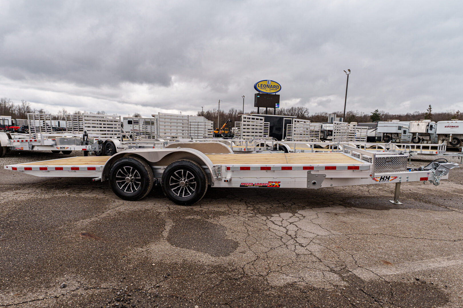 View Inventory: https://leonardtrailers.com/inventory/45533 Stock #45533 – New 2026 H&H 82” x 20’ Aluminum Electric Tilt Low Profile Speed Loader Car Hauler (10K GVWR) The New 2026 H&H 82x20 Aluminum Electric Tilt Low Profile Speed Loader is a lightweight, easy-to-tow aluminum car hauler designed for smooth loading and long-term durability. Its electric hydraulic tilt deck and low-profile design make it ideal for low-clearance vehicles and light equipment. Key Specifications GVWR: 10,000 lbs Axles: (2) 5,200 lb drop spring brake axles Coupler: 2-5/16” A-frame Posi-Lock Tires: ST225/75R15D (8-ply) Wheels: 15” 6-hole aluminum Deck Size: 82” x 20’ Deck Width: 79.25” Color: Aluminum Frame & Construction Main Frame: 8” aluminum channel Crossmembers: 3” aluminum channel Tongue: 6” aluminum channel, fully wrapped Tongue Style: Low profile Bulkhead: Aluminum tube Dovetail: Reverse taper cut Decking: 2” pressure-treated pine Tilt & Hydraulic System Electric hydraulic tilt deck 12-volt hydraulic pump Tongue-mounted lockable battery and pump box On-board 110V, 4-amp battery charger Loading & Securement Teardrop smooth aluminum fenders (removable) Aluminum stake pockets Aluminum rub rails Additional Features 7K drop-leg jack (set-back) DOT-compliant safety chains Easy-lube hubs Tongue-mounted toolbox Sealed wiring harness 7-pin round blade connector Full LED DOT-compliant lighting Warranty Limited 3-Year Warranty We offer excellent financing options, accept trades, and provide nationwide NO-HASSLE delivery. Call today for more details: (888) 333-6613 All specifications believed to be accurate—please verify with a sales associate prior to purchase. Stock Number:45533