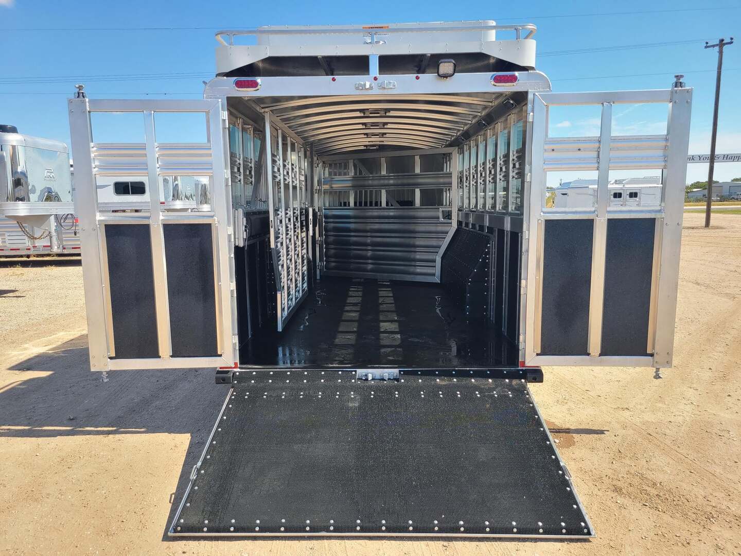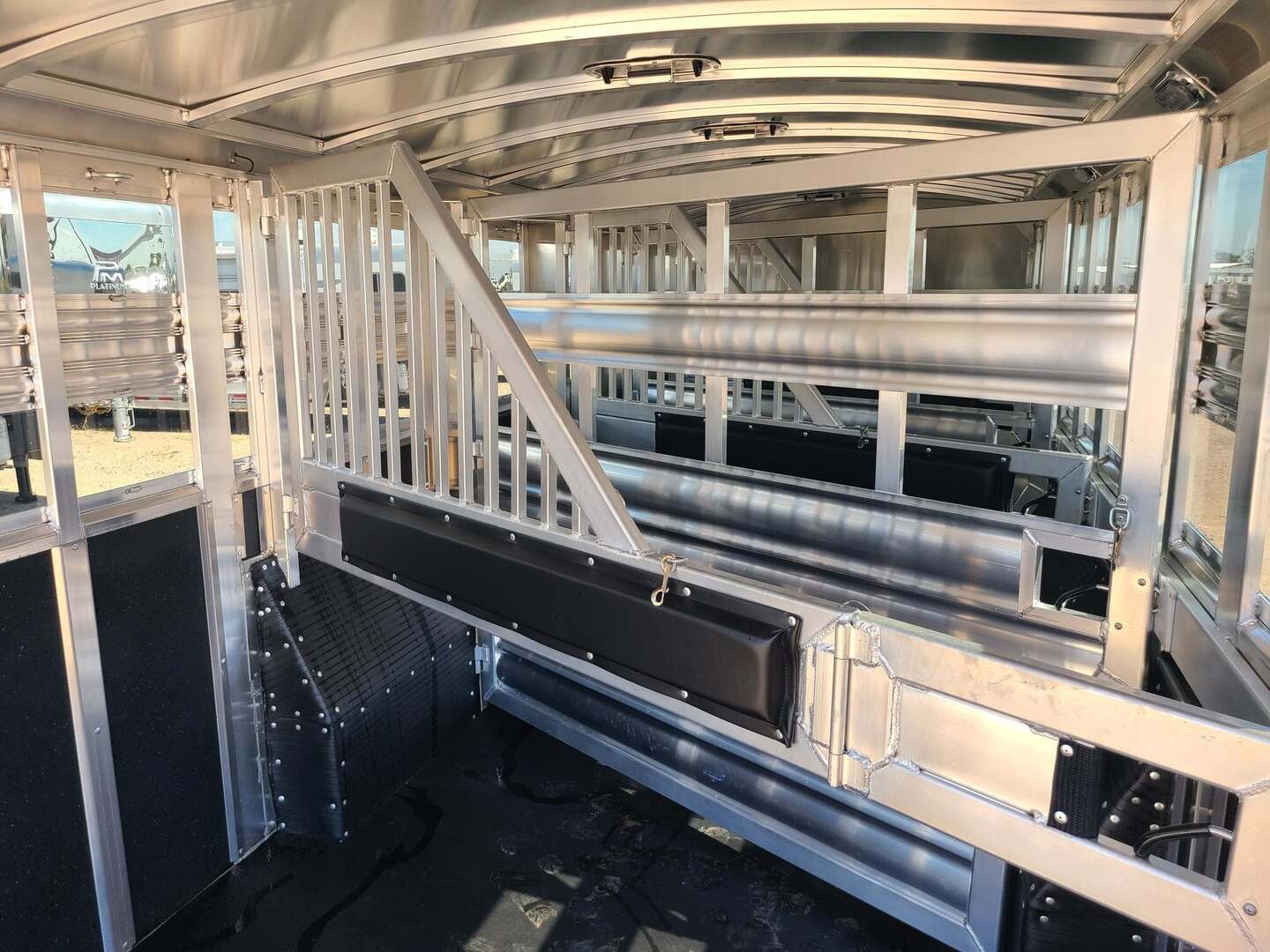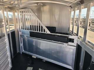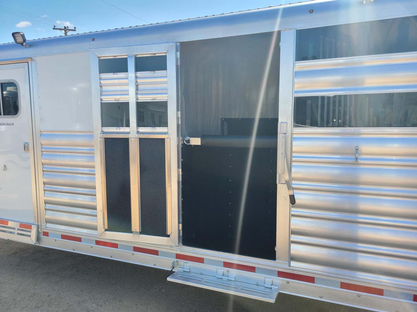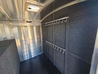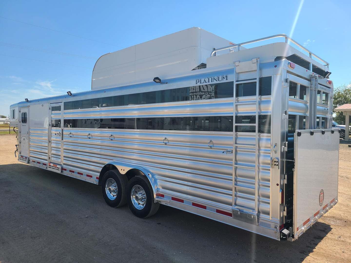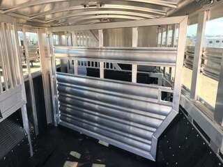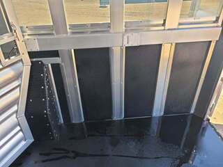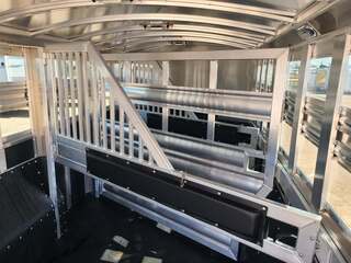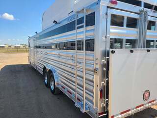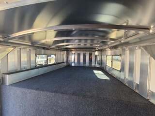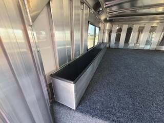 THIS TRAILER IS ON ORDER AND WILL ARRIVE IN MARCH Platinum Coach 32’ Stock Combo 8 x 32 x 7 tall 4’6” straight wall front dressing room Carpeted bulkhead wall in dressing room with 20 hooks Lunar dome roof vent and clothes rod in dressing room Mid tack with 54” on driver side, 102” on curb side Full height spring loaded side ramp to mid tack 8 saddle racks, 8 blanket bars, 20 hooks in mid tack Large shelf over three brush trays in dressing room Three horse dividers, two center gates Baby panel on first divider Remove horse dividers to create 3 box stalls Full width spring loaded rear ramp Double rear doors with anti-rack hardware Rubber on side walls and rear gates to protect from kicks Plexiglas & Track on drive and passenger side Plexiglas storage tray on front of mid tack, above hooks LED Load lights x 7 on outside 7 lights on top rail 8’ hay pod with 4’ landing 5-two way roof vents in horse area 8000# axles with 17.5” Alcoa wheels & 18 ply tires x 5 Axles blocked 2” for additional ground clearance