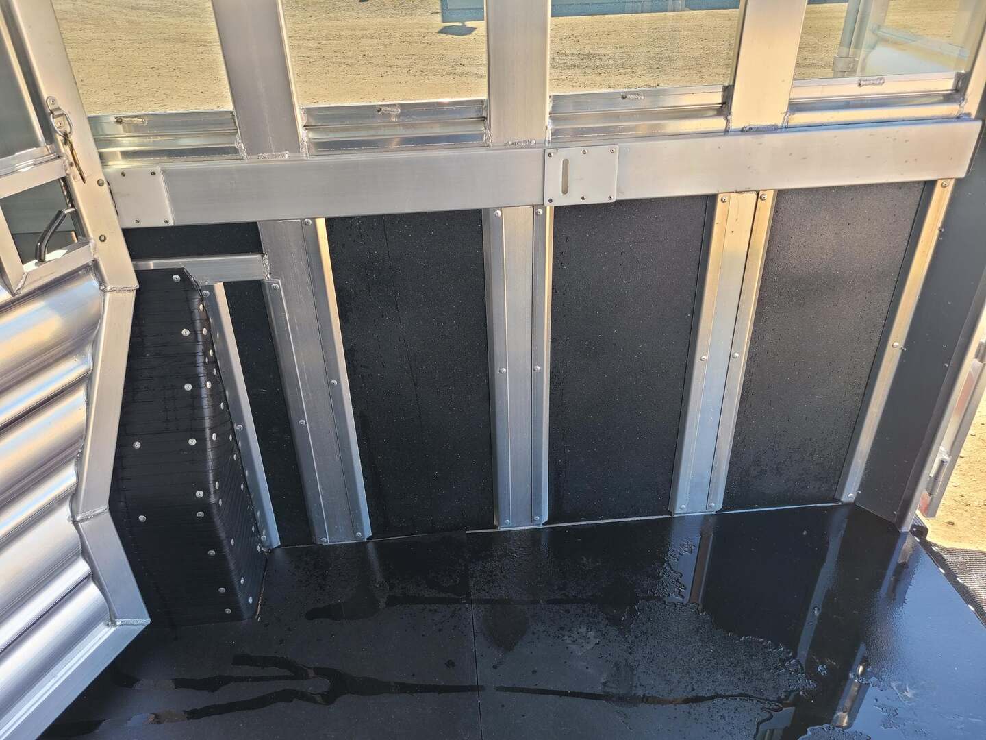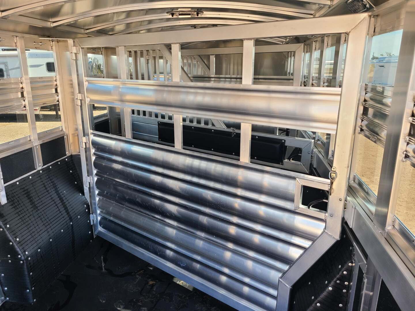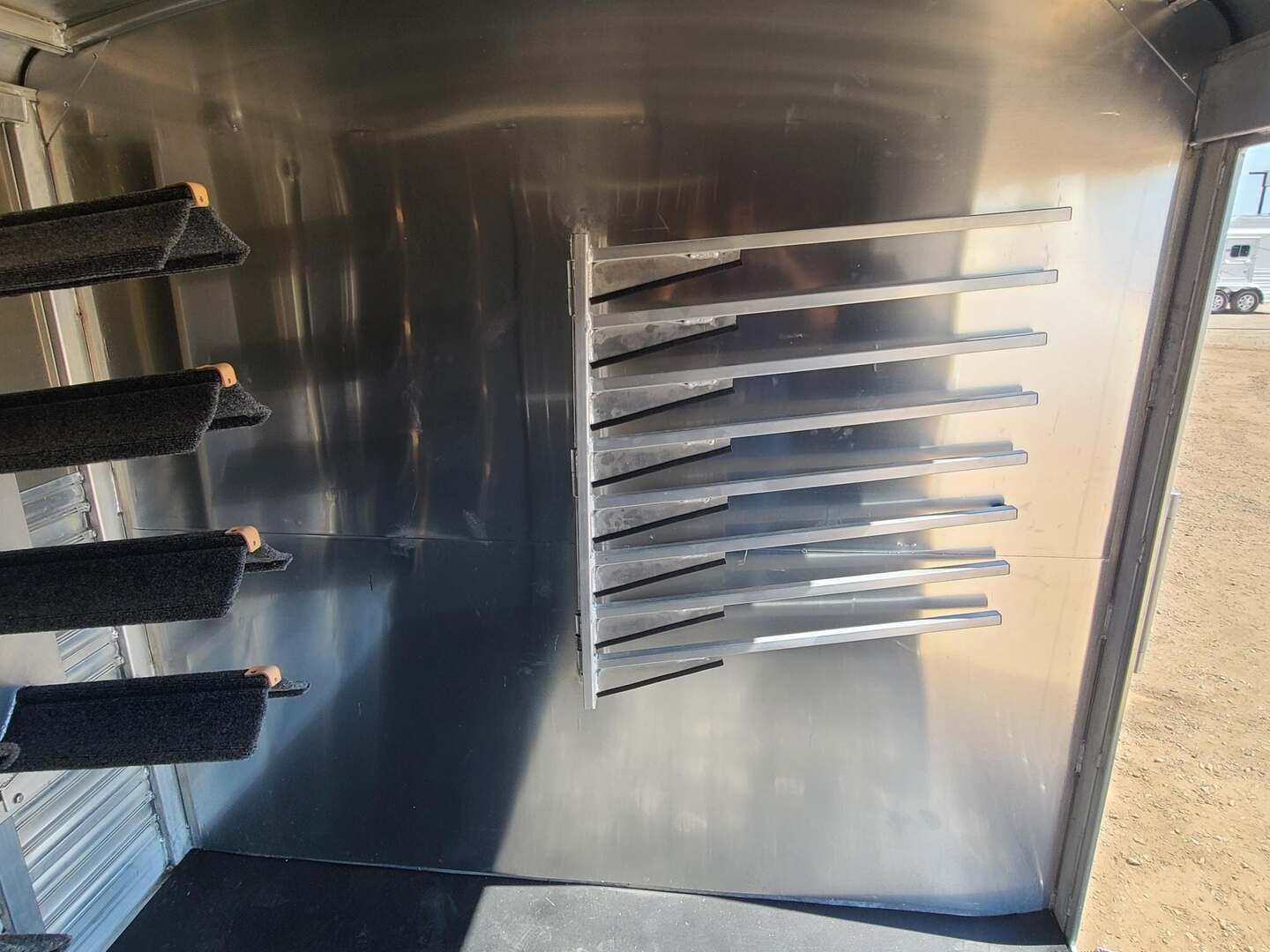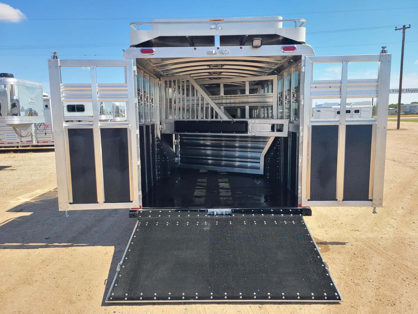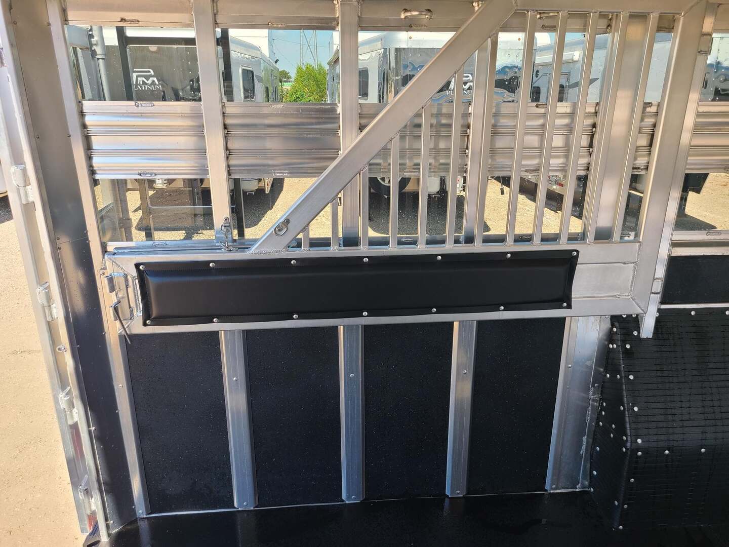 THIS TRAILER IS ON ORDER AND WILL ARRIVE IN MARCH Platinum Coach 32’ Stock Combo 8 x 32 x 7 tall 4’6” straight wall front dressing room Carpeted bulkhead wall in dressing room with 20 hooks Lunar dome roof vent and clothes rod in dressing room Mid tack with 54” on driver side, 102” on curb side Full height spring loaded side ramp to mid tack 8 saddle racks, 8 blanket bars, 20 hooks in mid tack Large shelf over three brush trays in dressing room Three horse dividers, two center gates Baby panel on first divider Remove horse dividers to create 3 box stalls Full width spring loaded rear ramp Double rear doors with anti-rack hardware Rubber on side walls and rear gates to protect from kicks Plexiglas & Track on drive and passenger side Plexiglas storage tray on front of mid tack, above hooks LED Load lights x 7 on outside 7 lights on top rail 8’ hay pod with 4’ landing 5-two way roof vents in horse area 8000# axles with 17.5” Alcoa wheels & 18 ply tires x 5 Axles blocked 2” for additional ground clearance