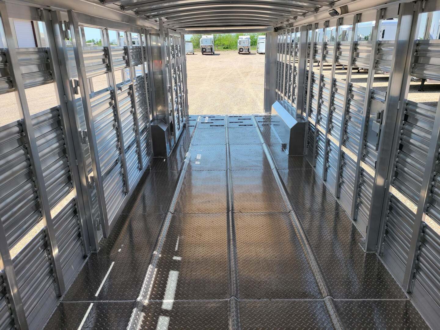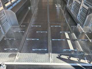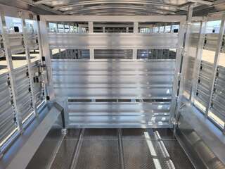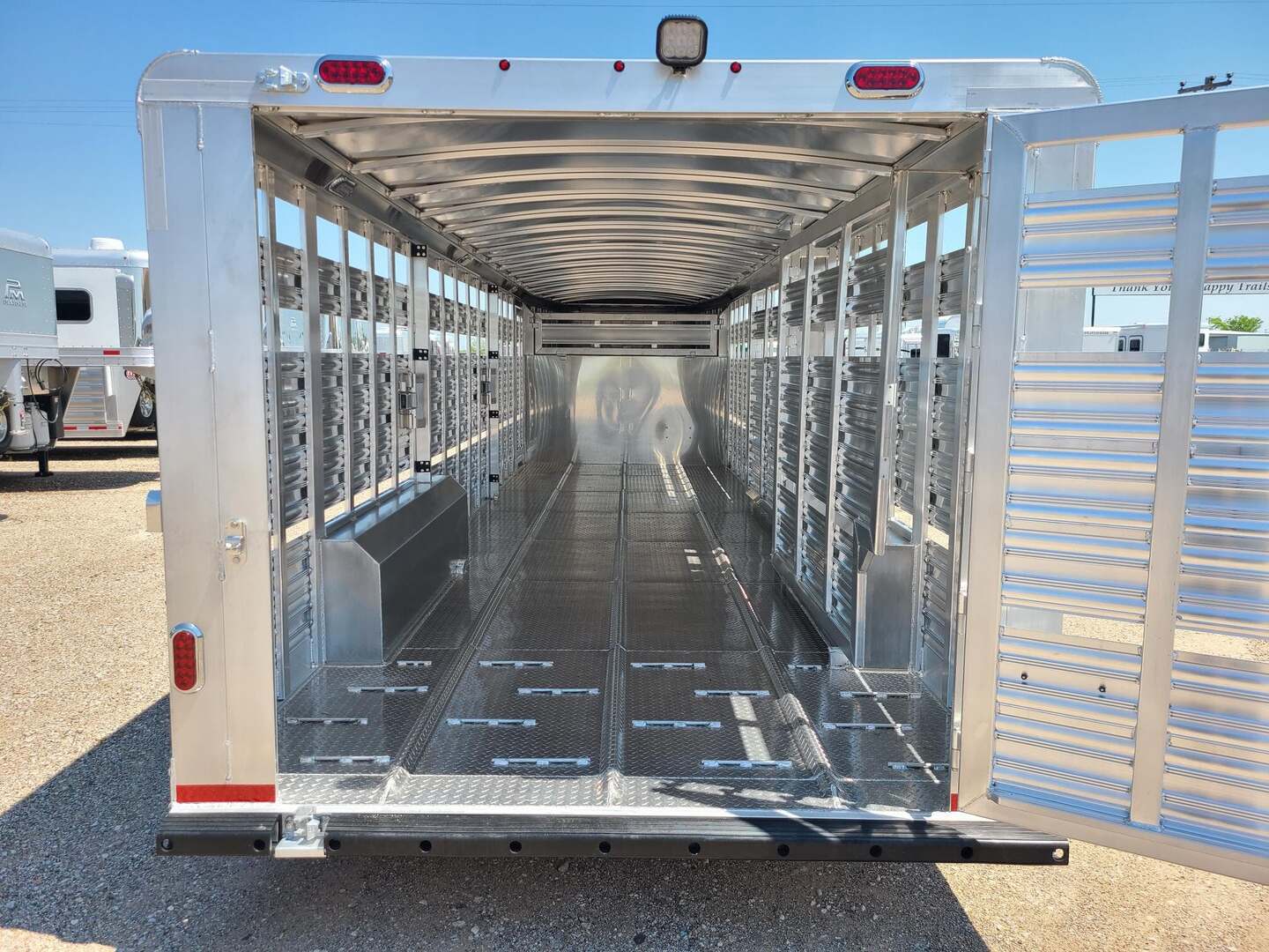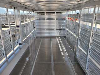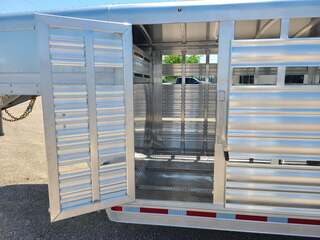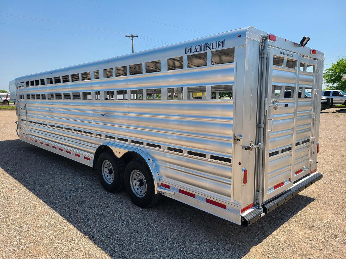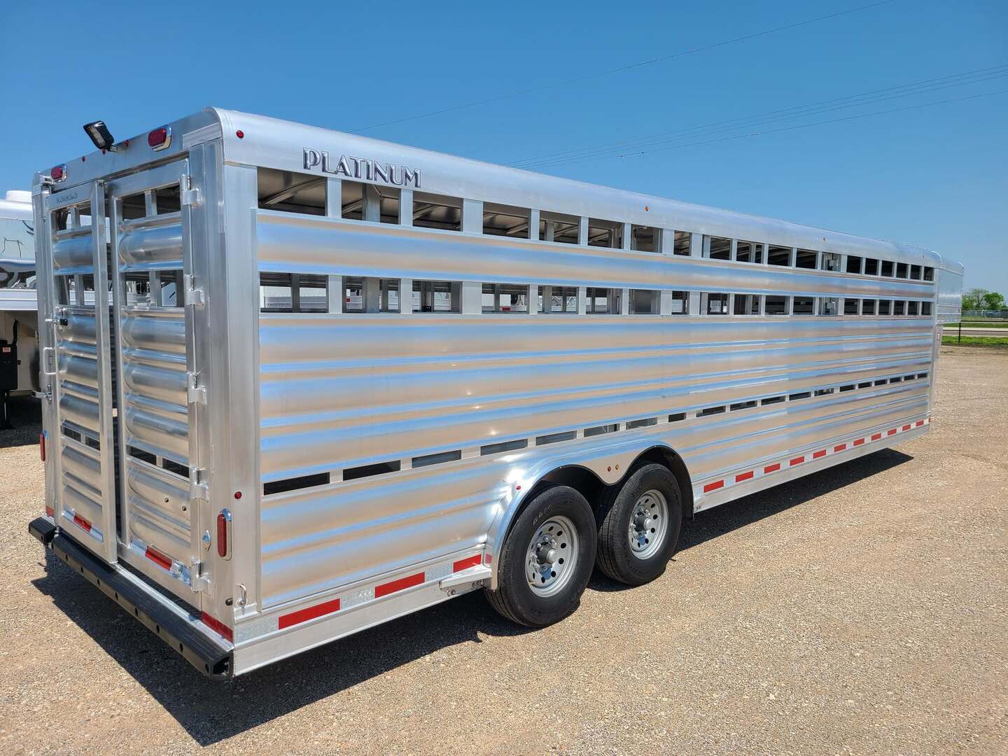 THIS TRAILER IS ON ORDER AND WILL ARRIVE IN APRIL Platinum Coach 28’ Stock Trailer 2-8,000# AXLES Mill Finish skin on neck sides 8 WIDE X 6’6” TALL 14 ply tires and spare Corrugated floor and corrugated ribs at rear 4’ Three 112” sections Slider on rear gate Stock escape door on driver side 5 Round LED clearance lights LED load light at rear 2” air crack 22” off floor