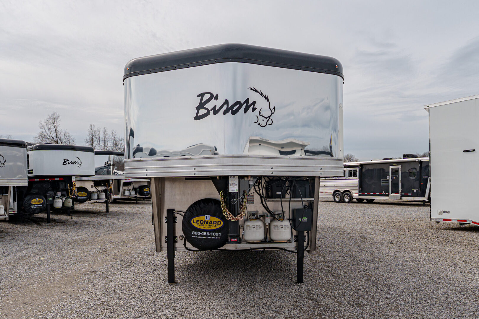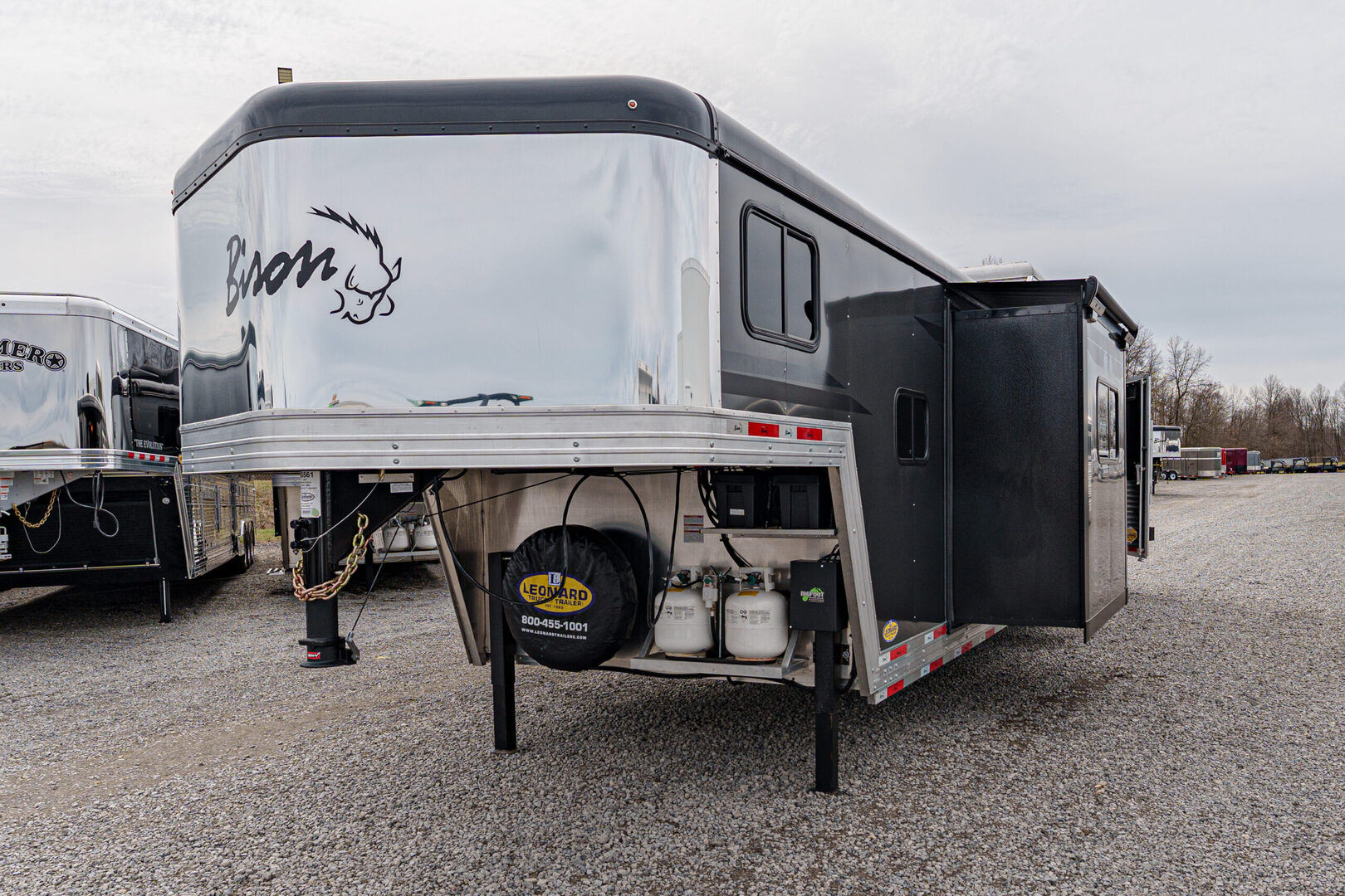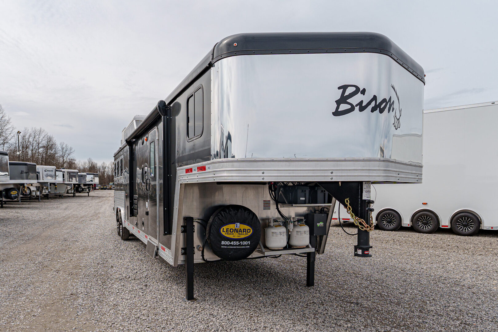 View Inventory: https://leonardtrailers.com/inventory/45561 Stock# 45561 New 2026 Bison SV8313BS Gooseneck Horse Trailer With Living Quarters Model:TH809B15 Warranty: 1yr- Exterior Paint (Peeling& Fading) 2yr- Components, Assembilies, Systems 6yr- Structrual As Long As You Own The Trailer-Pressure Treated Lumber Floor in Horse Area Packages & Panels Rear Side Load Door Package Brite Nose – Front Panel Trailer Options Silver Exterior Brite Dip Overlay, Full Length 7000# Axles (STD) G-Tire / Aluminum Rim, ST235/85R16 8 Lug – Black Hydraulic Jack, Dual Legs 4500w Generator with Fuel Tank Hay Pod (8W only) with Lined & Insulated Horse Area Ceiling Mangers – 3H / 2 Stall Stud Wall Step (@ Escape Door) HD Drop Down Windows (Head/Butt Side) Horse Fans (Per Stall) Load Light Package (4 Total) Swing Out Saddle Rack (ILO Adj) – 8’ Wide Only Swing Out Blanket Bar Conversion Options Rustic Brown Interior Rustic Bison Cabinetry Sofa & Dinette Linoleum: Strata Max Pro Deep Timbers – Dark Mocha – 102” 15,000 BTU Air Conditioner, Ducted Water Heater (Gas/Elec DSI – 6 Gal, ILO Gas DSI) Stereo with Interior & Exterior Speakers Oven with 3 Burner Stove Awning, Powered with LED Light Strip 32” LCD TV with Locking Swing Arm Queen Mattress with Bedsheet Porcelain Toilet Fantastic Fan in Bathroom (ILO STD)   We offer outstanding financing options, accept trades, and can arrange nationwide NO HASSLE delivery! Inquire today for more information! (888) 333-6613 **We believe these specifications to be accurate. Any discrepancies are unintentional. Please verify information with a sales associate prior to purchase.** Stock Number:45561