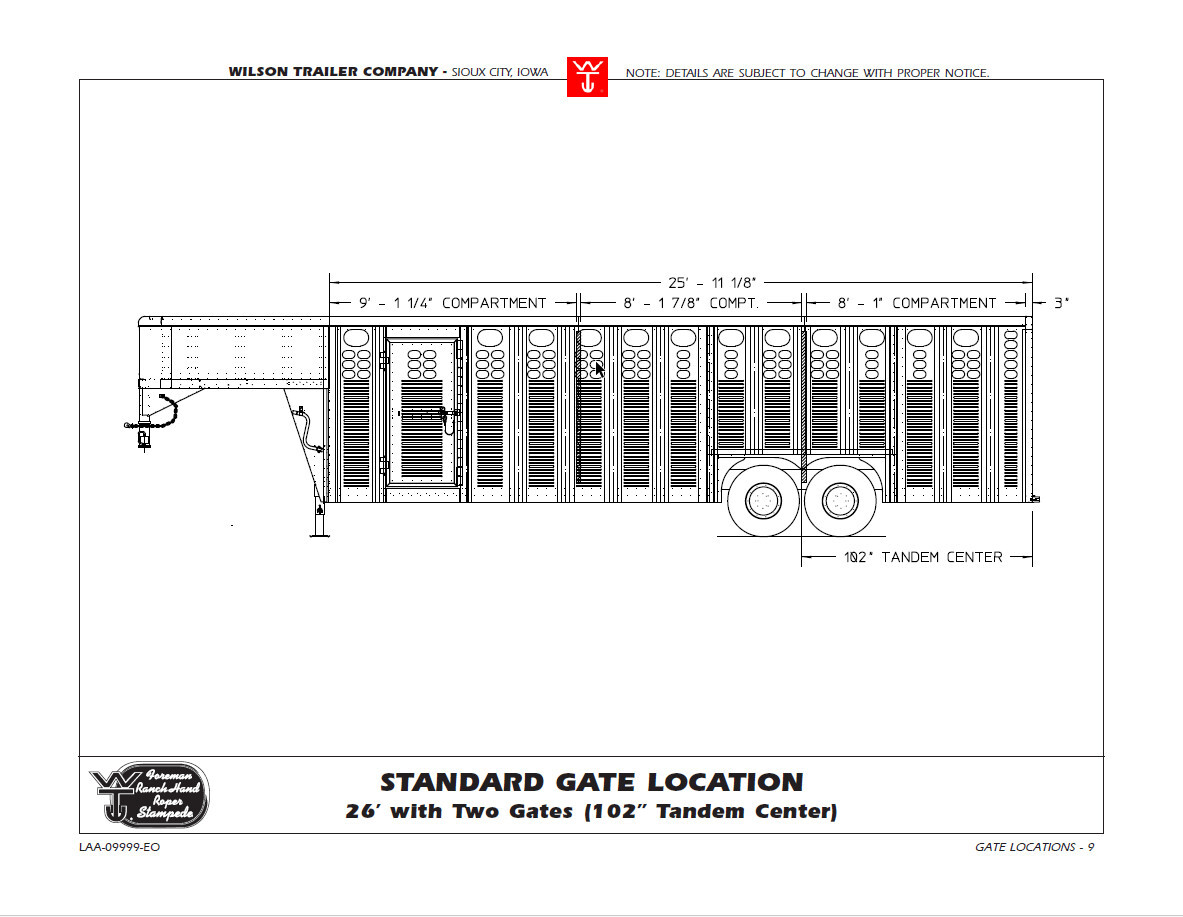 View Inventory: https://leonardtrailers.com/inventory/45563 Stock# 45563 New 2026 Wilson PSGN-5726 Gooseneck Stock Trailer Our most popular gooseneck stock trailer. The Ranch Hand punch style aluminum livestock trailer offers you the same reliable construction as our sales leading livestock semi-trailers in a stock trailer having all the essential features and a convenient but limited list of available options. Choose between natural aluminum sides or opt for the popular black or gun metal sides. Wilson goosenecks are made stronger to endure the toughest of demands, yet remain quieter and easier to pull for a longer period of time. Model: PSGN-5726 Warranty: 3yr- Limited Trailer Specifications Model: PSGN-5726 Ranch Hand Color: Black Length: 26 ft Width: 84 in interior, 7 ft 3 in overall (standard) Height: 6 ft 8 in interior Nose Style: (T) Tapered front Nose Color: Black Coupler: 2-5/16 in adjustable GVWR: 20,000 lb package (A) Axles: (2) 8,000 lb Dexter axles, 102 in wide (standard) Hubs: E-Z Lube Brakes: Electric Wheels: Alcoa 17.5 alum rating 130PSI ea Wheel Coating: Black coating on standard wheels (per each) Tires: ST215/75R17.5 Michelin x Multi T2 18 ply Tire Carrier: Standard Landing Gear: Standard 12,000 lb drop leg, spring-loaded Roof: Adhesive-attached stretched aluminum (standard) Side Pattern Style: (D) Floor: 0.110 corrugated T.P. w/ 9 in X-bar spacing (per ft) (standard) Nose Floor: Flat aluminum (standard) Running Boards: Full length (standard) Nose Gate Style: (D) Fold down Crowd Gate Style: (C) Full swing w/ inner slide (standard) Gate Hardware: Outside release Gate Location: Center of trailer Doors Rear Door Style: (A) LH roll up & full swing w/ swivel pulley  Rear Door Slam Catch: Standard Side Door: 33 in opening, driver side (standard)   We offer outstanding financing options, accept trades, and can arrange nationwide NO HASSLE delivery! Inquire today for more information! (888) 333-6613 **We believe these specifications to be accurate. Any discrepancies are unintentional. Please verify information with a sales associate prior to purchase.** Stock Number:45563