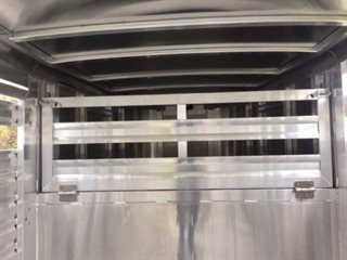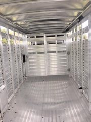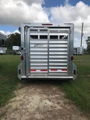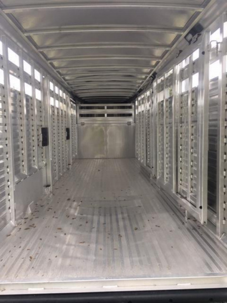 ALL aluminum construction with a single piece aluminum roof, (2) 7000lb. rubber torsion axles w/electric brakes LED lights inside and out, 2 full swing center cut gates and full swing rear door with slider. Rubber matts in livestock area (not pictured), Heavy duty drop gate w/spring loaded latches in neck for storage escape door and spare tire w/exterior mount.