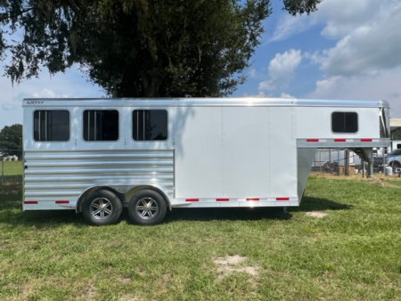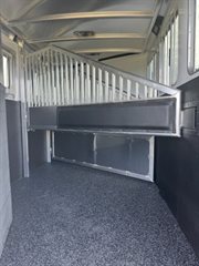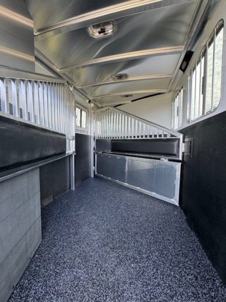 This 3H gooseneck trailer has lots of goodies. Drop windows on head side and large sliders on hip. All LED lighting inside and out, escape door, stud divider first stall, Rear 60/40 doors and airflow dividers. Horse area has poly flooring that absorbs 40% more shock so no shavings necessary. Roof vents over each stall along with 2 tie rings per stall and a Fully collapsible rear tack.