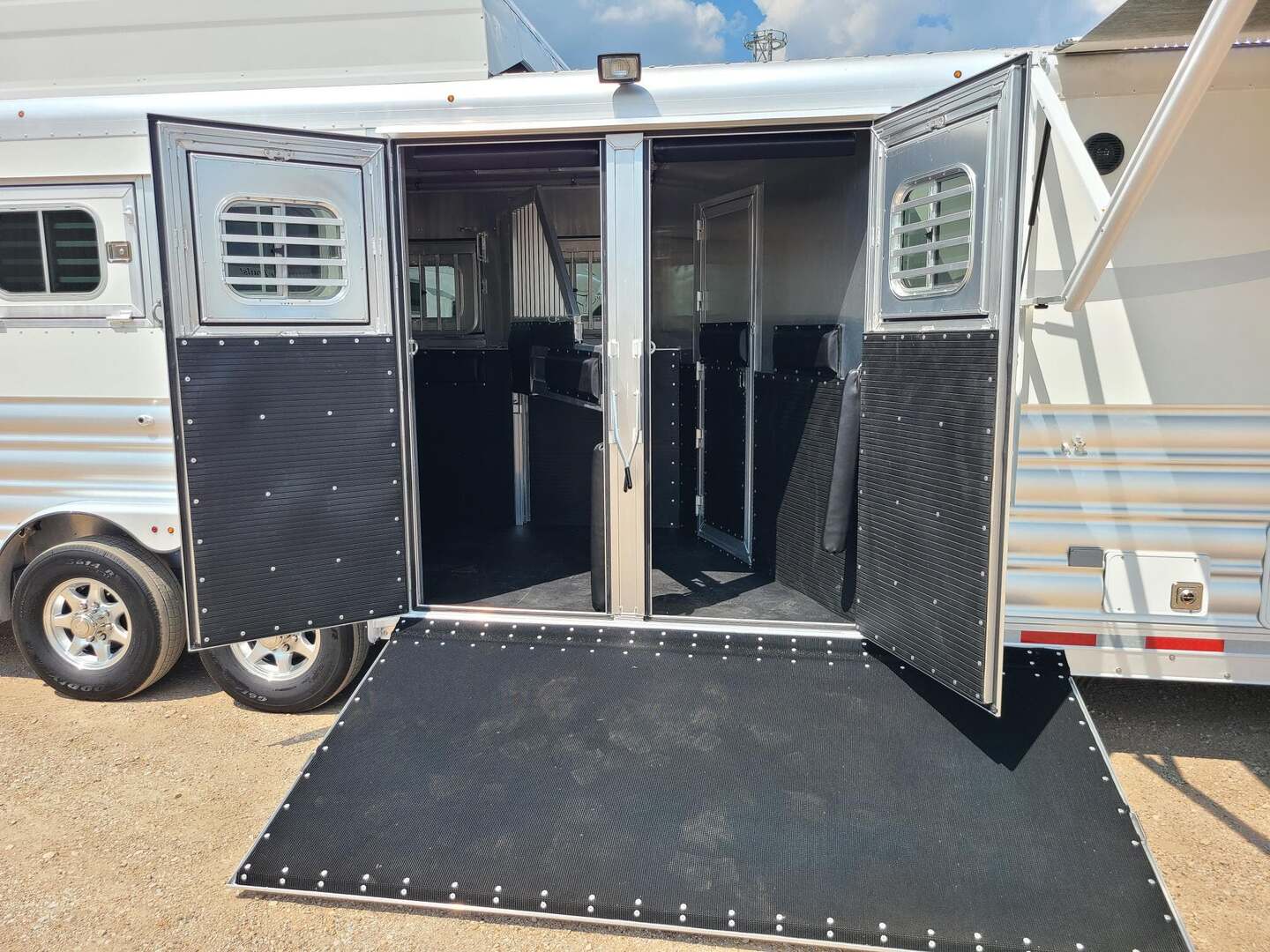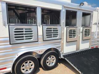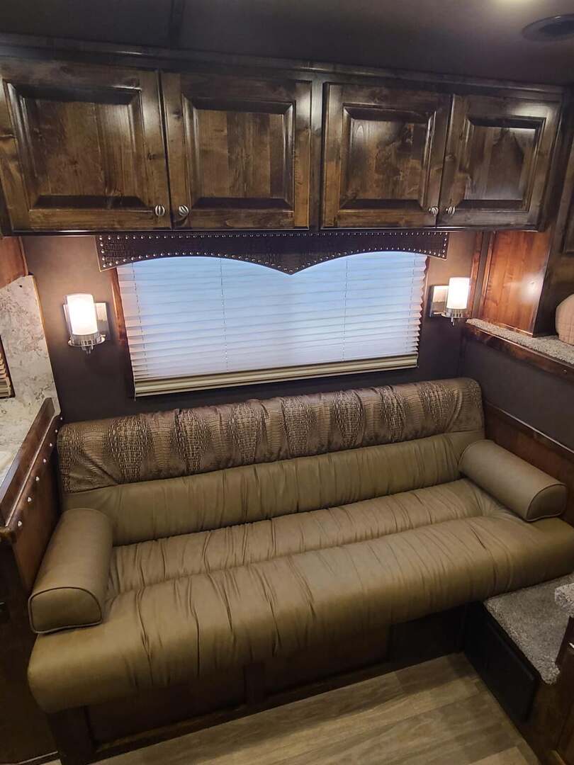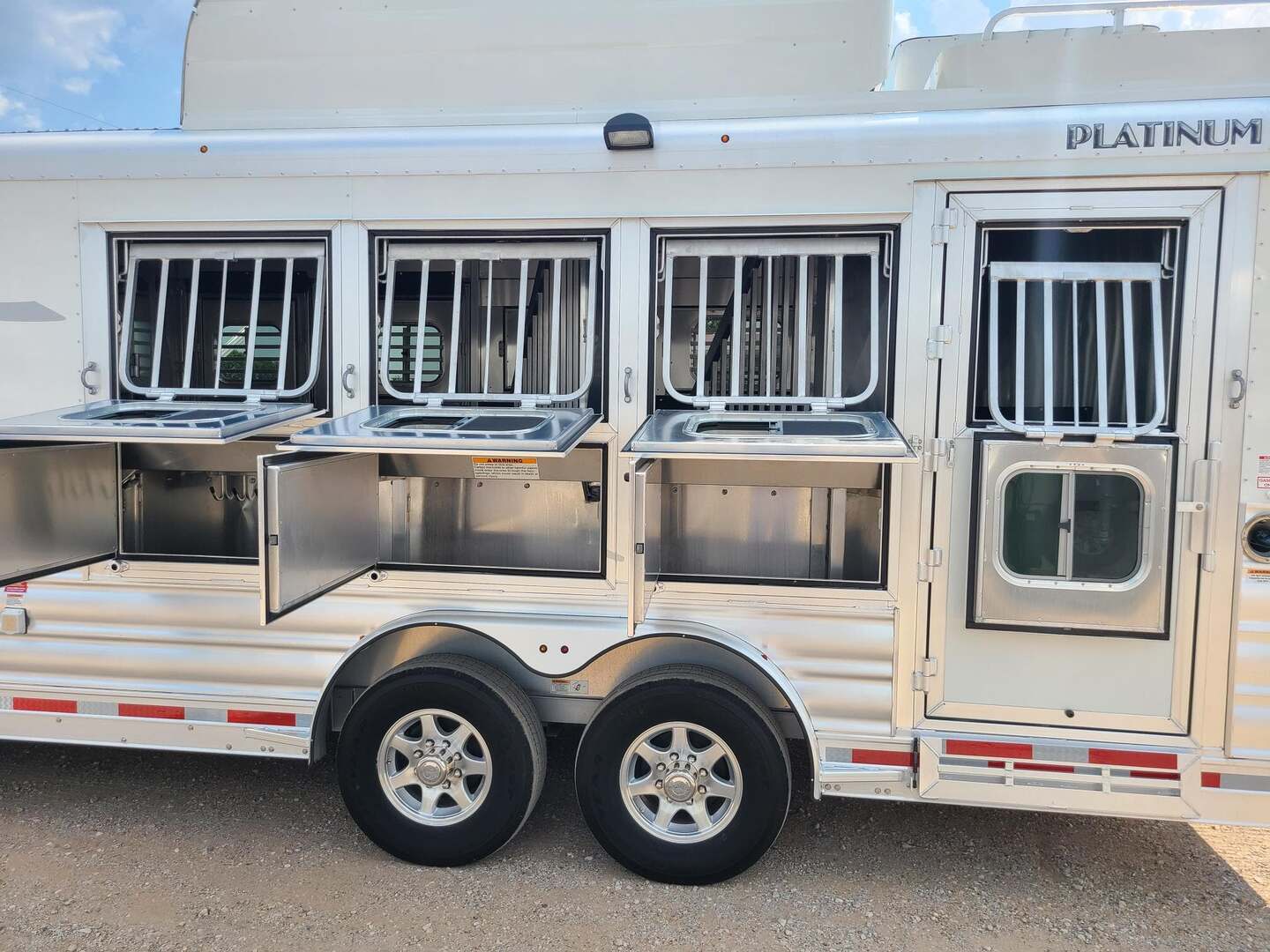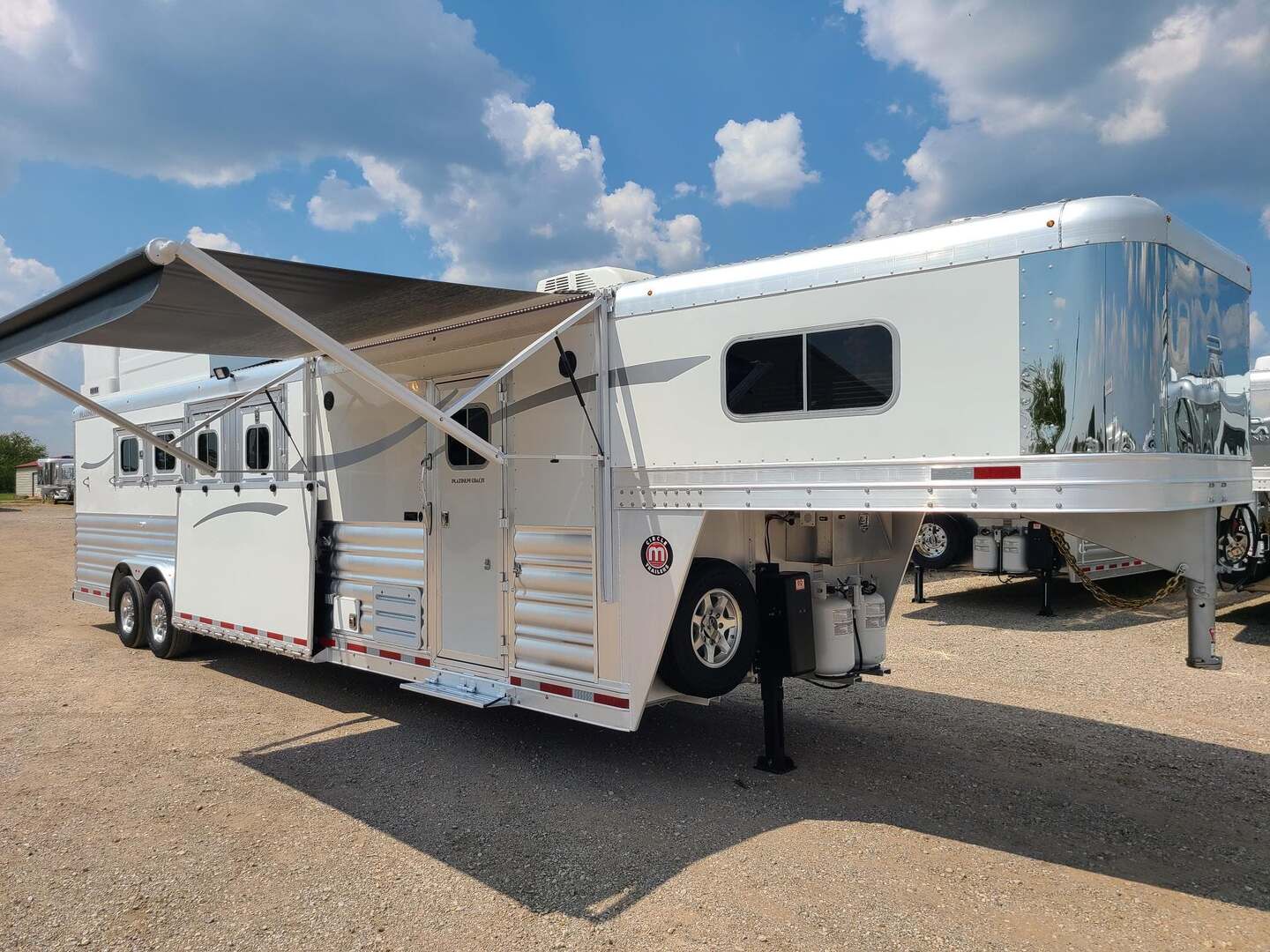 THIS TRAILER IS ON ORDER AND WILL ARRIVE IN JULY Platinum Coach 4 horse 12’8” Reverse Load Platinum Coach Features: 8 x 31 x 7’6” tall 4 horse 12’8” Short wall REVERSE load 8000# axles blocked 2” for additional ground clearance MAG ALUMINUM WHEELS & 14 ply Goodyear tires Power awning on passenger side Drop down windows on head and hip Drop down window bars on head side 6’ enclosed hay pod 3 mangers, 3 access doors Full width carpeted rear tack Rear tack with plenty of blanket bars, brush trays, boot splints, and bridle hooks Full width fold up step at rear tack and escape door Full width side ramp 52” tall for easy loading and unloading Removable center post in side to create 84” opening Telescoping divider on first divider to create more turning space Flow through dividers Stud divider with rubber on first stall (rear of trailer) Outlaw Conversion Select Series Features: Dark Knotty Alder Brio raised panel cabinetry Onan 4.0 MicroQuiet generator with 9 gallon fuel tank Single leg hydraulic jack 72” sofa sleeper with leather top roll Corner bench for additional seating Power awning on door side of LQ Two hat racks over R/V door 13,500 BTU A/C with heat pump Microwave over kitchen sink 20,000 BTU furnace 60 gallon fresh water tank 6 gallon propane / electric water heater 6.0 propane / electric refrigerator Double 30# propane bottles Double aluminum battery box with two batteries and on/off switch 32” LED Smart TV over refrigerator on swing out arm AM/FM/CD/DVD player with two exterior speakers Large double rod closet next to refrigerator 32” radius shower with power vent overhead Porcelain toilet in front of large double rod closet Two sinks, one in kitchen, one in bathroom One final thing...no one, I mean no one beats Outlaw Conversions. Period.