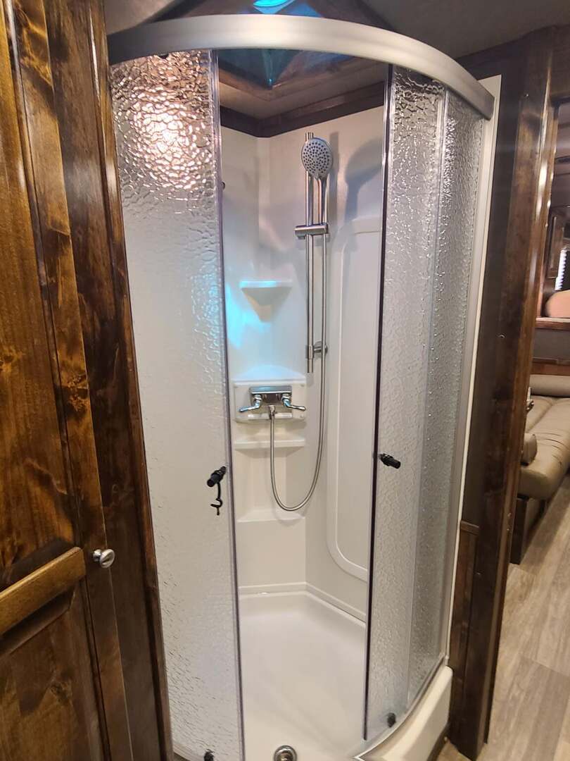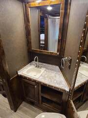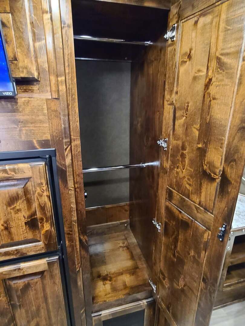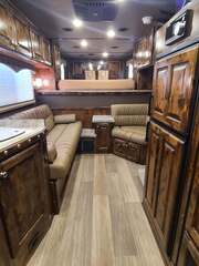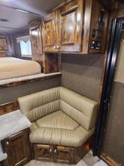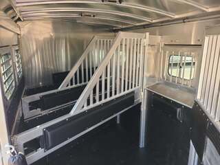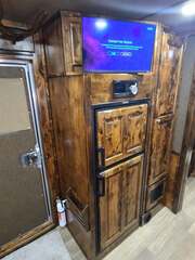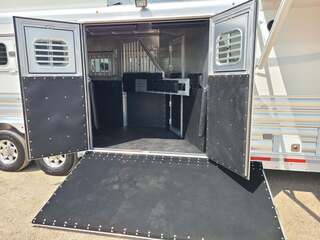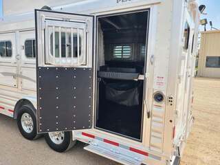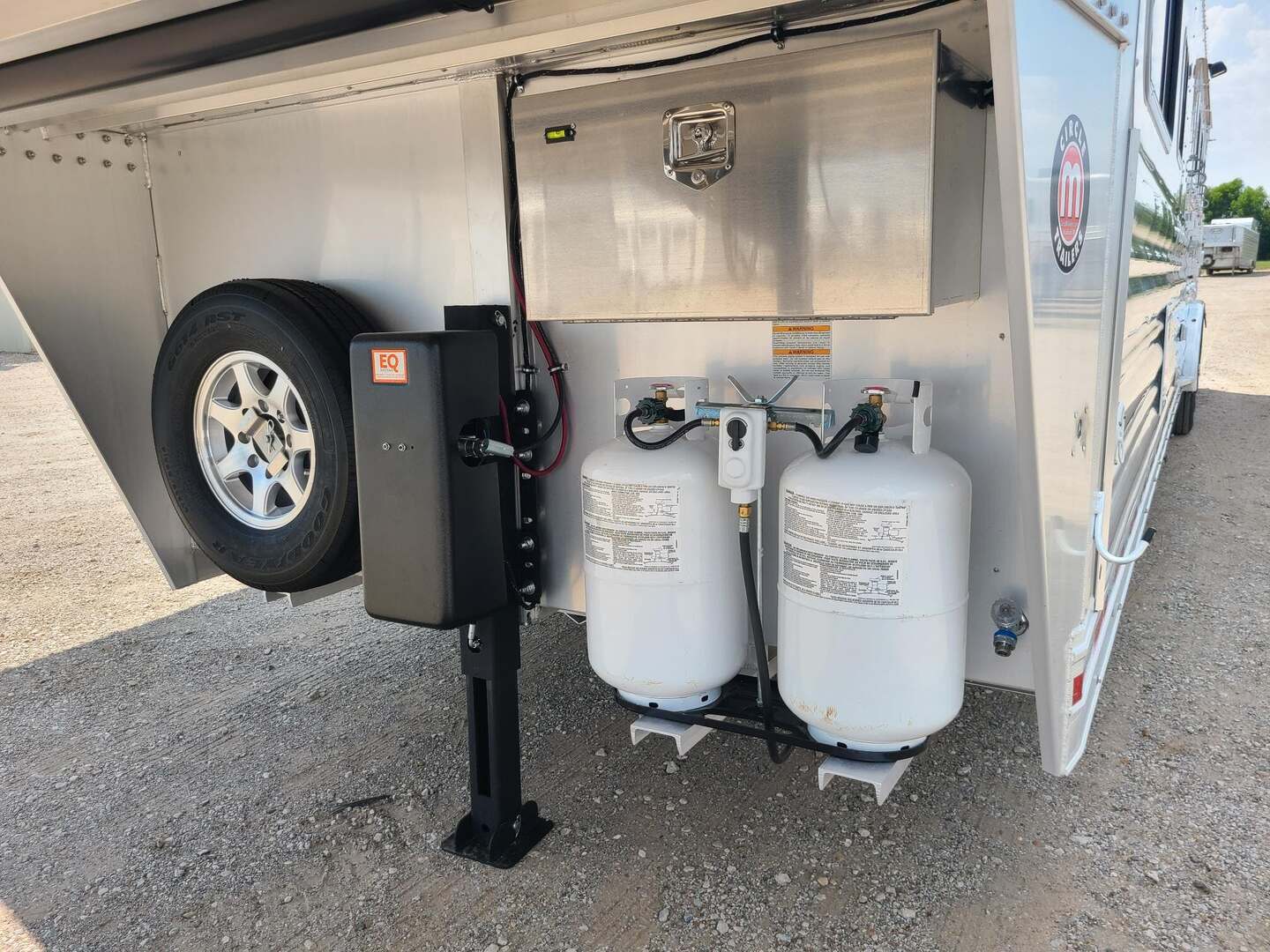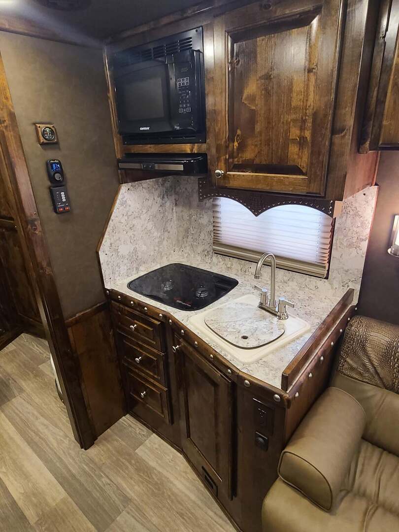 THIS TRAILER IS ON ORDER AND WILL ARRIVE IN JULY Platinum Coach 4 horse 12’8” Reverse Load Platinum Coach Features: 8 x 31 x 7’6” tall 4 horse 12’8” Short wall REVERSE load 8000# axles blocked 2” for additional ground clearance MAG ALUMINUM WHEELS & 14 ply Goodyear tires Power awning on passenger side Drop down windows on head and hip Drop down window bars on head side 6’ enclosed hay pod 3 mangers, 3 access doors Full width carpeted rear tack Rear tack with plenty of blanket bars, brush trays, boot splints, and bridle hooks Full width fold up step at rear tack and escape door Full width side ramp 52” tall for easy loading and unloading Removable center post in side to create 84” opening Telescoping divider on first divider to create more turning space Flow through dividers Stud divider with rubber on first stall (rear of trailer) Outlaw Conversion Select Series Features: Dark Knotty Alder Brio raised panel cabinetry Onan 4.0 MicroQuiet generator with 9 gallon fuel tank Single leg hydraulic jack 72” sofa sleeper with leather top roll Corner bench for additional seating Power awning on door side of LQ Two hat racks over R/V door 13,500 BTU A/C with heat pump Microwave over kitchen sink 20,000 BTU furnace 60 gallon fresh water tank 6 gallon propane / electric water heater 6.0 propane / electric refrigerator Double 30# propane bottles Double aluminum battery box with two batteries and on/off switch 32” LED Smart TV over refrigerator on swing out arm AM/FM/CD/DVD player with two exterior speakers Large double rod closet next to refrigerator 32” radius shower with power vent overhead Porcelain toilet in front of large double rod closet Two sinks, one in kitchen, one in bathroom One final thing...no one, I mean no one beats Outlaw Conversions. Period.