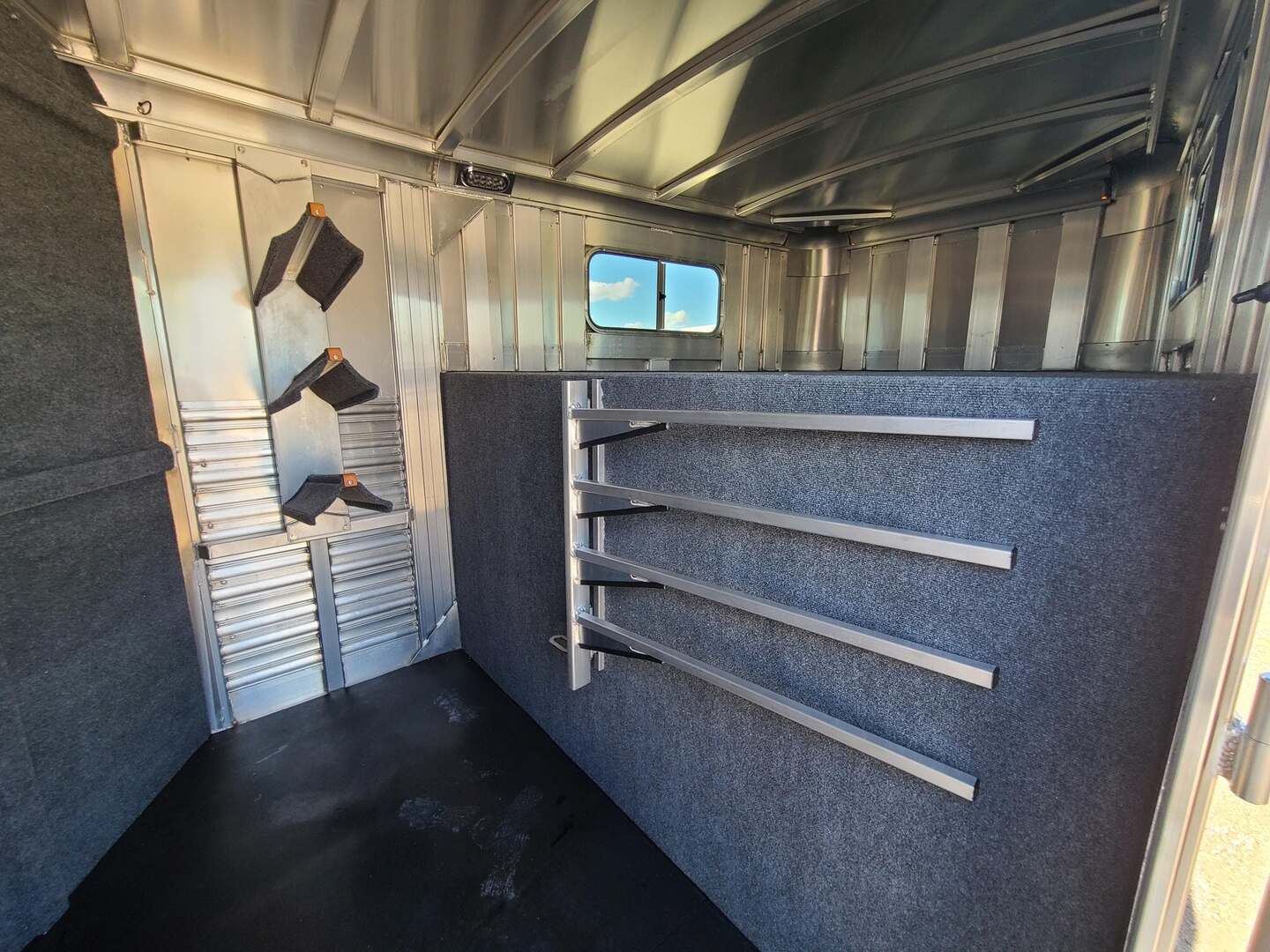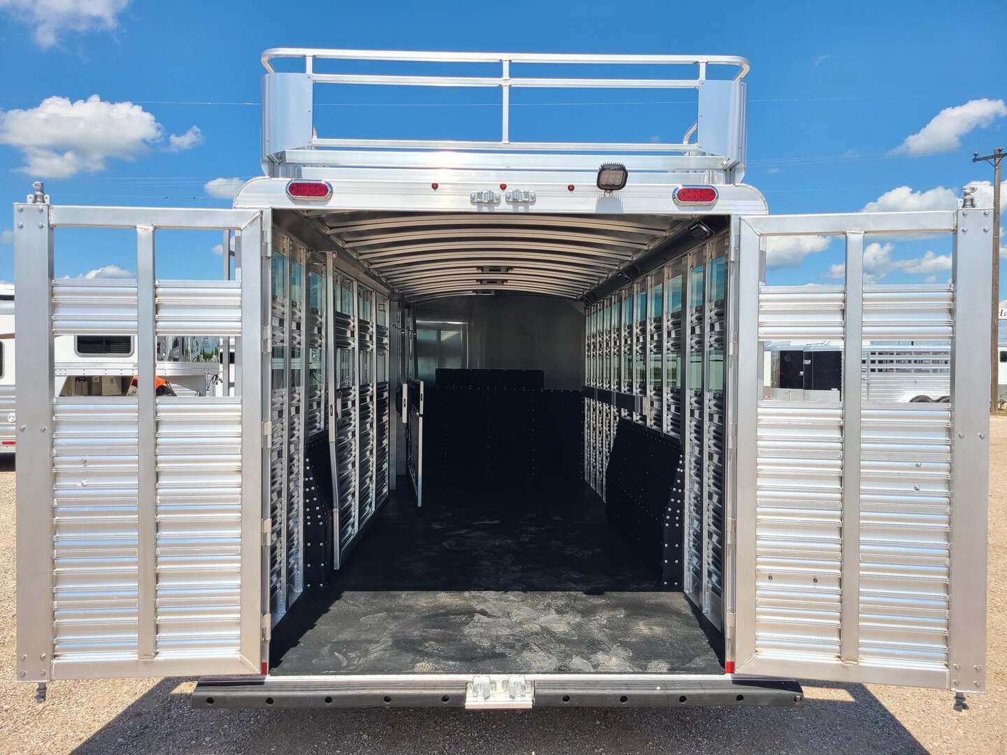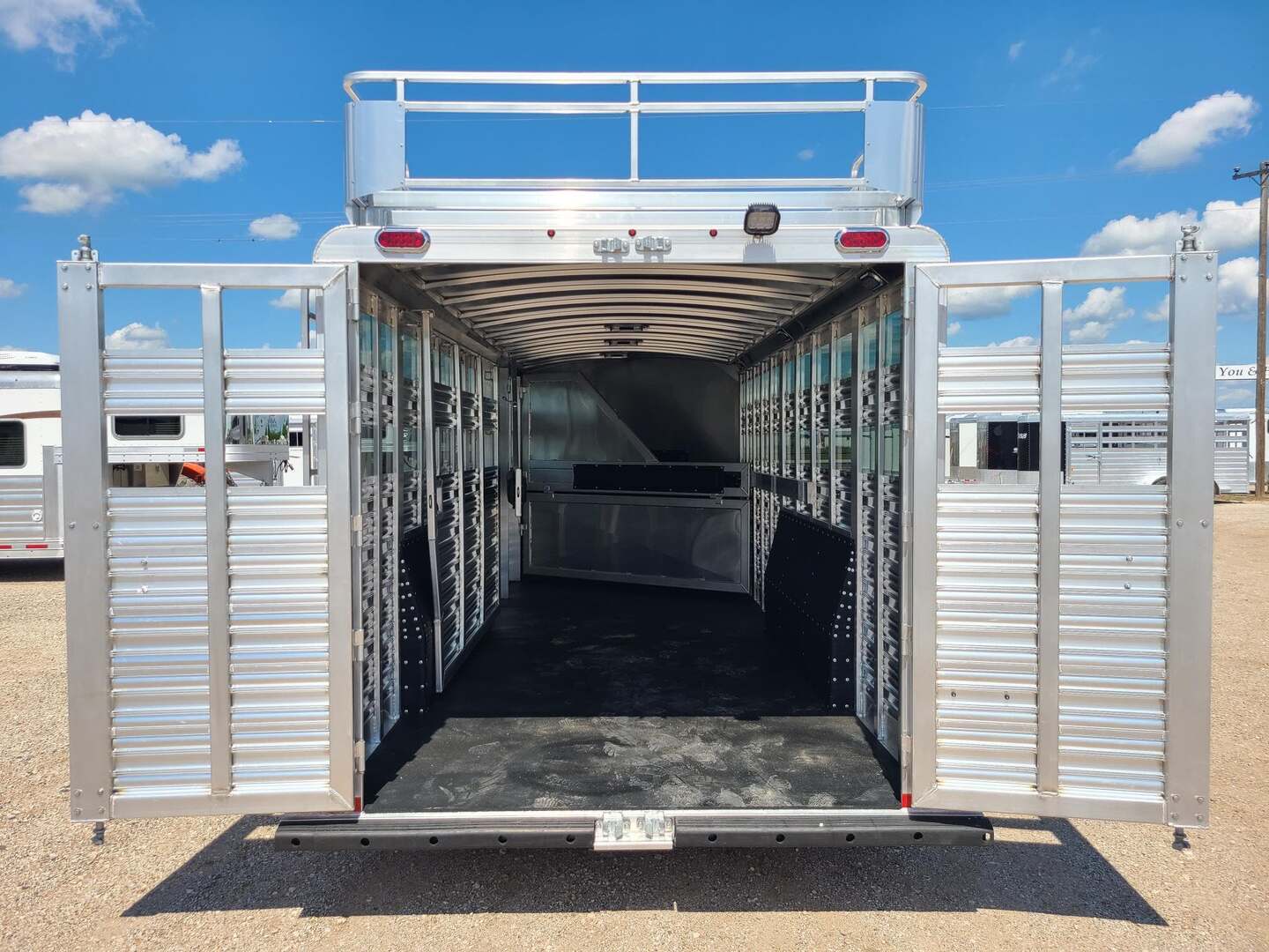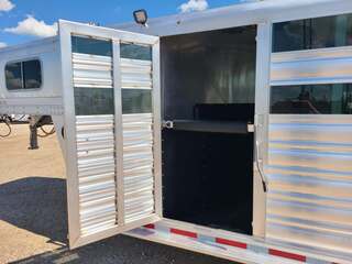 THIS TRAILER IS ON ORDER AND WILL ARRIVE IN MARCH Platinum 25’ Stock Combo 7’6” x 25 x 7 tall Mill Finish exterior skin Extremely versatile trailer!! 1st gate is horse divider with removable panel at bottom 2nd gate is normal horse divider 3rd gate is slatted center partition, keep horses and cattle separate!! Haul roping steers & 3 horses Haul 6 horses, 8 cows, haul whatever!! Plexiglas & Track on both sides of trailer 6’ hay rack & ladder 6 saddle racks, 15 bridle hooks, and 4 blanket bars in tack room!! 3 tier swing out saddle rack keeps all of your tack easily to grab!! Carpeted bulkhead wall to protect your gear Rubber mats in 30” dressing room floor for easy cleaning One brush tray and five hooks on tack door Double rear gates with double anti rack hardware Stock escape door on driver side 4 LED load lights and plenty of outside tie rings Two roof vents for maximum ventilation!! Ready for anything!!!