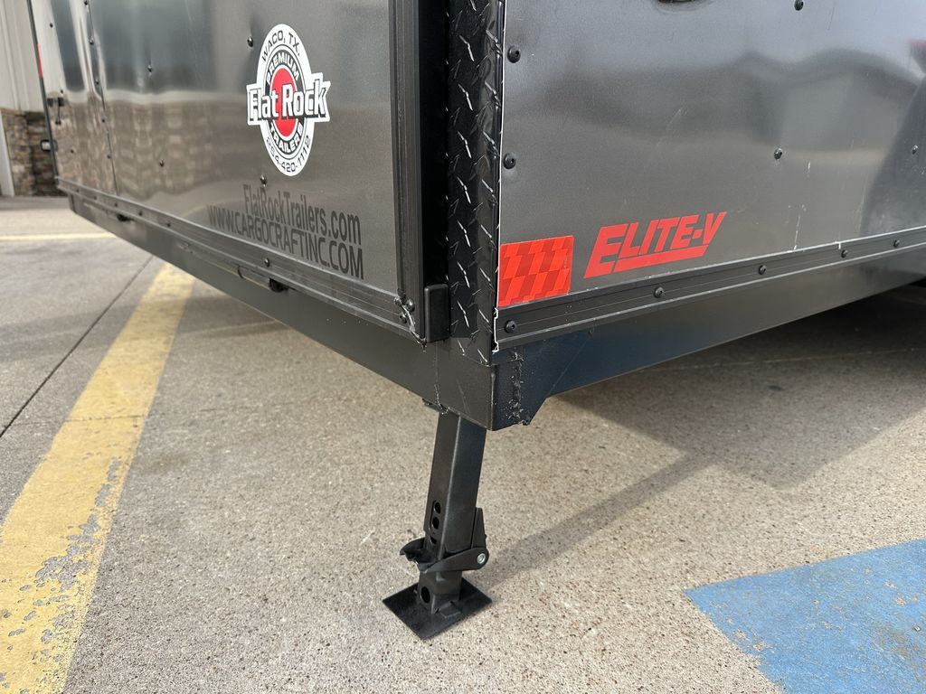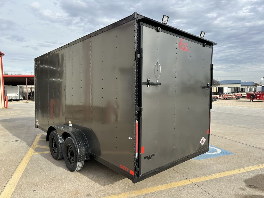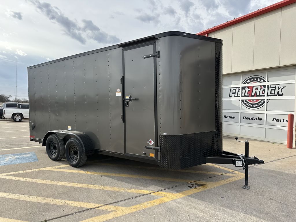 7’ x 18’ Tandem Elite V Nose Cargo 2 x 3,500 lb. EZ Lube 4 in Drop Brake Axles Triple Tongue V Flat Roof System 2 5/16 in Coupler 205 75 R 15 in Radials (Black Mods, Caps, and Lugs) 2K Jack Non Powered Roof Vent Intergraded Hitch Design Stabilizer Jacks (Rear) ATP Post Cover on V 30 in Side Door Upgrade w/ Cam Bar and RV Lock Aluminum Wrap on Rear Door Jambs (Blacked Out) 24 in ATP Front Stone Guard (Blacked Out) ATP Aluminum Fenders (Blacked Out) 7’ Interior Height Spare Tire Mount Spring Assist Rear Ramp Door 3/4 in Gray Sealed Painted Floors 3/8 in Plywood Walls 2 x 12 Volt LED Interior Lights w/ Switch 2 Rear Load Lights Empty Weight: 2,400 lbs. GVWR: 7,000 lbs. Carrying Capacity: 4,600 lbs.