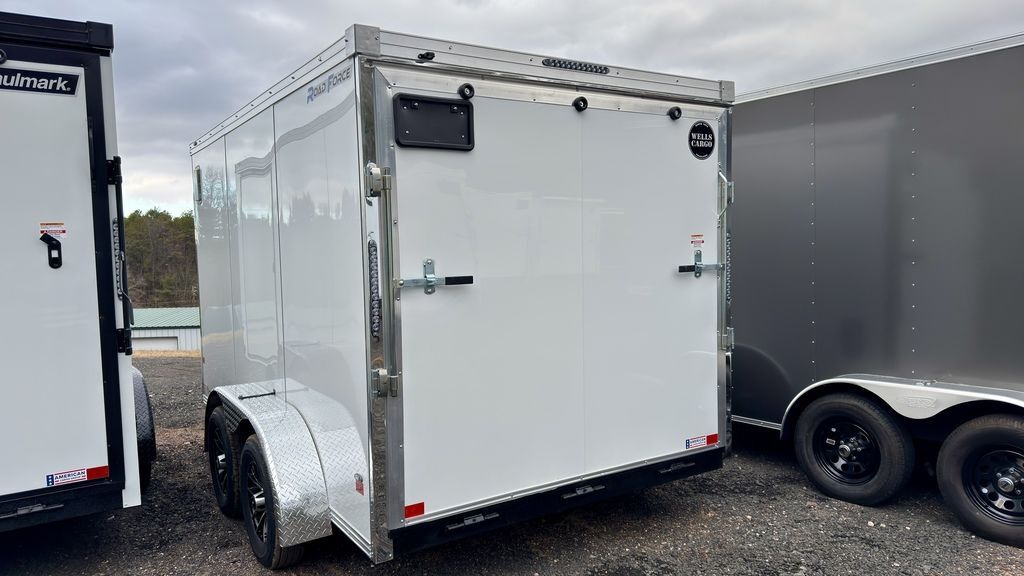 Connecticut Trailers features the following options for this Wells Cargo Trailer: • 6’6” Inside Height • 3/8” Plexcore Sidewall Liner • ArmoTech on A-Frame and Rear End Rail • 3/4” Plexcore Decking • Bonded Exterior Sidewall • 5,000# Square D-Ring w/Welded Plate • 5,000# Rear Ramp Door w/ Ramp Extension • 2026 Wells Cargo Road Force V-Front RFV712T2WHEN YOU NEED A RELIABLE, EVERYDAY WORKHORSE!Whatever the job. Wherever you go. Whenever duty calls. A Road Force® cargo trailer has the muscle to move! Designed and built by Wells Cargo®, the company that pioneered the cargo trailer industry over 65 years ago, the feature-rich Road Force® delivers a whole new level of value. From the rugged triple 16’s (OC) tubular steel frame to the LED tail lights, the Road Force® is no stranger to quality. So for the price of an ”ordinary” trailer, you can step up to the quality and value of the extraordinary Road Force®.Features may include:Entire Chassis Undercoated3/4” PlexCore High-Performance Interior Decking3/8” PlexCore High-Performance Interior Sidewalls3-Year Limited Warranty36” Side Entry Door with Flush Lock15” Radial TiresLED Heavy-Duty Oval Clearance Lights16” OC Tube Vertical PostsE-Z Lube® HubsRear Ramp Door with Spring AssistElectric Brakes with Breakaway KitArmorTech on A-Frame and Rear End Rail16” Ramp ExtensionRadius Front/Round Roof w/ Silver Cap.080 Aluminum Top Wrap16” OC Tube Roof Bows1-Piece Aluminum Roof24” ATP Stoneguard.030 Aluminum Exterior Bonded (Smooth Appearance)Spring Axles12v LED Slim Line Tail LightsATP Jeep Fenders16” OC Floor Crossmembers