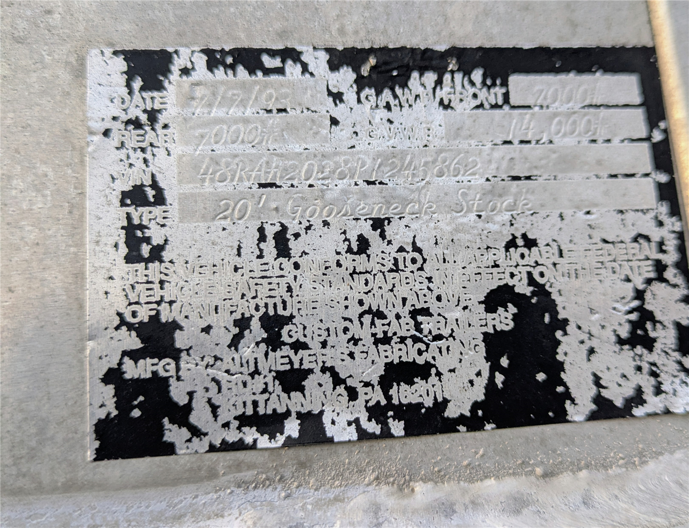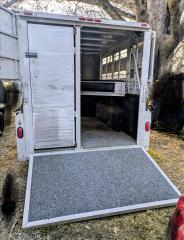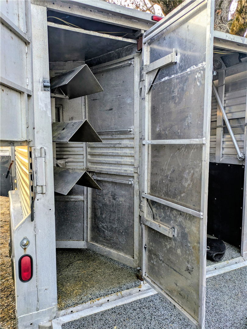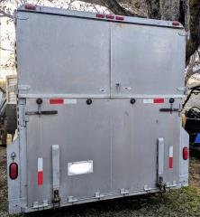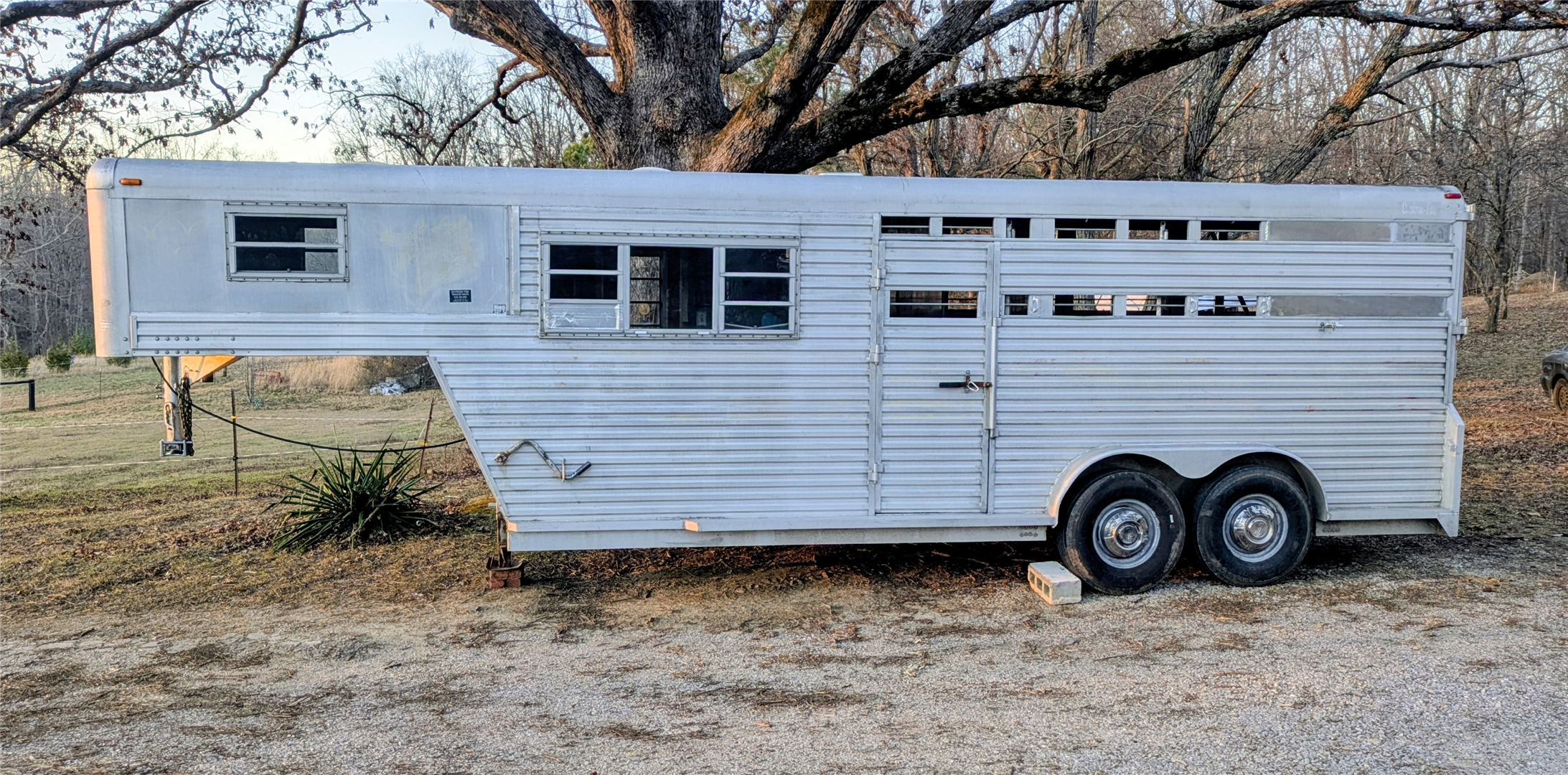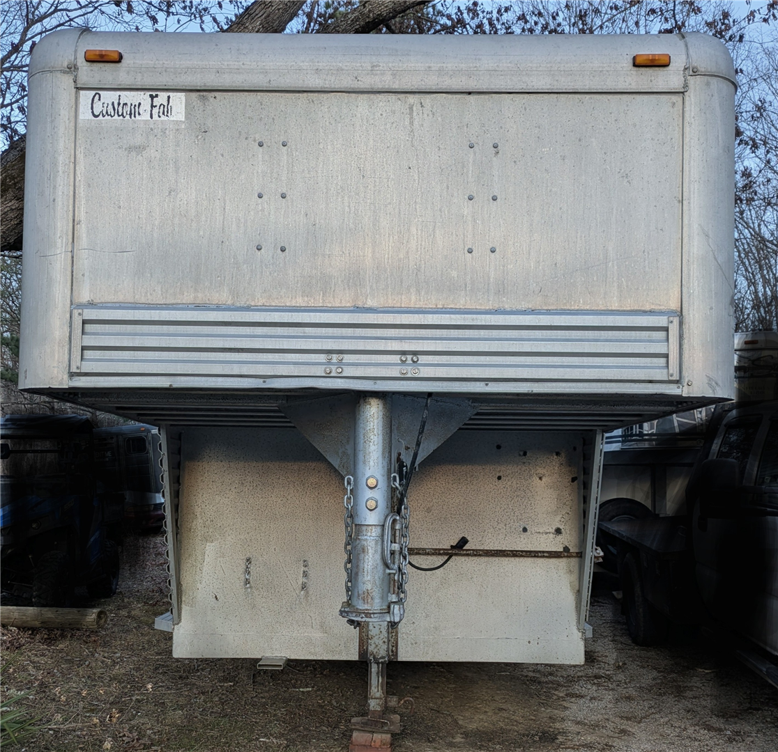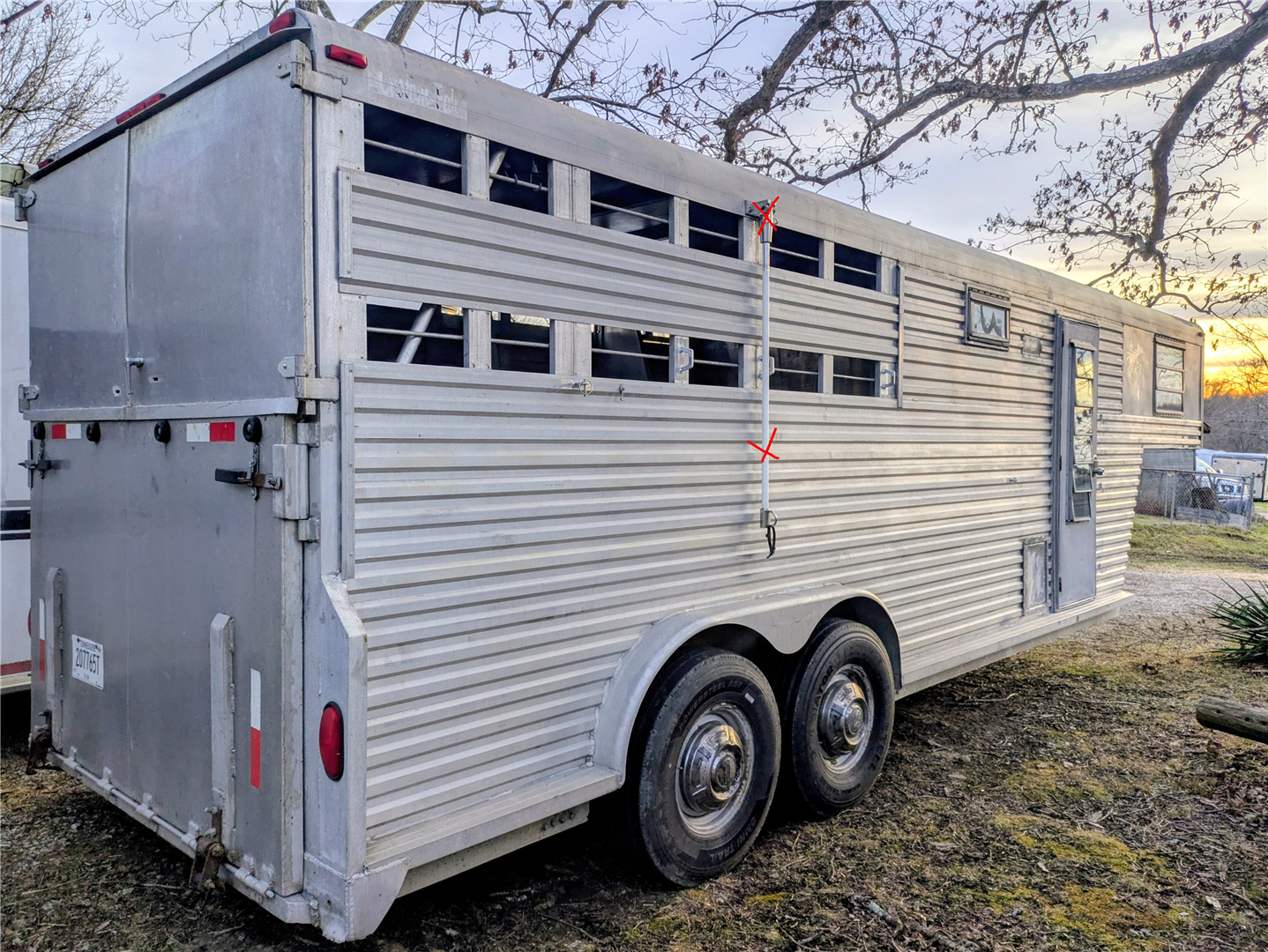 Well-built 1993 Custom Fab all-aluminum 3-horse slant stock trailer with a half tack in the back and weekender/dressing room up front.