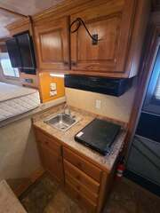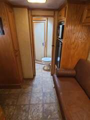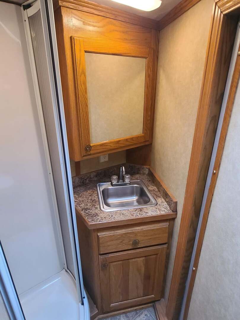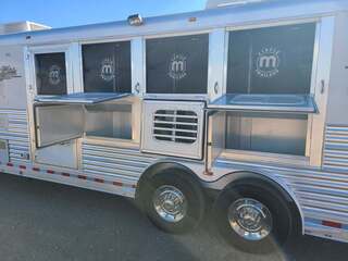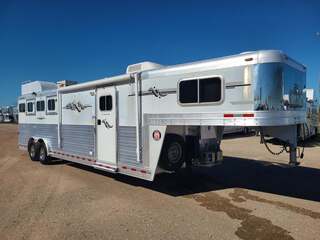 Platinum 4 Horse 9’ Shortwall by Cowboy Classic Platinum Coach features: 26’ long x 8’ wide x 7 tall 7000# axles with NEW 14 ply Goodyear tires Drop down windows on  head side with face screens Two drop down windows on rump wall Mangers w/ manger access doors and storage Escape door w/ feed bag at head 6 ft hayrack with ladder 2 way roof vents Cowboy Classic Features: Fully self contained LQ Soft touch ceiling and walls Light Knotty Alder cabinetry Overhead cabinetry Queen bed 5.5 Generac Guardian R/V generator with ONLY 590 hours NEW 3.0 12v refrigerator NEW microwave oven NEW 6 gallon propane water heater Two burner cooktop with cover 13,500 BTU A/C with heat strip 16,000 BTU furnace Stainless sink in galley and bath Porcelain Toilet 32” radius shower 28” LED TV mounted on swing arm AM/FM/CD/DVD player with exterior speakers Hydraulic jack Many more features......