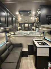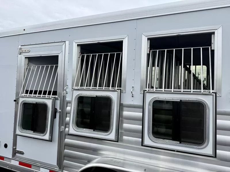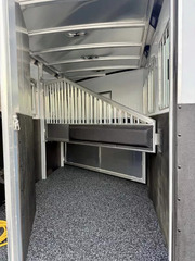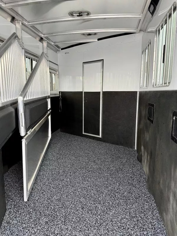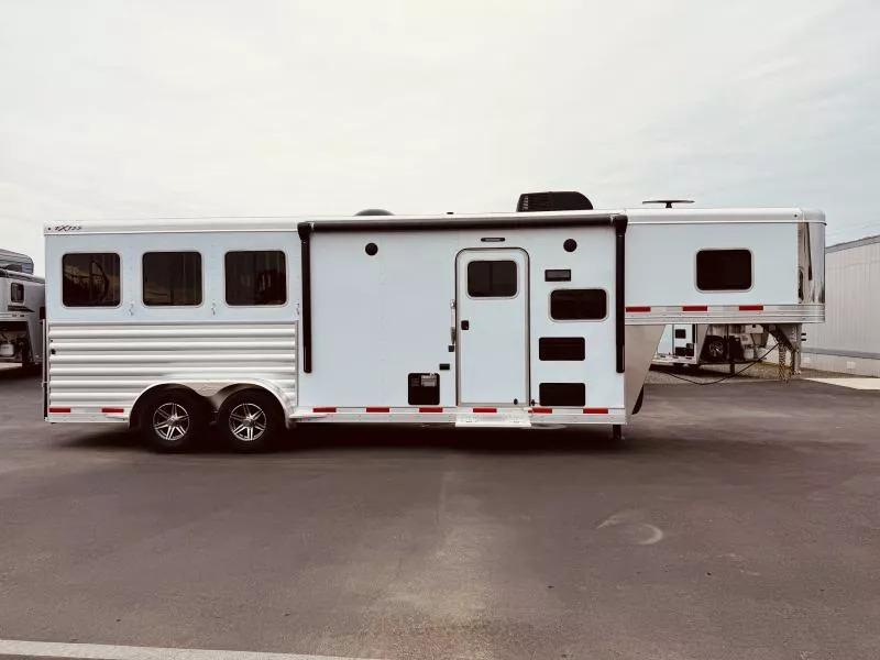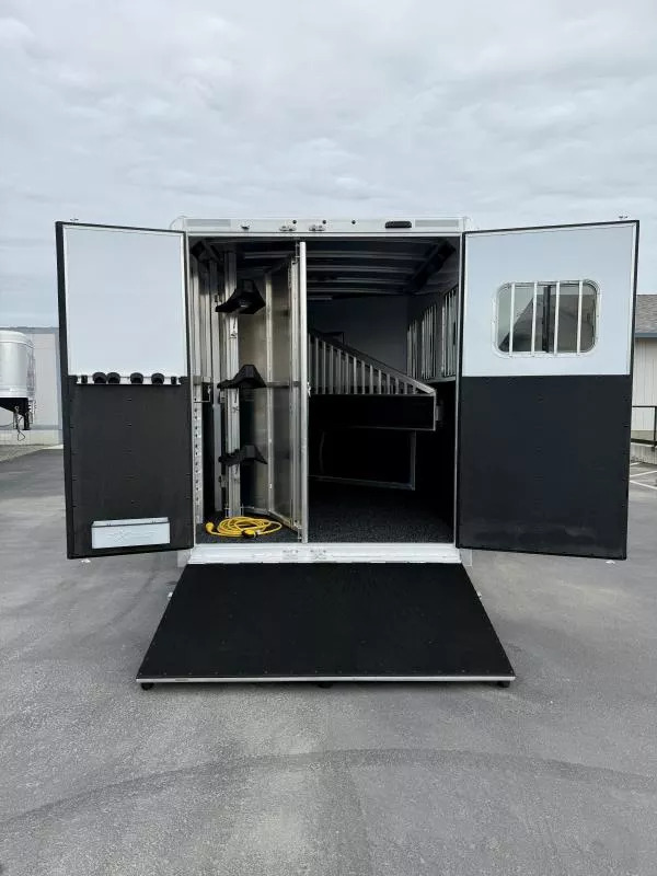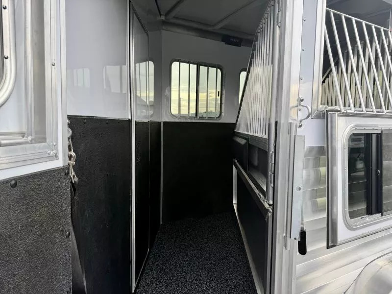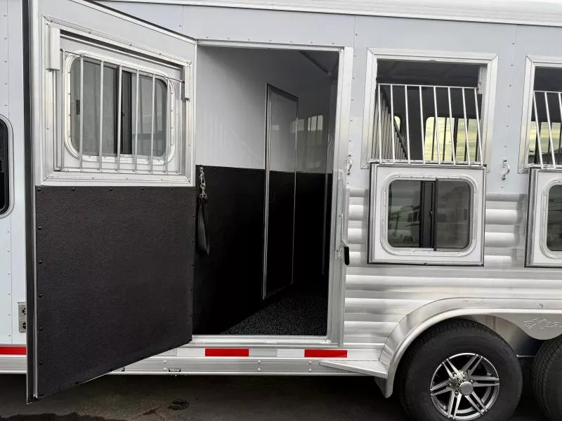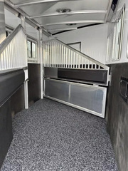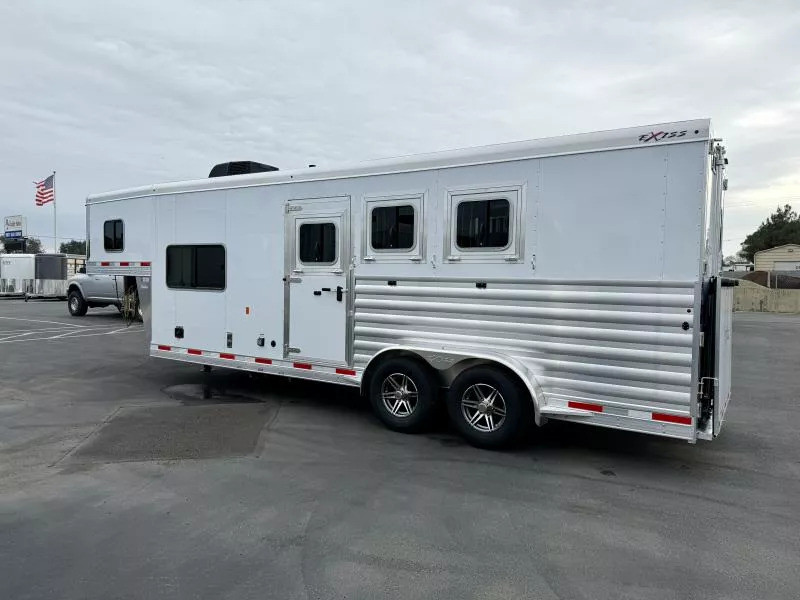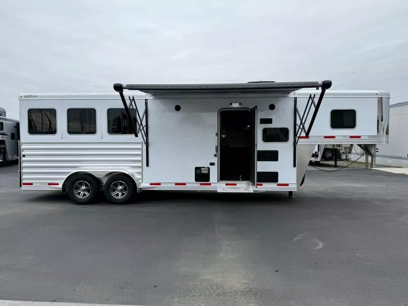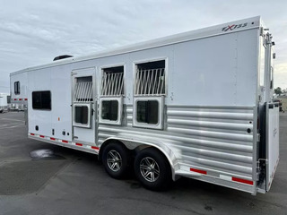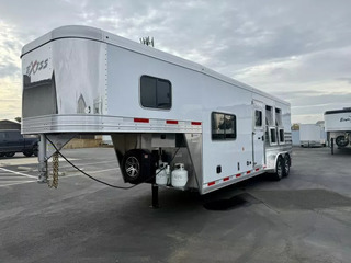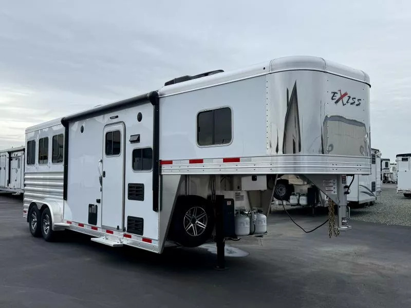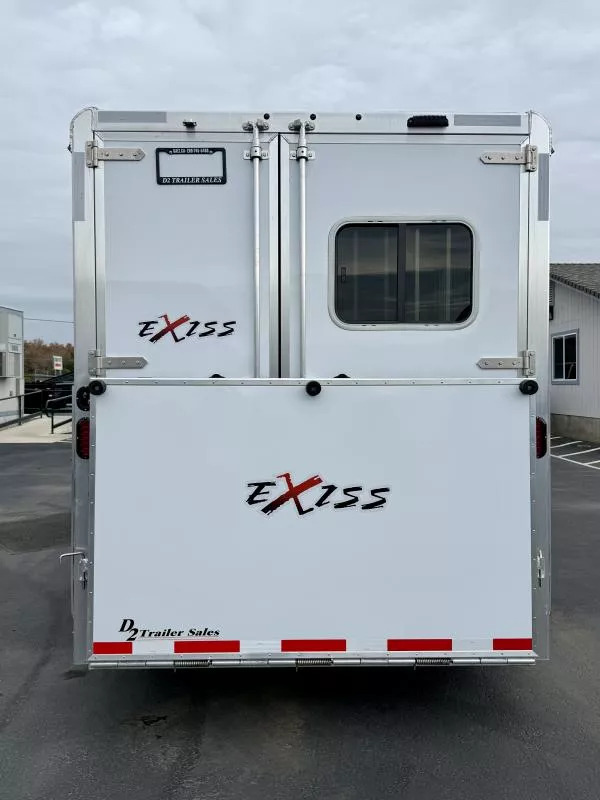 *New Exiss Interior Now Standard with:* *Solid Wood Cabinets* *Convection Oven/Microwave* *Upgraded Igniting Cooktop with One Piece Grate* 2026 Exiss 7308 Escape LQ - 3 Horse Slant Living Quarters Trailer with 8.5’ shortwall LQ Trailer. * 9995# GVWR * 7’ Wide, 7’8” Tall * All Aluminum Construction * (2) 5,200# Torsion Axles with 4 Wheel Electric Brakes * 16” Radial Tires on Aluminum Wheels * LED Brake and Running Lights * Power Awning with LED Light Strip * Hydraulic Jack * LED Load Light above Rear Doors * Dual Propane Tanks * Deep Cycle Battery in Locking Aluminum Battery Box * Extruded Aluminum Slats Horse Area * Stainless Steel Nose * Outside Water Spigot 8.5’ shortwall Brownstone Latte Interior Decor: * Camper Door with Sliding Window * Snap On Cover for Window * Hide-a-Screen Door * Fold Down Camper Step * Solid Wood Cabinets * Crown Molding * Bluetooth Stereo w/ AM/FM/CD with Inside & Outside Speakers * TV Antenna with Booster * 32” Smart TV on Swing Arm * Exterior Satelite Input Jack * Full Sized Foam Plush Mattress * LED Reading Lights in Bunk * Front Wardrobe Closets Middle Storage includes USB Charger * Sconce Lights * Jacknife Sofa with Cup Holders * Large Mirror * Overhead Cabinets * Solid Surface Counter Tops * 3 cu ft Refridgerator * 20k BTU Ducted Furnace * 13,500 BTU A/C with Heat Strip * Recessed Cooktop with Range Hood * Stainless Steel Microwave/ Convection Oven * Undermount Single Sink in Kitchen with Pull Out Sprayer Faucet * Fold Up Counter Extension * Sliding Pocket Door into Bathroom * Shower with Glass Door * Bathroom Vanity Sink with Medicine Cabinet * Sky Dome above Shower * Porcelain Foot Flush Toilet * Closet behind Toilet * Power Lift Roof Vent with 12v Fan * (2) 31 Gallon Waste Water Holding Tanks * 40 Gallon Fresh Water Tank Horse Trailer Features: * Lower Panel Divider first Stall * Escape Door with Drop Feed Door * Lined and Insulated, Kickwalls, 48” High both Sidewalls * Heavy Duty, Air Flow, Aluminum Dividers on a Slam Latches * Stall Pads * (2) Inside Tie Rings and (2) Outside Tie Rings per Stall * Heavy Duty Drop Down Feed Doors with Drop Grills Headside * Large Sliding Windows Buttside * Pop-Up Horse Area Vents * LED Interior Horse Lights * Extruded Aluminum Interlocking Floor * Easy Care Floor Coating * 55/45 Rear Doors with Sliding Window in Load Door * Rear Ramp Fold-Up Rear Tack Wall with: * Removable, Adjustable, 3 Tier Saddle Rack * Halter Hooks * Brush Tray * Blanket Bar Call D2 Trailer Sales 209-745-5480 or for more info www.d2trailersales.com
