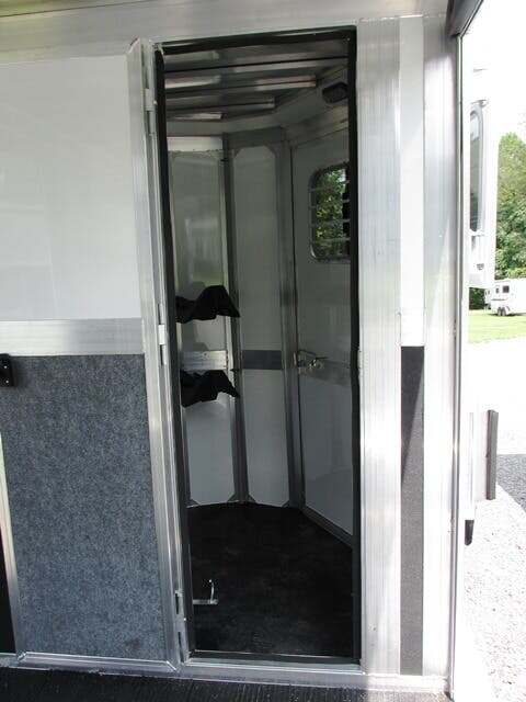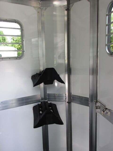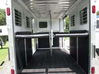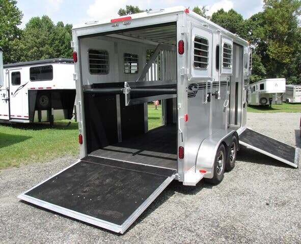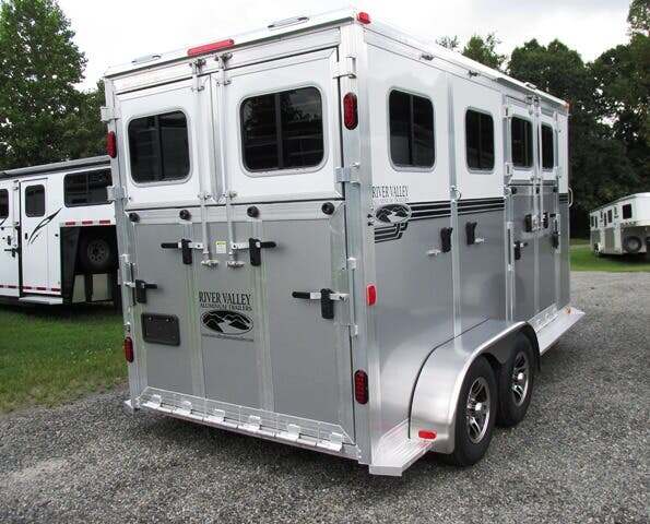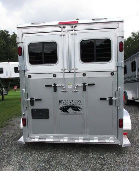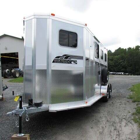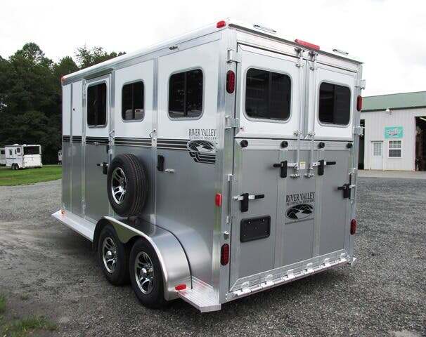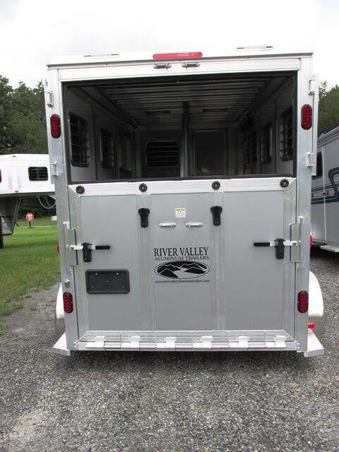 2026 River Valley 2H BP w/Dress and Side Ramp, 7’6”x6’8”, White Top/Silver Bottom, Shelby Flooring, 60” Side Ramp w/ Loading Light, Outside Ties, Spare Tire on Outside Mount, Rear Ramp w/ Curtain Doors, Windows in Curtain Doors, (2) Interior Lights at Rear Ramp, Roof Vents Over Each Stall, 90” Breast to Butt Bar, 1 Escape Door, Pass Through Door to Dress, Removable Partitions, Tubular Head and Shoulder Dividers, Window in Dress Wall, Washable Flooring in Dress, (6) Bridle Hooks, (2) Saddle Racks, Brush Box, Interior Light at Dress Door, GVWR 7000, Empty 3890, Carry 3110