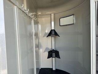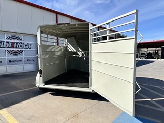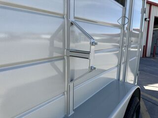 12’ x 6’ (Width) x 6’ 6 in (Height) 2 Horse Slant Load Trailer 2 x 3,500 lb. Torsion Axles (Upgraded to 6 Lug) Brakes on Rear Axle Slant Dressing Room 14 in x 21 in Window in Dressing Room RV Latch on Door 2 in Bulldog Coupler 1 Divider 1 Piece Rear Gate 54 in Solid Sides / 18 in Air Gap Full Rear Gate 2K Top Wind Jack 2 Removable Saddle Racks Escape Door ST 235 80 R 16 in Super Tires Mats on Floor Including Dressing Room 2 Dome Lights Spare Tire Mount (Mount Only) Smooth Fenders Empty Weight: 2,420 lbs. GVWR: 7,000 lbs. Carrying Capacity: 4,580 lbs.