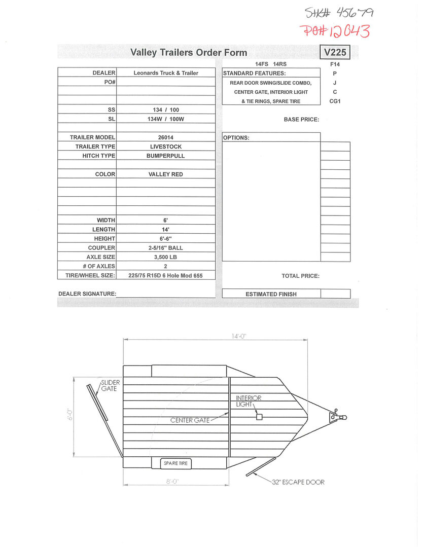 View Inventory: https://leonardtrailers.com/inventory/45679 Stock# 45679 New 2026 Valley 26014 Bumper Pull Stock Trailer Built from the ground up to take on all kinds of abuse from rough roads, terrain, and restless livestock, Valley Trailers provide a high quality livestock trailer at a competitive price. Valley Stock trailers come with safety features installed throughout the the entire trailer; peace of mind for the owner and livestock. With many options and configurations available with the Valley Stock trailers, there are many possibilities. Model:26014 Warranty: 3yr- Structural 1yr-Components Trailer Information: Trailer Model: 26014 Trailer Type: Livestock Hitch Type: Bumper pull Color: Mirror Black Width: 6’ Length: 14’ Height: 6’ 6” Coupler: 2-5/16” Ball Axle Size: 3,500 lb Number of Axles: 2 Tire/Wheel Size: 225/75 R15D 6 Hole Mod 655 Standard Features: Slider Gate  Center Gate Interior light 32” Escape Door Spare tire We offer outstanding financing options, accept trades, and can arrange nationwide NO HASSLE delivery! Inquire today for more information! (888) 333-6613 **We believe these specifications to be accurate. Any discrepancies are unintentional. Please verify information with a sales associate prior to purchase.** Stock Number:45679