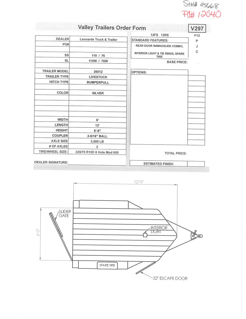 View Inventory: https://leonardtrailers.com/inventory/45668 Stock# 45668 New 2026 Valley 26012 Bumper Pull Stock Trailer Built from the ground up to take on all kinds of abuse from rough roads, terrain, and restless livestock, Valley Trailers provide a high quality livestock trailer at a competitive price. Valley Stock trailers come with safety features installed throughout the the entire trailer; peace of mind for the owner and livestock. With many options and configurations available with the Valley Stock trailers, there are many possibilities. Model:26012 Warranty: 3yr- Structural 1yr-Components Trailer Information: Trailer Model: 2016 Trailer Type: Stock Hitch Type: Bumper pull Color: Valley Blue Width: 6’  Length: 12’ Height: 6’ 6” Coupler: 2-5/16” Ball Axle Size: 3,500 lb Number of Axles: 2 Tire/Wheel Size: 225/75 R15D 6 Hole Mod 655 Standard Features: Slider Gate   Interior light 32” Escape Door  Spare tire We offer outstanding financing options, accept trades, and can arrange nationwide NO HASSLE delivery! Inquire today for more information! (888) 333-6613 **We believe these specifications to be accurate. Any discrepancies are unintentional. Please verify information with a sales associate prior to purchase.** Stock Number:45668