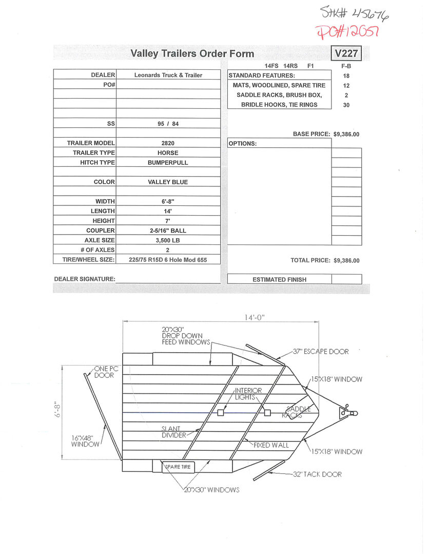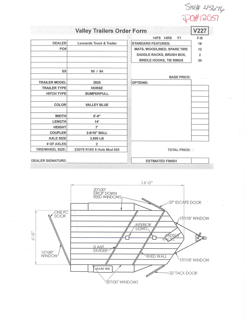 View Inventory: https://leonardtrailers.com/inventory/45676 Stock# 45676 New 2026 Valley 2820 Bumper Pull Horse Trailer A Valley Horse trailer comes standard configured as a 7’ high inside height, slant load horse trailer. Valley Horse trailers come with safety features installed throughout the the entire trailer; peace of mind for the owner and horses. Many options are available for Valley Horse trailers, making your ownership experience as smooth as possible.” Model:2820 Warranty: 3yr- Structural 1yr-Components Trailer Details Trailer Model: 2820 Trailer Type: Horse Hitch Type: Bumperpull Color: Valley Red Width: 6’-8” Length: 14’ Height: 7’ Coupler: 2-5/16” Ball Axle Size: 3,500 lb # of Axles: 2 Tire/Wheel Size: 225/75 R15D 6 Hole Silver Mod 655 Standard Features Mats Woodlined Spare Tire Saddle Racks Brush Box Bridle Hooks Tie Rings   We offer outstanding financing options, accept trades, and can arrange nationwide NO HASSLE delivery! Inquire today for more information! (888) 333-6613 **We believe these specifications to be accurate. Any discrepancies are unintentional. Please verify information with a sales associate prior to purchase.** Stock Number:45676