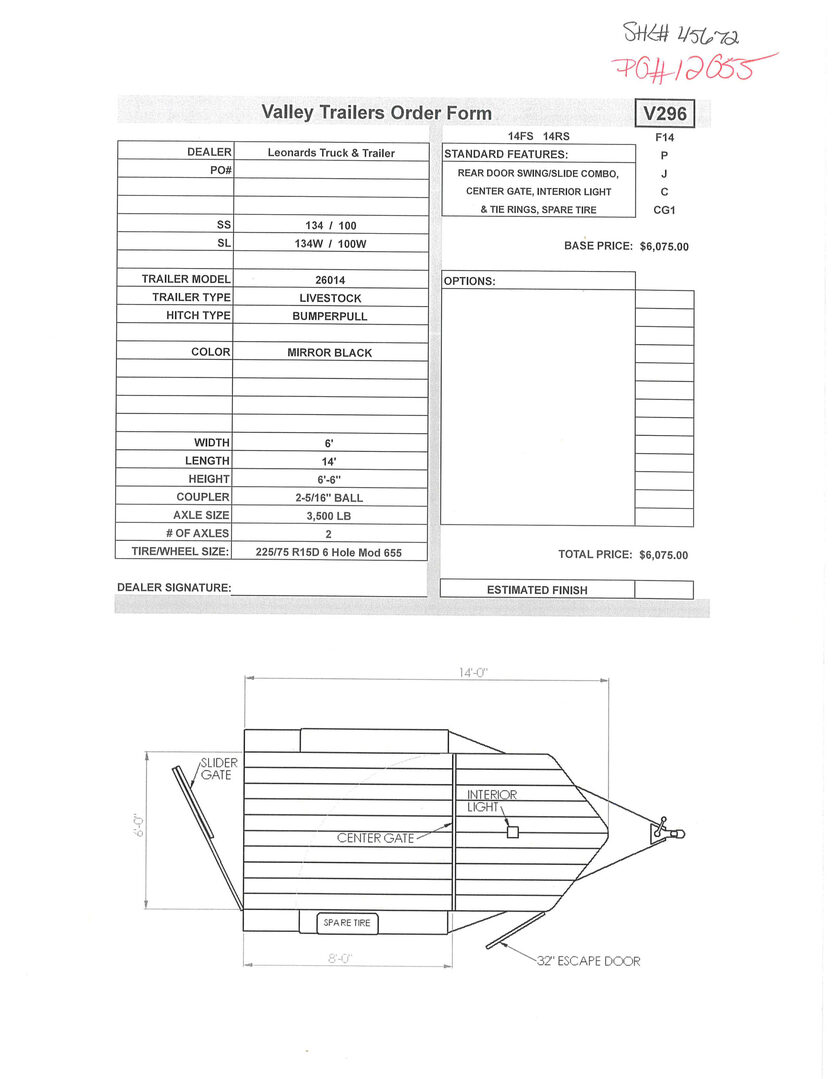 View Inventory: https://leonardtrailers.com/inventory/45672 Stock# 45672 New 2026 Valley 26014 Bumper Pull Stock Trailer Built from the ground up to take on all kinds of abuse from rough roads, terrain, and restless livestock, Valley Trailers provide a high quality livestock trailer at a competitive price. Valley Stock trailers come with safety features installed throughout the the entire trailer; peace of mind for the owner and livestock. With many options and configurations available with the Valley Stock trailers, there are many possibilities. Model:26014 Warranty: 3yr- Structural 1yr-Components Trailer Information: Trailer Model: 26014 Trailer Type: Livestock Hitch Type: Bumper pull Color: Mirror Black Width: 6’ Length: 14’ Height: 6’ 6” Coupler: 2-5/16” Ball Axle Size: 3,500 lb Number of Axles: 2 Tire/Wheel Size: 225/75 R15D 6 Hole Mod 655 Standard Features: Slider Gate  Center Gate Interior light 32” Escape Door Spare tire We offer outstanding financing options, accept trades, and can arrange nationwide NO HASSLE delivery! Inquire today for more information! (888) 333-6613 **We believe these specifications to be accurate. Any discrepancies are unintentional. Please verify information with a sales associate prior to purchase.** Stock Number:45672