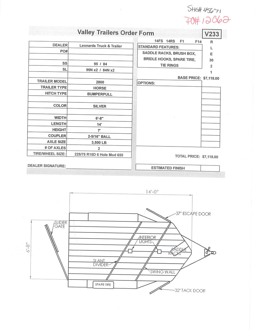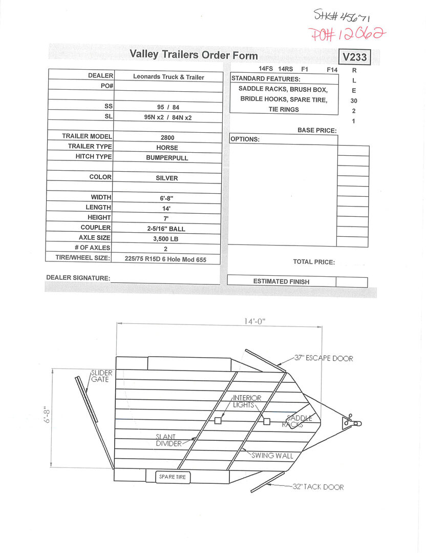 View Inventory: https://leonardtrailers.com/inventory/45671 Stock# 45671 New 2026 Valley 2800 Bumper Pull 2 Horse Trailer Built from the ground up to take on all kinds of abuse from rough roads, terrain, and restless livestock, Valley Trailers provide a high quality livestock trailer at a competitive price. Valley Stock trailers come with safety features installed throughout the the entire trailer; peace of mind for the owner and livestock. With many options and configurations available with the Valley Stock trailers, there are many possibilities. Model:2800 Warranty: 3yr- Structural 1yr-Components Trailer Information: Trailer Model: 2800 Trailer Type: Horse Hitch Type: Bumper pull Color: Valley Red Width: 6’ 8” Length: 14’ Height: 7’ Coupler: 2-5/16” Ball Axle Size: 3,500 lb Number of Axles: 2 Tire/Wheel Size: 225/75 R15D 6 Hole Mod 655 Standard Features: Slider Gate  Slant Divider   2 Interior lights 37” Escape Door drivers side 32” Escape Door passenger side  Saddle racks  Spare tire We offer outstanding financing options, accept trades, and can arrange nationwide NO HASSLE delivery! Inquire today for more information! (888) 333-6613 **We believe these specifications to be accurate. Any discrepancies are unintentional. Please verify information with a sales associate prior to purchase.** Stock Number:45671