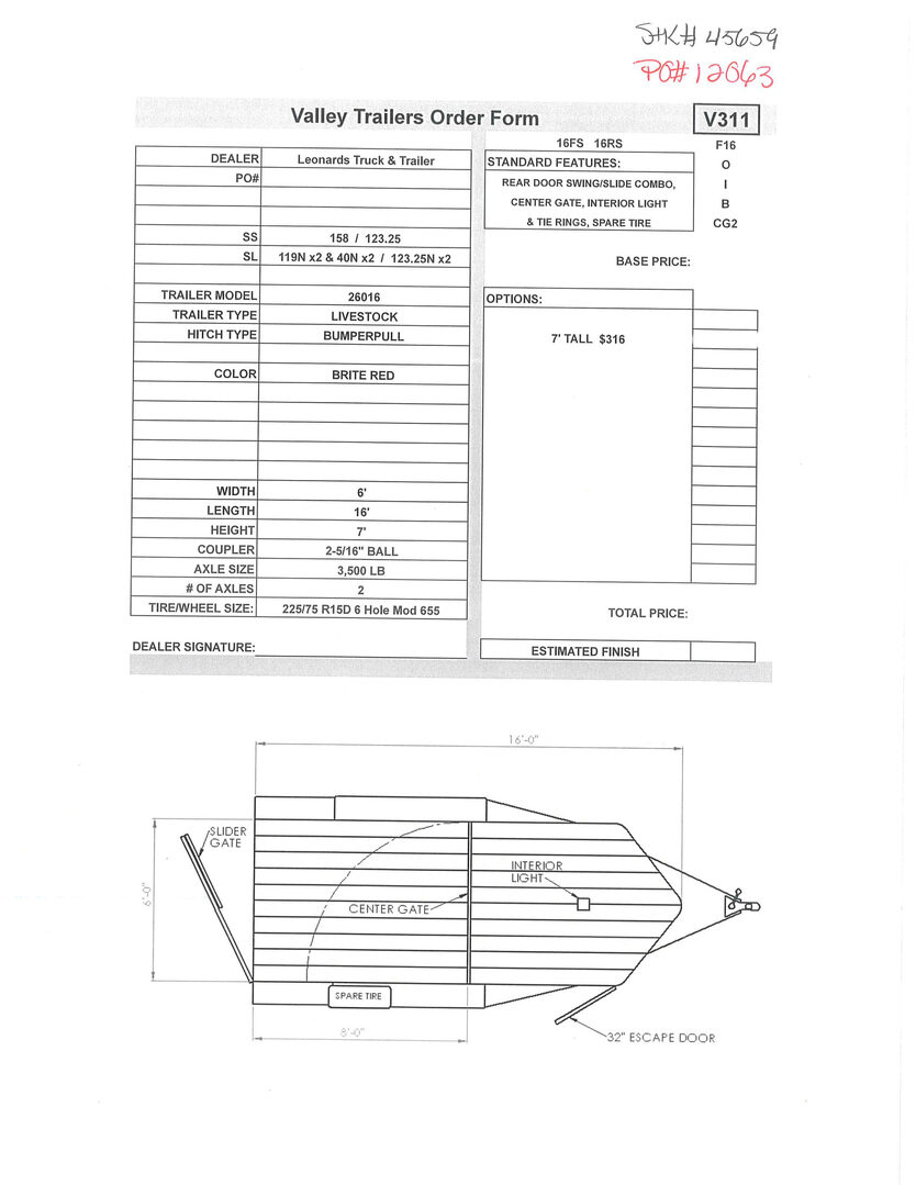 View Inventory: https://leonardtrailers.com/inventory/45659 Stock# 4659 New 2026 Valley 26016 Bumper Pull Stock Trailer Built from the ground up to take on all kinds of abuse from rough roads, terrain, and restless livestock, Valley Trailers provide a high quality livestock trailer at a competitive price. Valley Stock trailers come with safety features installed throughout the the entire trailer; peace of mind for the owner and livestock. With many options and configurations available with the Valley Stock trailers, there are many possibilities. Model:26016 Warranty: 3yr- Structural 1yr-Components Trailer Information Trailer Model: 26016 Trailer Type: Livestock Hitch Type: Bumperpull Color: Silver Width: 6’ Length: 16’ Height: 6’-6” Coupler: 2-5/16” Ball Axle Size: 3,500 lb # of Axles: 2 Tire/Wheel Size: 225/75 R15D 6 Hole Silver Mod 655 Standard Features Rear door swing/slide combo Center gate Interior light Tie rings Spare tire   We offer outstanding financing options, accept trades, and can arrange nationwide NO HASSLE delivery! Inquire today for more information! (888) 333-6613 **We believe these specifications to be accurate. Any discrepancies are unintentional. Please verify information with a sales associate prior to purchase.** Stock Number:45659