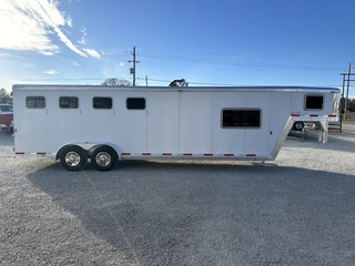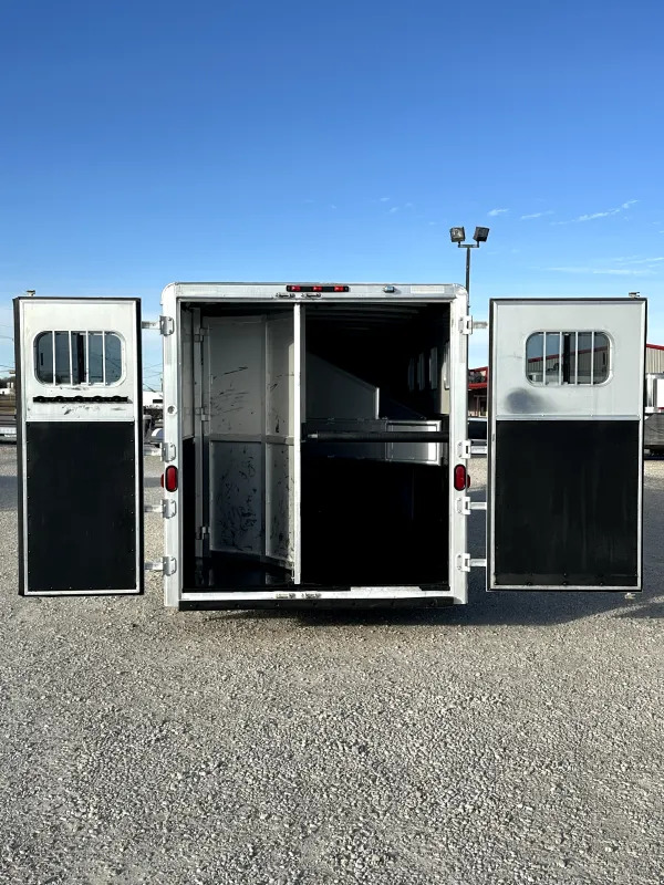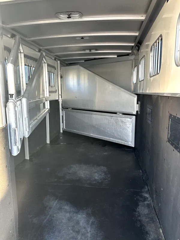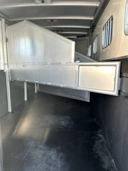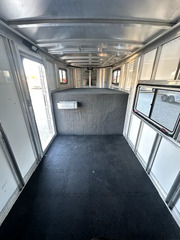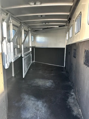 Horse Area - rubber mats, kick pads, lined and insulated walls, 3 drop down windows w/ folding faceguards (head), sliding bus windows (hip), 3 spring loaded solid dividers w/ slam latches, rear telescopic divider, 1 stud divider, 2 tie rings per stall, 4 pop up roof vents, 2 interior load lights, escape door, padded chest and butt bars, d-rings for nylon manger bags, folding and removeable rear tack w/ extra location for saddle rack, 5 bridle hooks, 1 interior rear tack light.